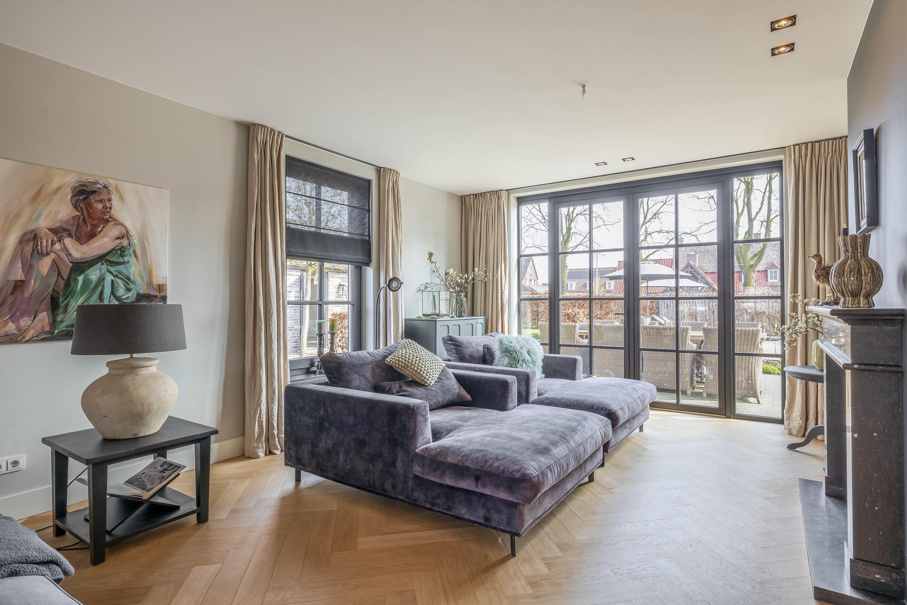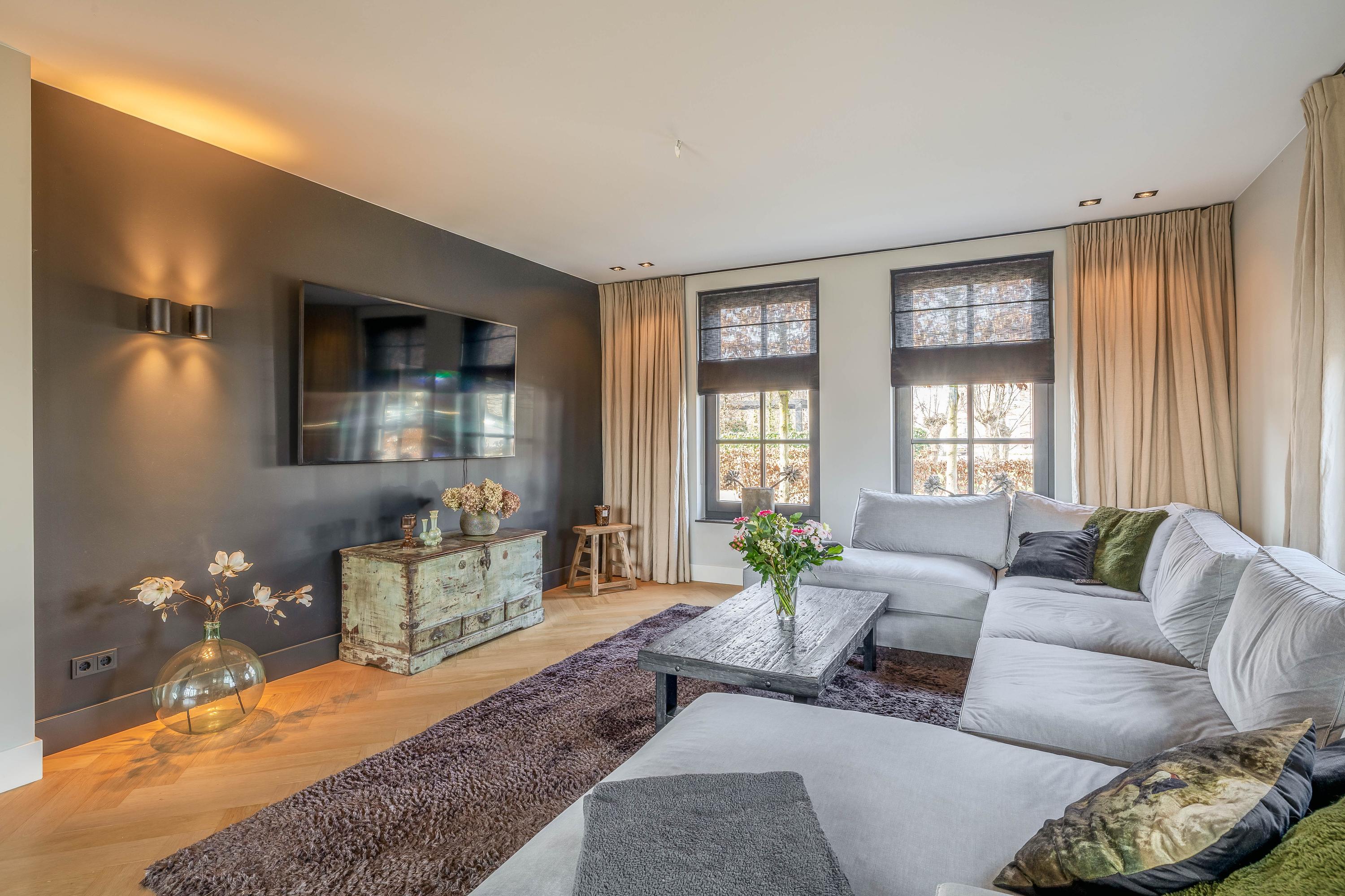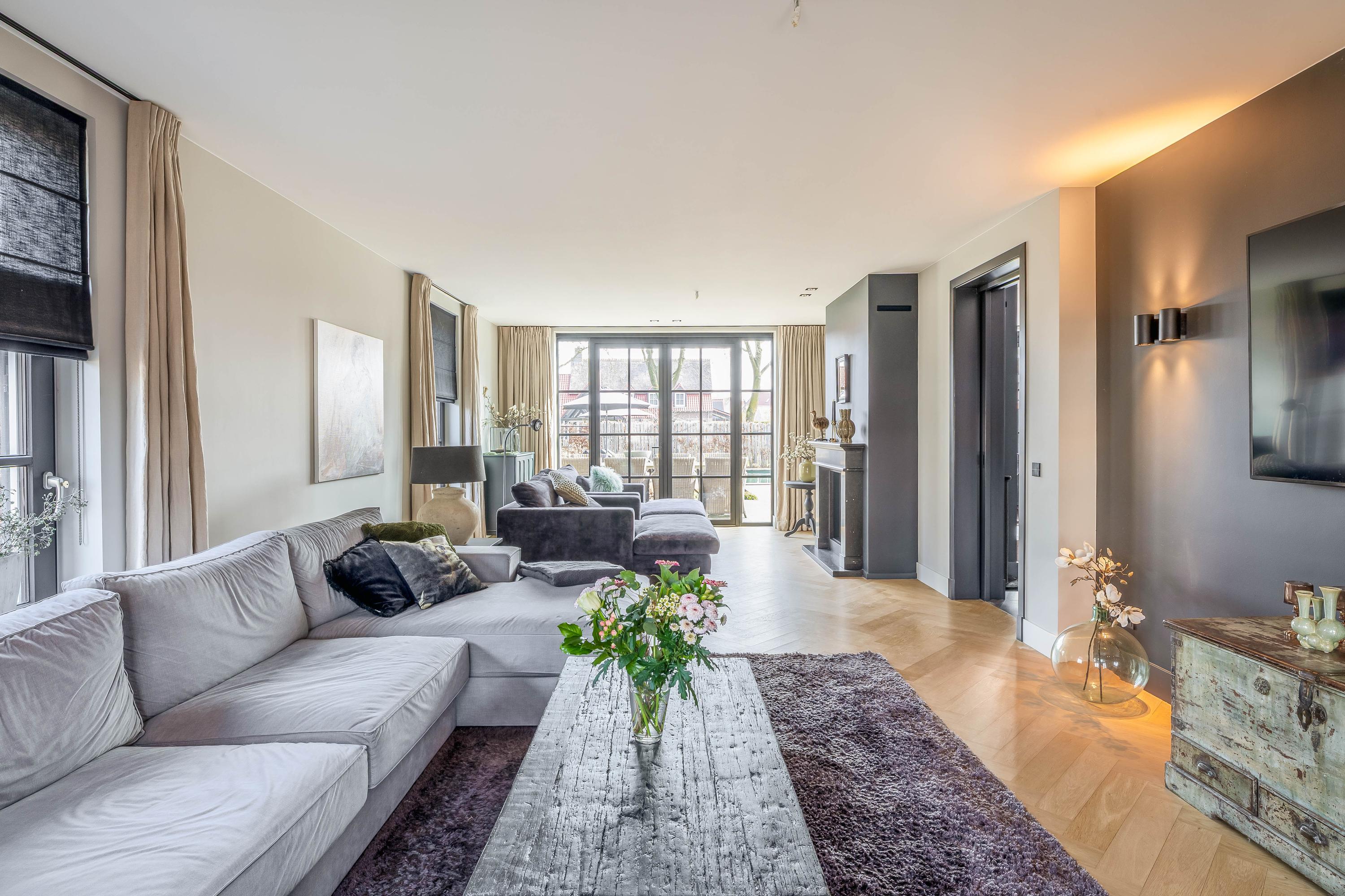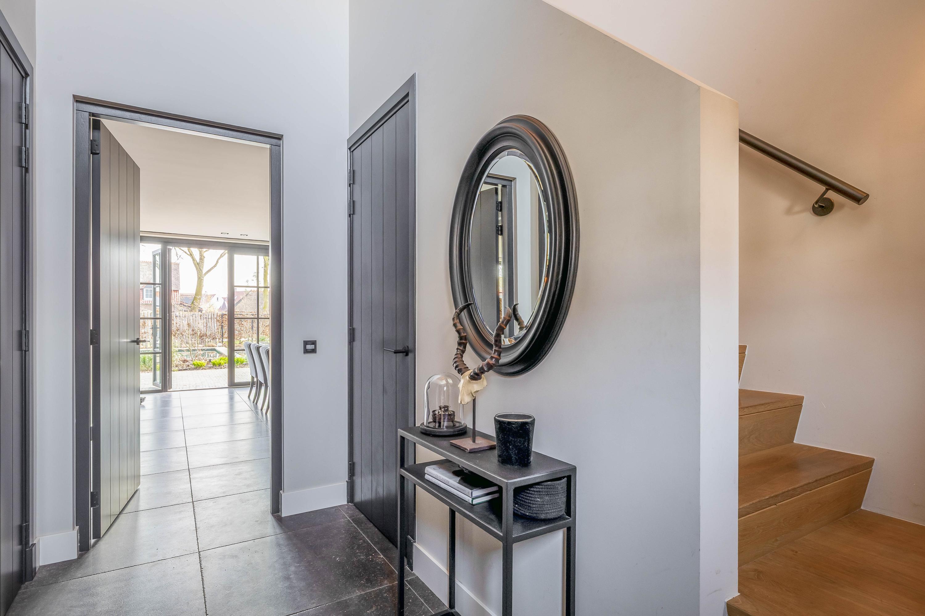 Through the entrance, you reach a hall that provides access to a storage cupboard beneath the staircase, the fuse box, a wardrobe cupboard, and a staircase leading to the first floor. The expansive living room, complete with a gas fireplace and large windows, forms the heart of the ground floor. From the living room, garden doors lead directly to the enchanting rear garden, where the terrace offers a perfect seamless connection between indoor and outdoor living. The spacious kitchen/dining room, equipped with a corner layout, an island, and high-end built-in appliances (such as a Quooker, dishwasher, exclusive cooking unit, oven, and extractor hood), allows you to enjoy culinary experiences at the highest level. A side entrance with a generous vestibule features a toilet, storage area, and practical built-in cabinets, with direct access to the garden via a service door.