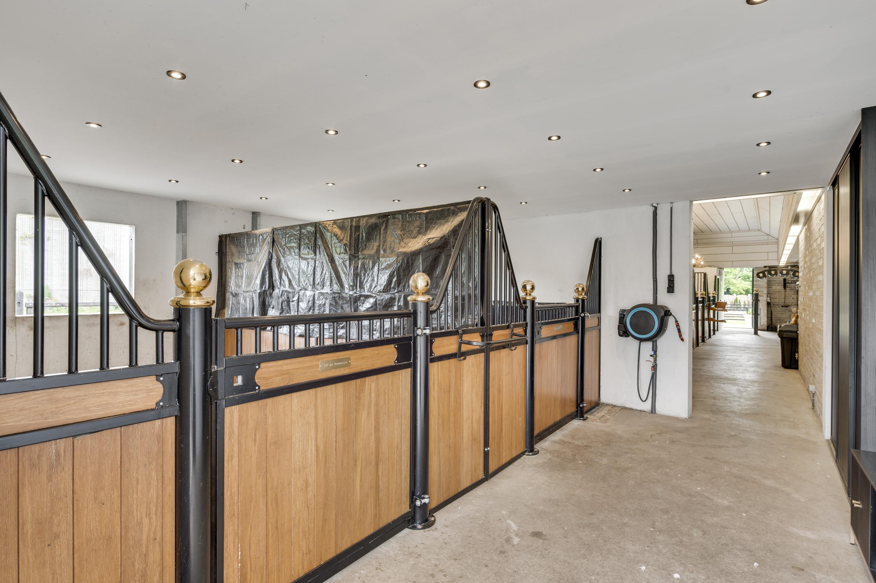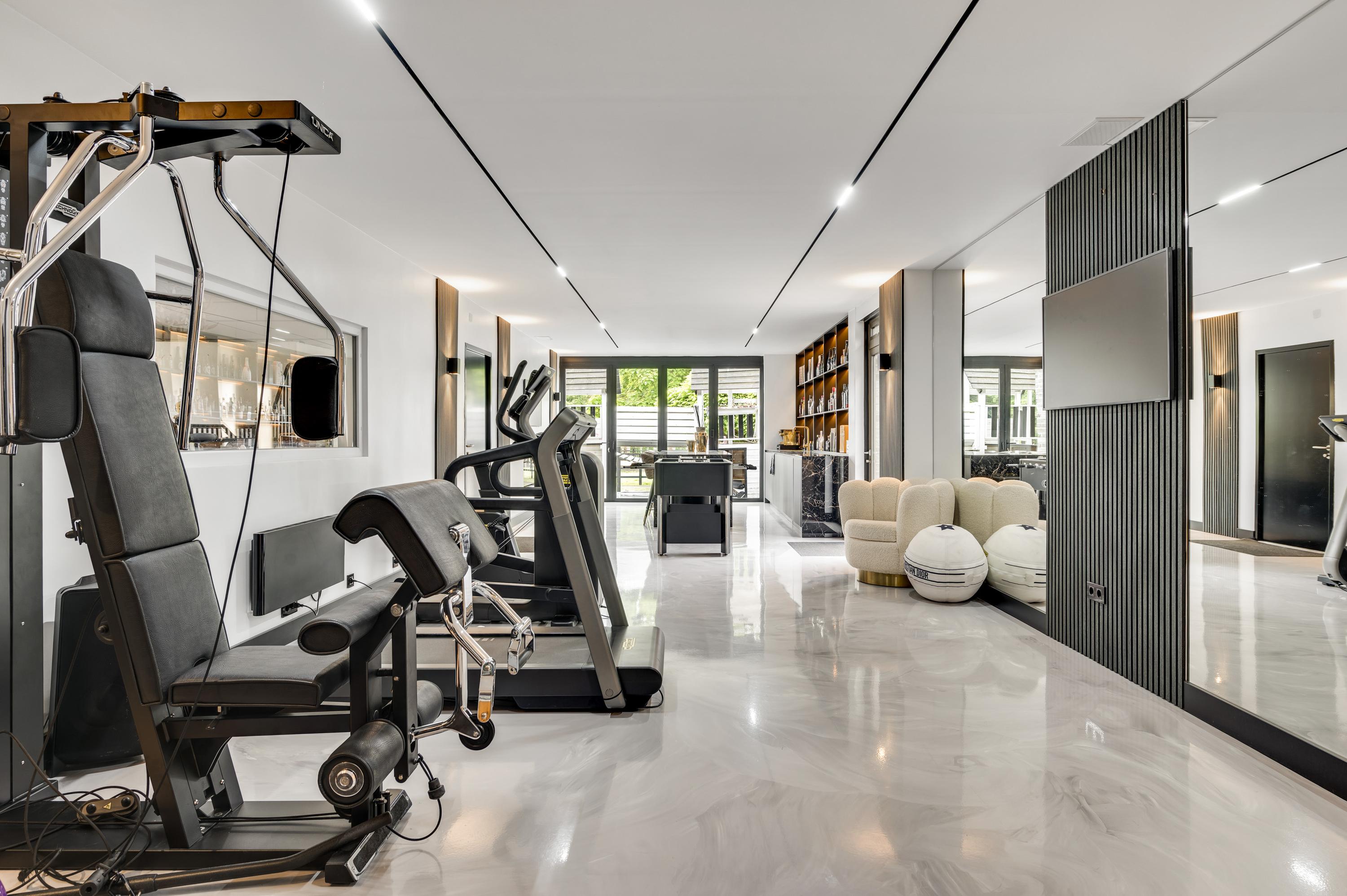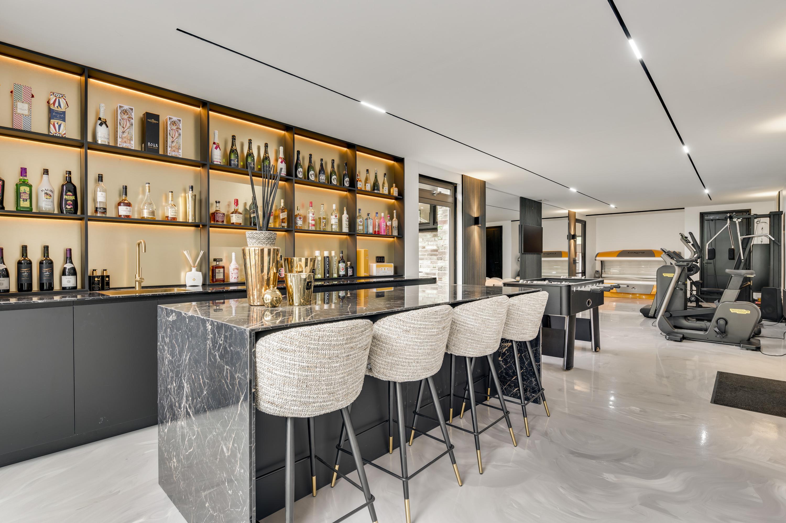 One of the home’s standout features is the lounge bar with fitness area, which opens onto the garden and the stables. For those not involved with horses, this space can easily be transformed into a wellness area, indoor pool, or creative studio.
