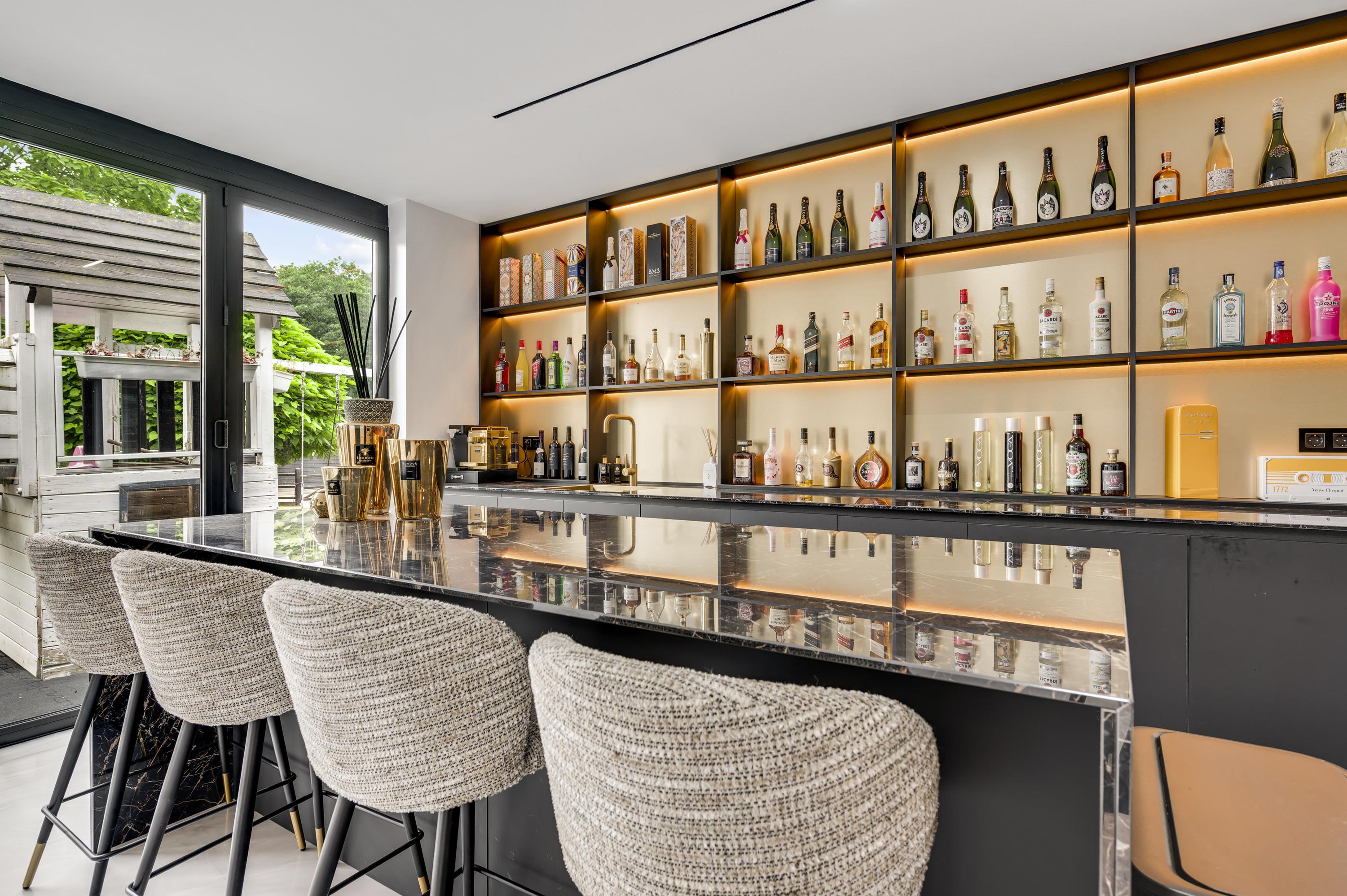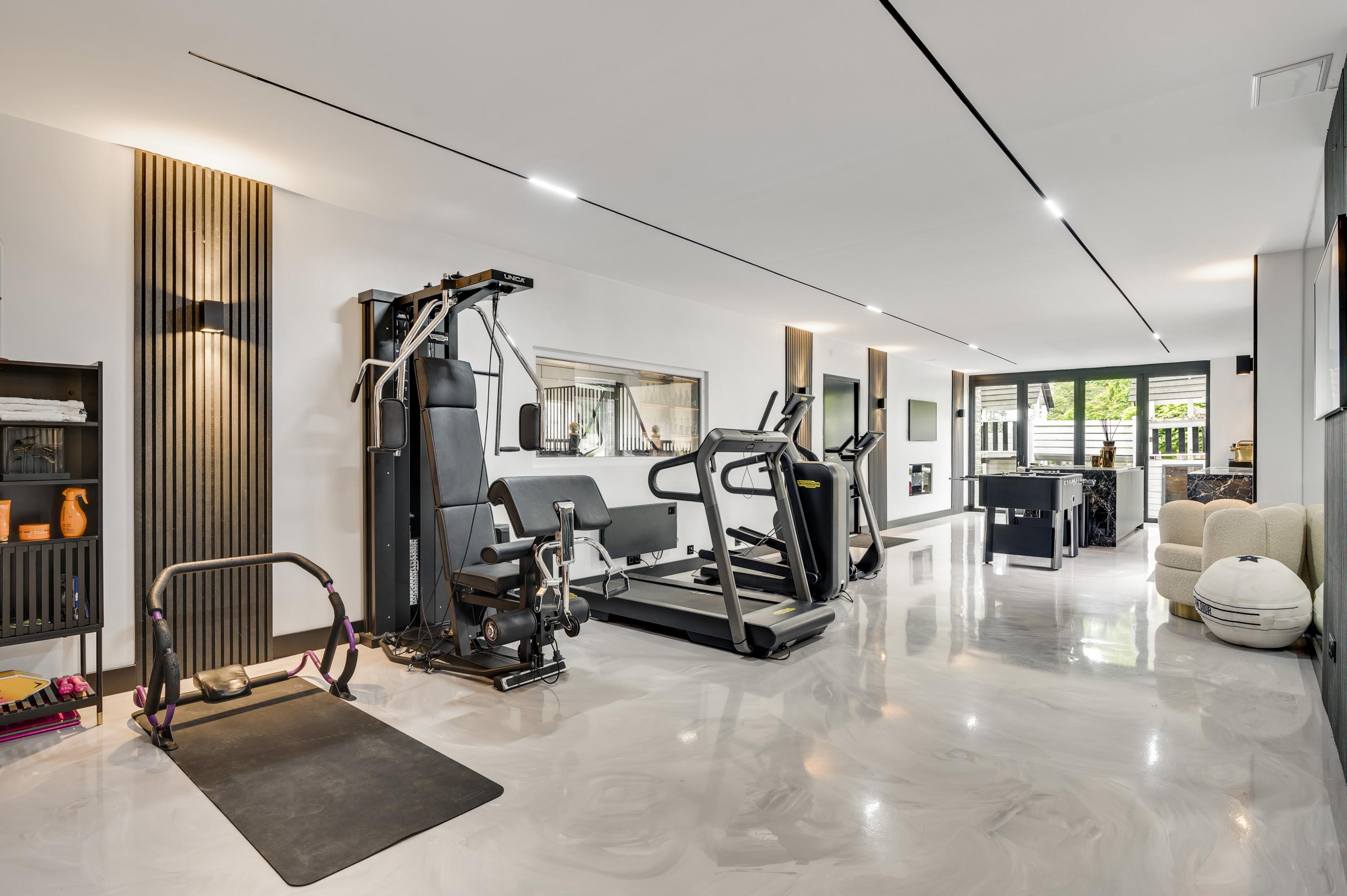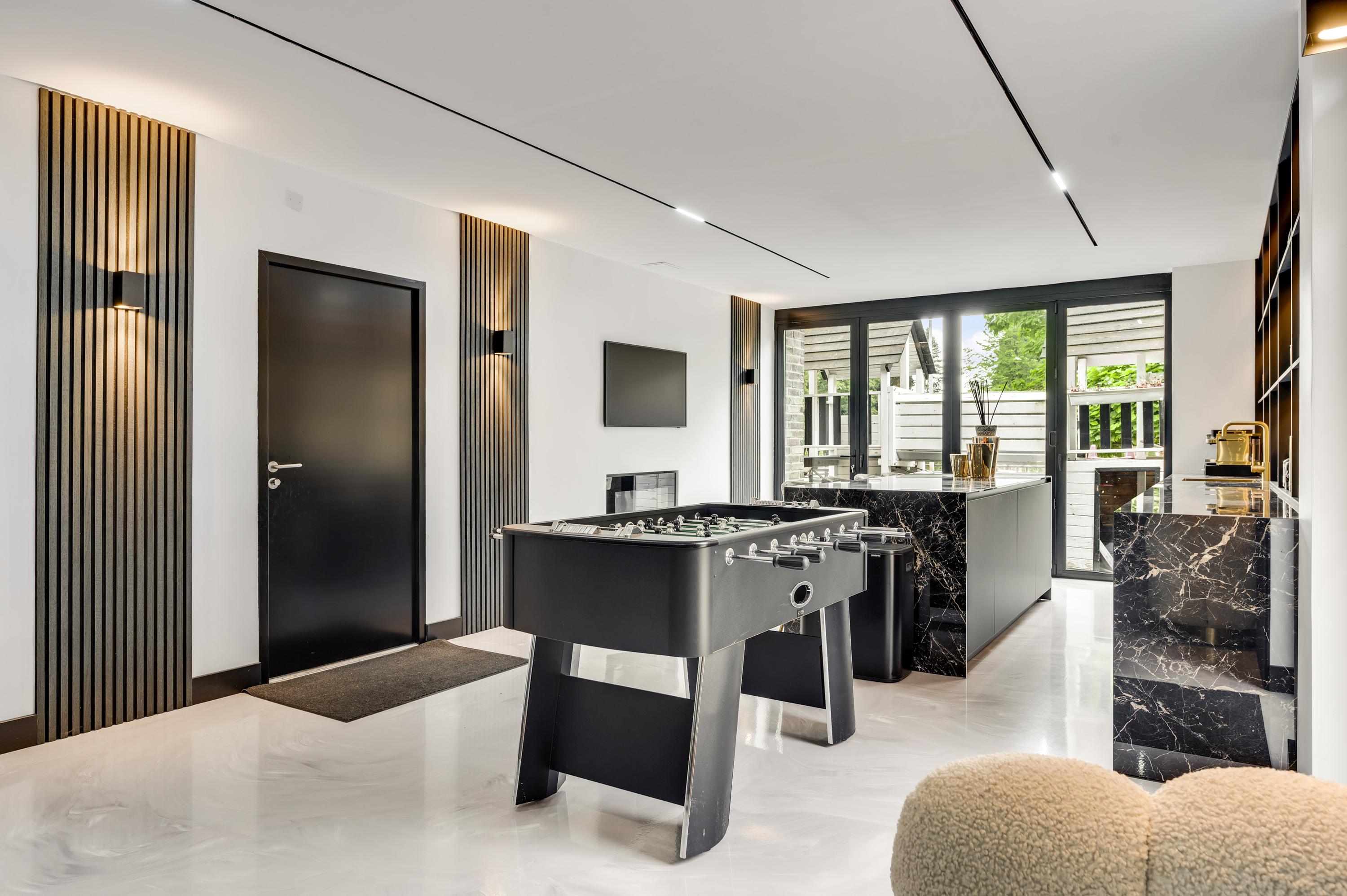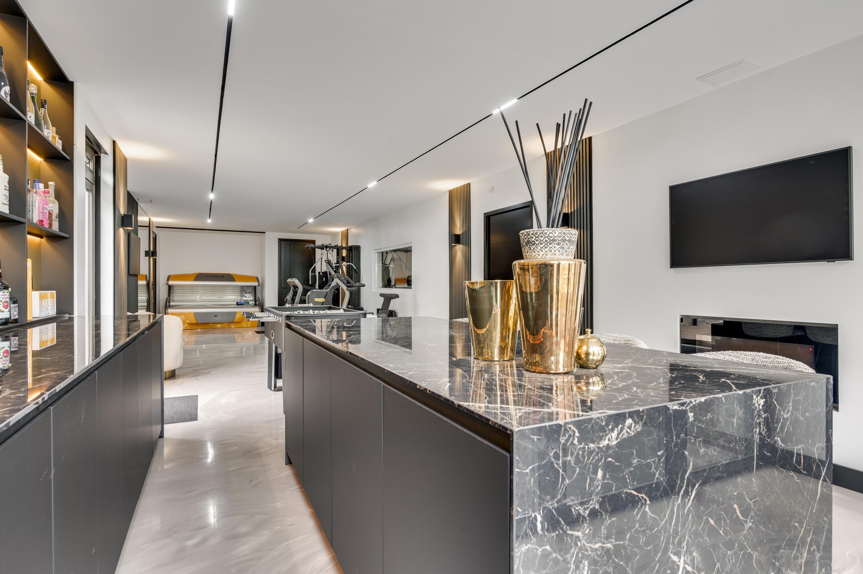 One of the home’s standout features is the lounge bar with fitness area, which opens onto the garden and the stables. For those not involved with horses, this space can easily be transformed into a wellness area, indoor pool, or creative studio.