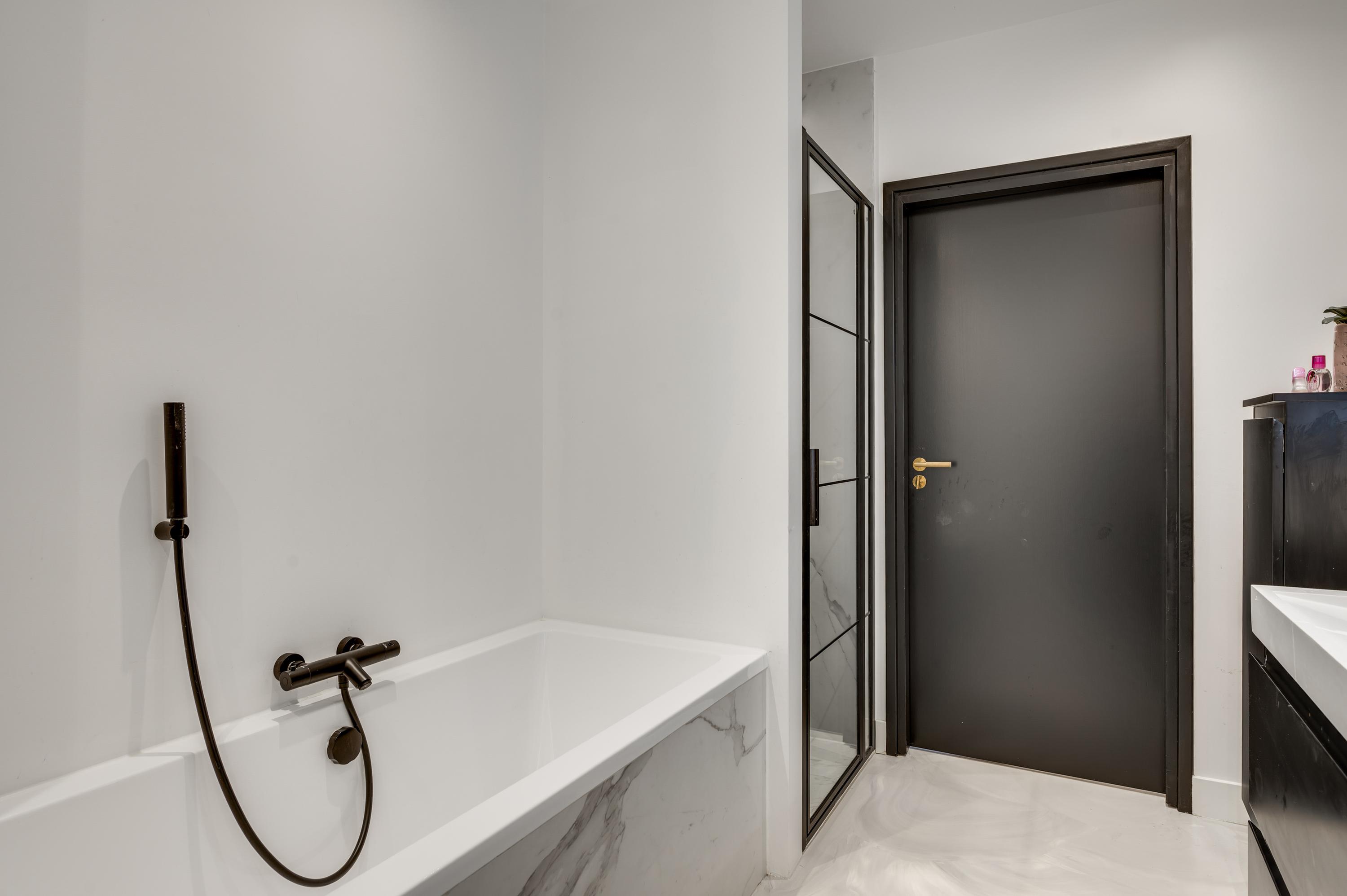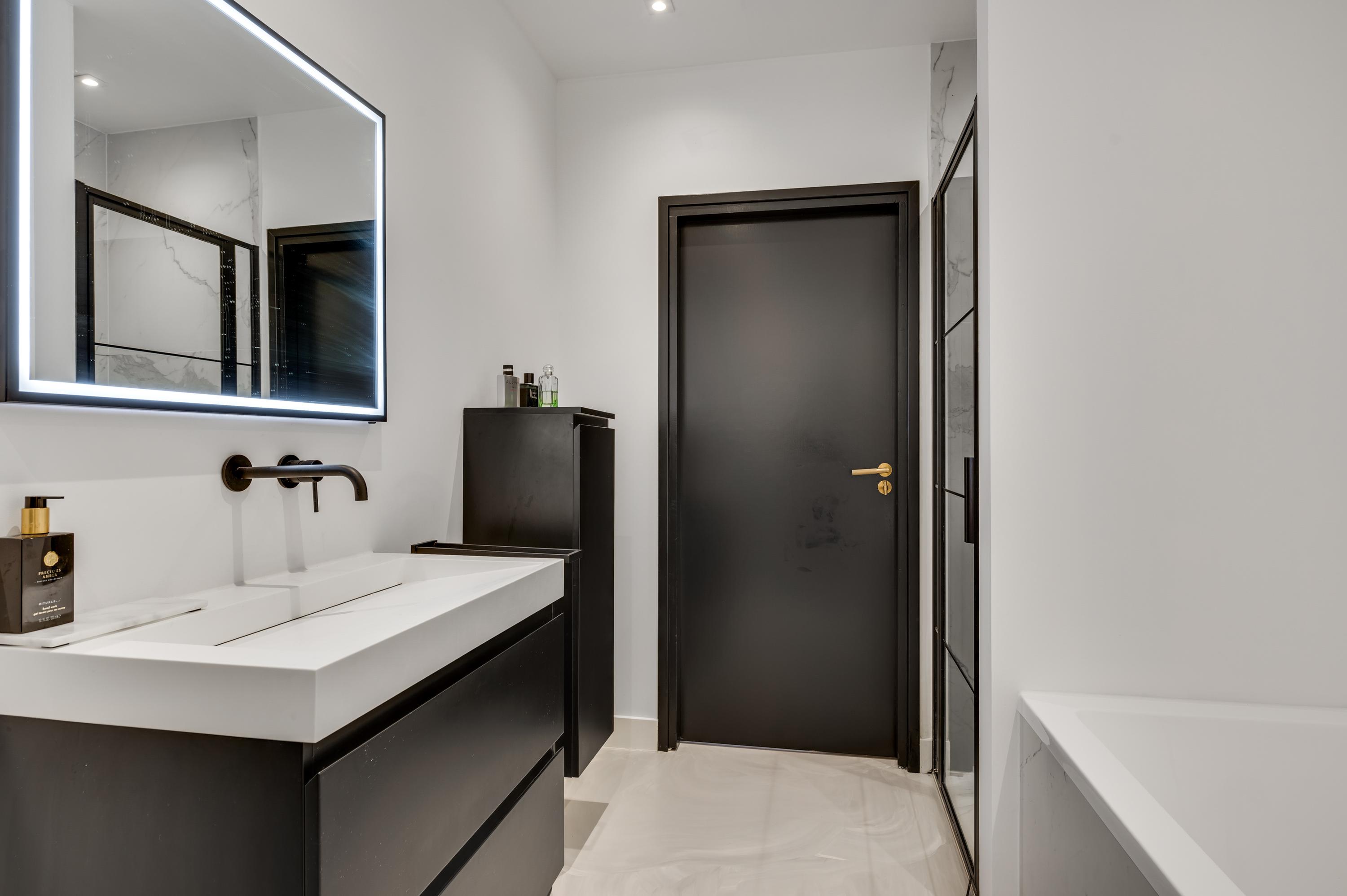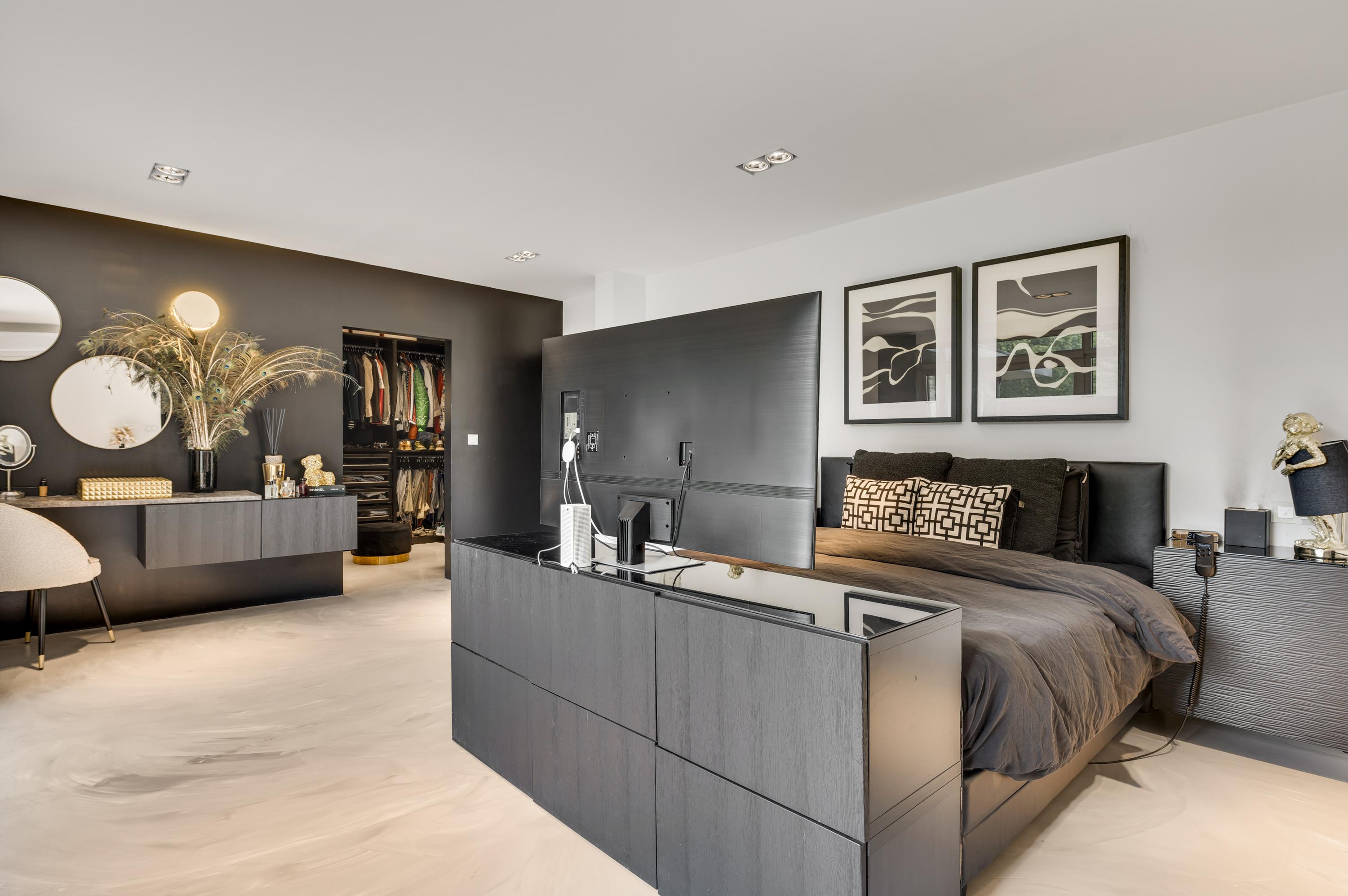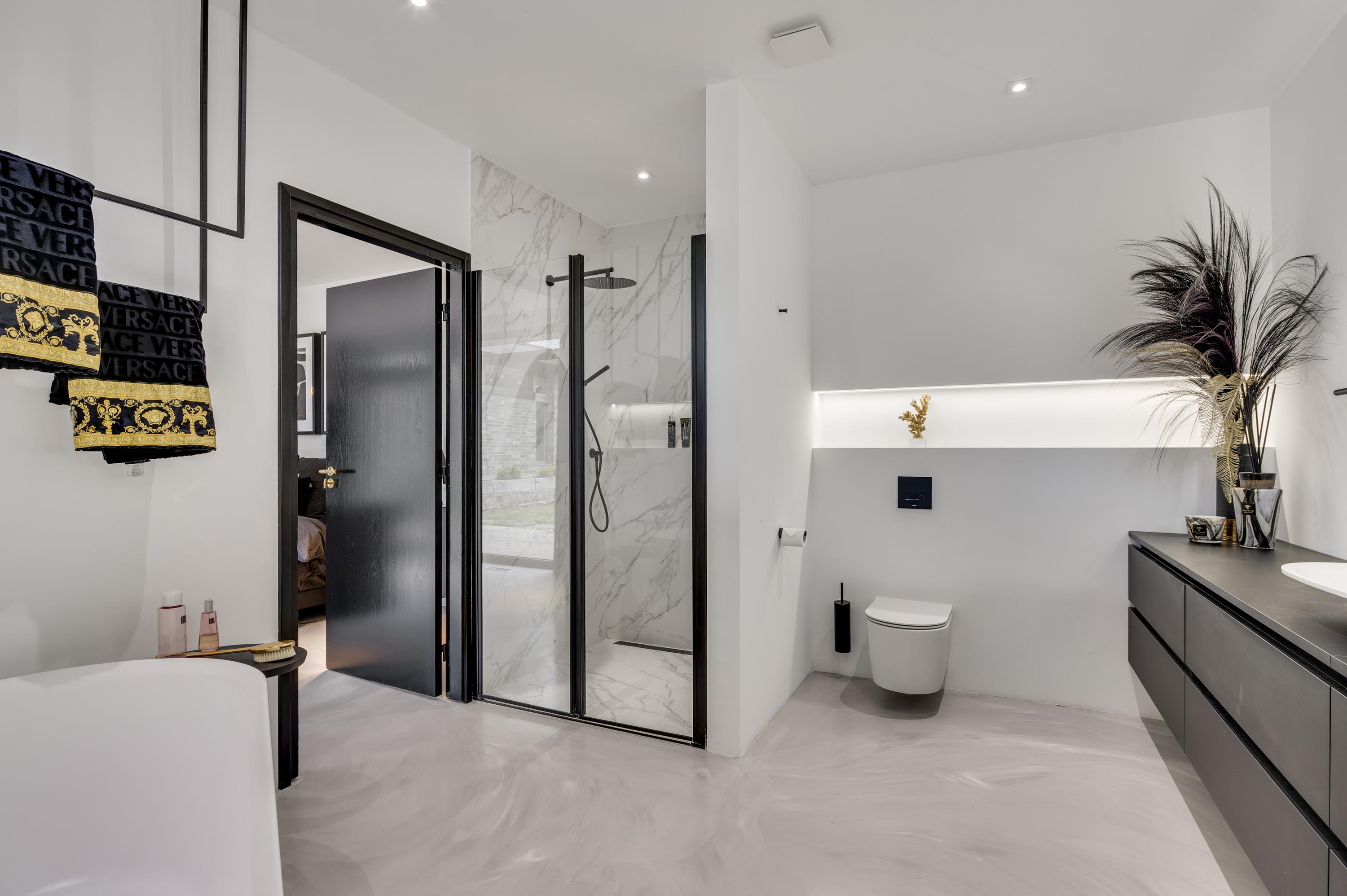 The east wing is entirely dedicated to the sleeping quarters. Here you’ll find five bedrooms, including a generous master suite with a walk-in wardrobe, luxurious en-suite bathroom, and direct access to a covered terrace overlooking the garden. The remaining four bedrooms share two stylish bathrooms, each featuring a bathtub, walk-in shower, double washbasin, and wall-mounted toilet.