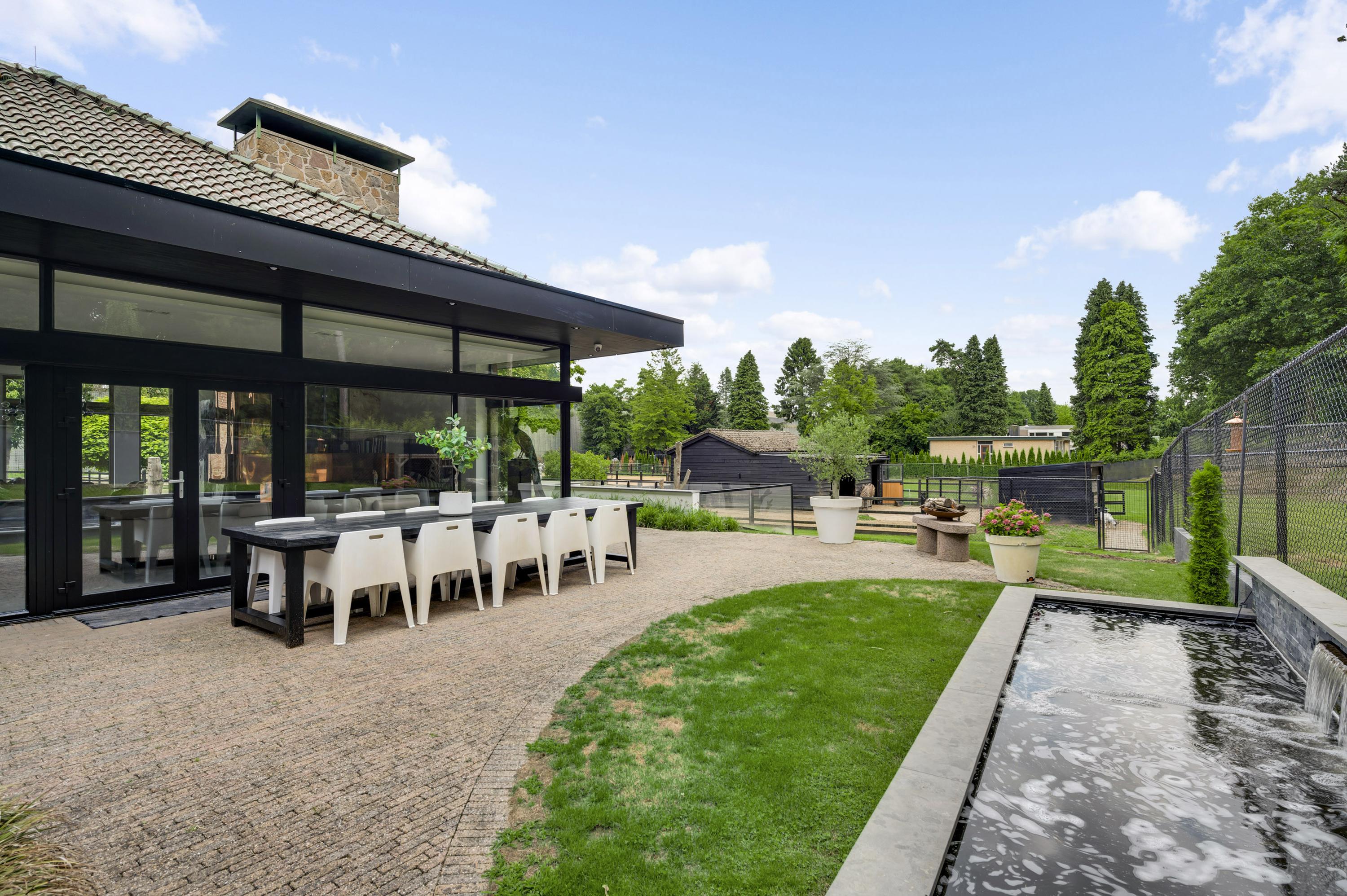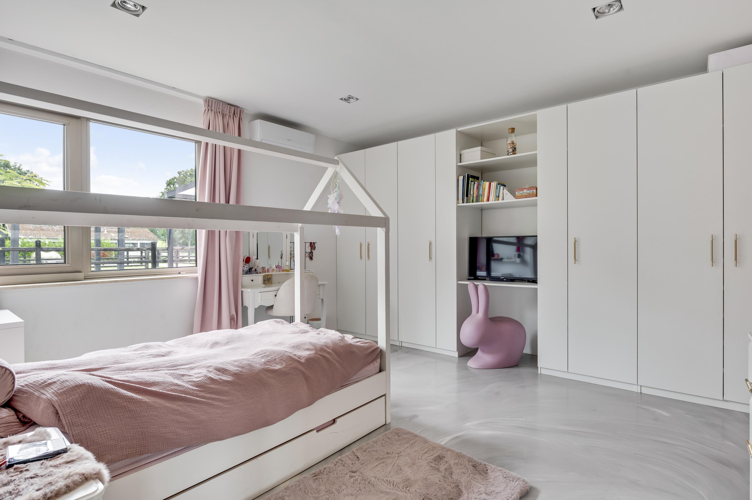 The beautifully landscaped garden includes a charming guest house complete with a kitchen, toilet, and double shower room — ideal for guests, an au pair, or live-in care. Alongside the floodlit riding arena, animal enclosures, and outdoor stable, the entire property radiates freedom, nature, and privacy. This is outdoor living at its finest.