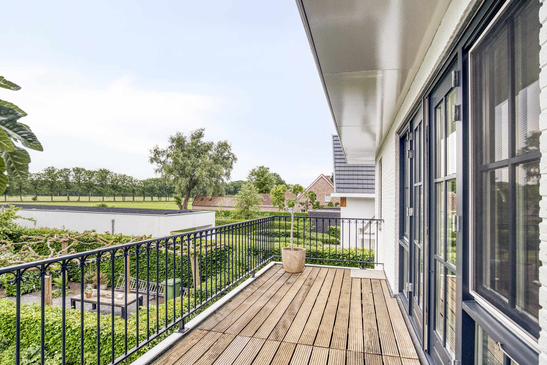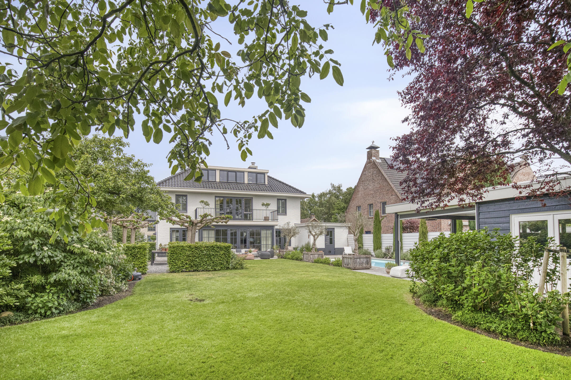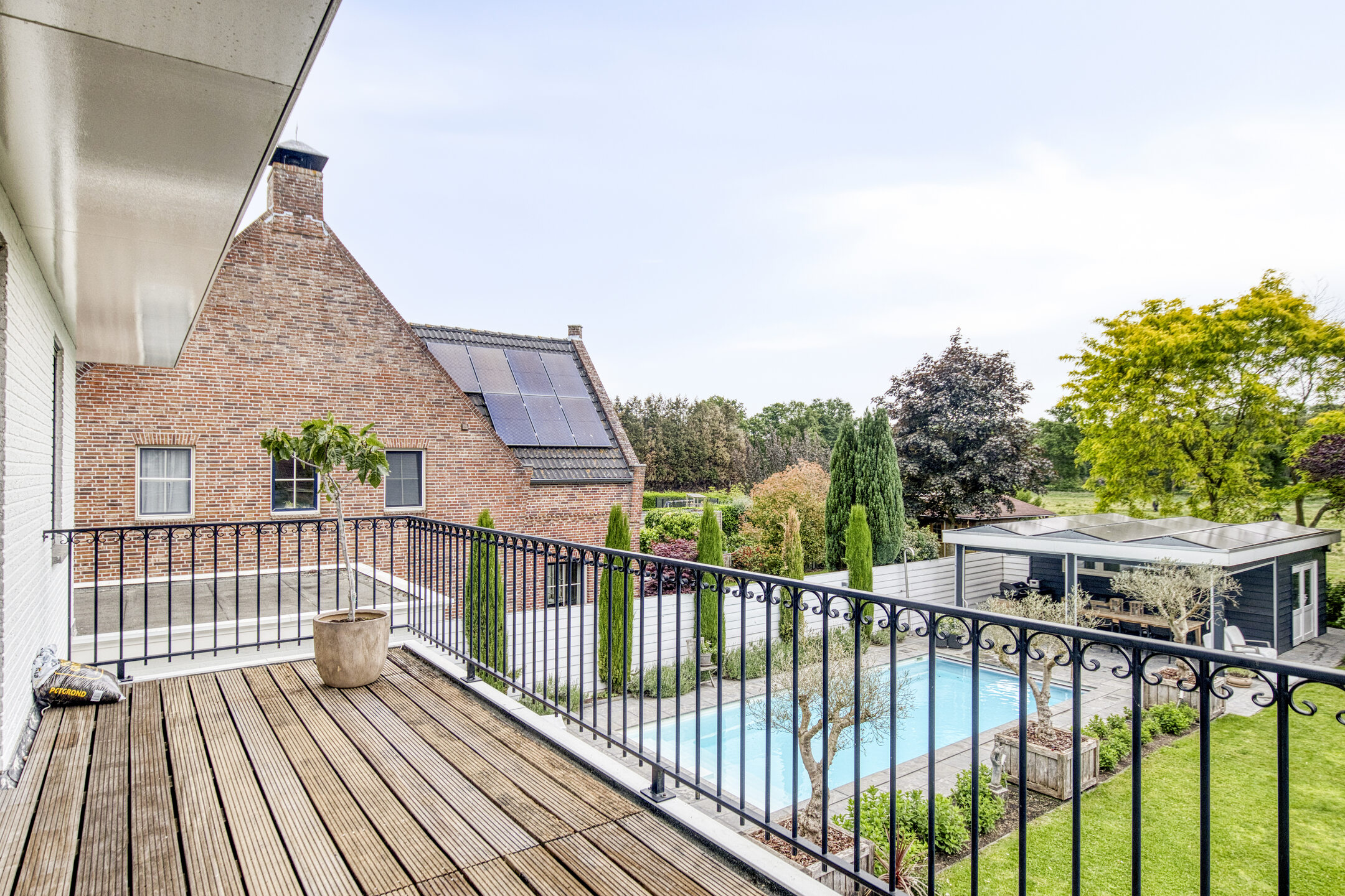 Upstairs, five bedrooms offer space and privacy, including a master with a private balcony, walk-in closet, luxury bathroom, sauna, and generous natural light. A second bathroom and separate storage area support flexibility for family or guest use. Multiple terraces provide the choice of sun or shade throughout the day, and sweeping views over adjoining meadows bring a tranquil backdrop. The landscaped garden features a heated swimming pool and poolhouse with veranda, equipped with automated systems for seamless enjoyment. Sustainability features include 24 solar panels, comprehensive insulation, HR central heating, and complete underfloor heating. This detached villa Huijbergen is a rare opportunity to experience quiet, space, and sophisticated living in the sought-after surroundings of Huijbergen.