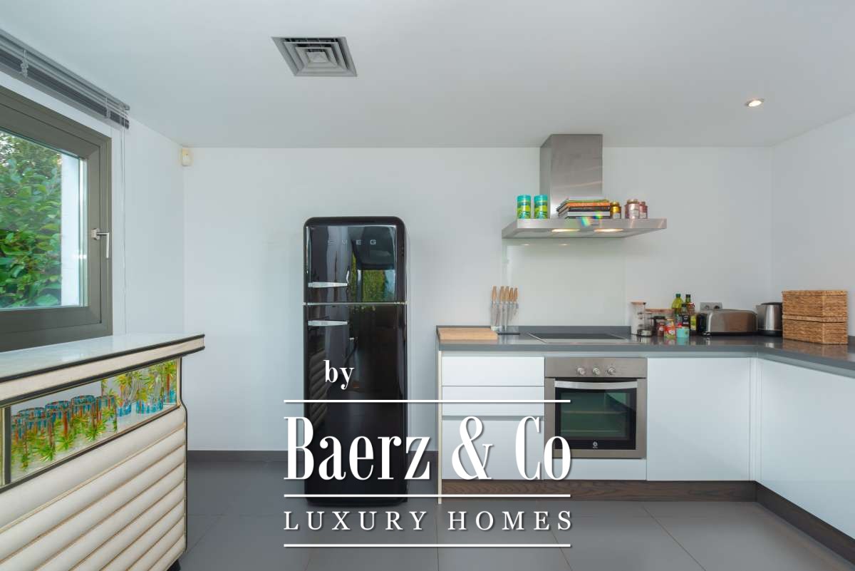 bedroom features an ensuite bathroom and a spacious, serene atmosphere thanks to large windows. The second bedroom has its own balcony, perfect for enjoying the morning sun and peaceful surroundings. The third bedroom is versatile and can serve as a guest room, children’s room or home office. These two bedrooms share a bathroom. All rooms are bright and inviting, with practical layouts that offer flexibility for your personal living needs.The outdoor SpaceThe outdoor area surrounding the private pool is designed for relaxation and summer enjoyment. Here you can enjoy sunny days on the loungers, dine outdoors or host cosy evenings with friends and family by the barbecue. The highlight of this property is the spacious rooftop terrace. From here you can enjoy panoramic views over the surroundings and the iconic silhouette of Dalt Vila in the distance – a magical setting for breathtaking sunsets. The rooftop terrace also features an outdoor shower, perfect for cooling off on warm summer days or after a morning yoga session under the blue sky.This townhouse in Jesús offers a relaxed, move-in-ready living experience where indoor and outdoor life blend harmoniously. An ideal home for those seeking comfort, atmosphere and the ultimate Ibiza lifestyle all year round.