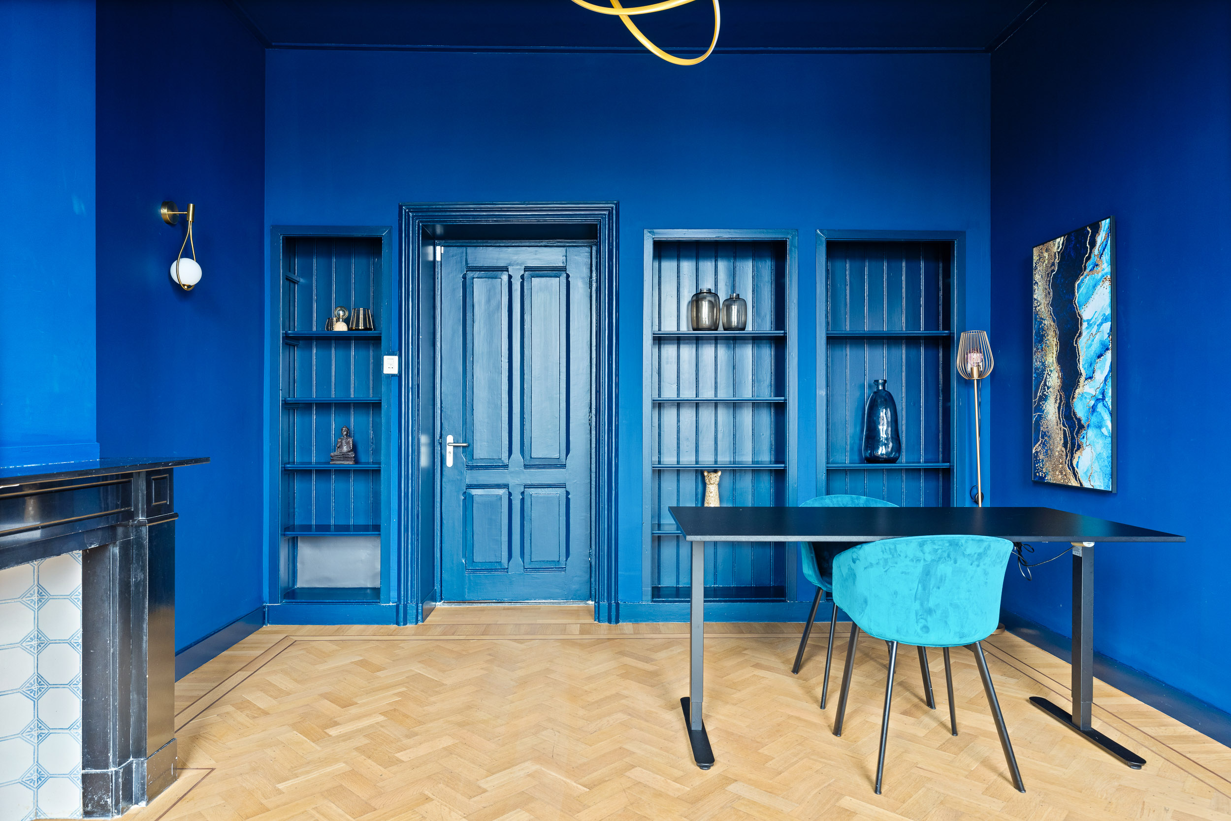 The monumental natural stone staircase with cast-iron balusters leads to the first floor, which has largely retained its original layout. From the landing, an ornate wooden door opens into the tiled hallway. To the right are the rooms en suite with sliding doors featuring brass fittings from Joure’s historic brass foundry. Original details, geometric ceiling mouldings, rosettes, parquet floors and a black marble fireplace, have been beautifully preserved.