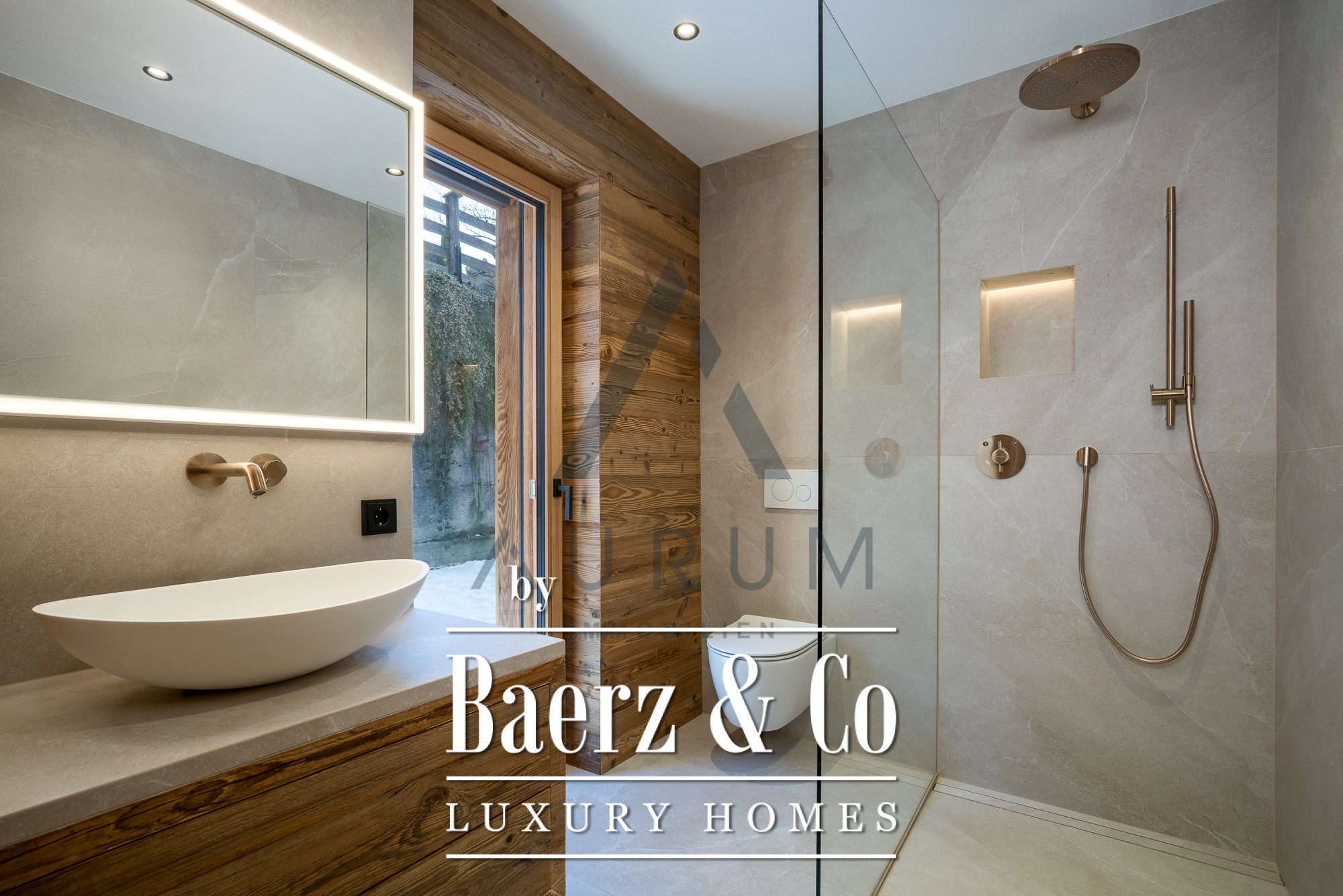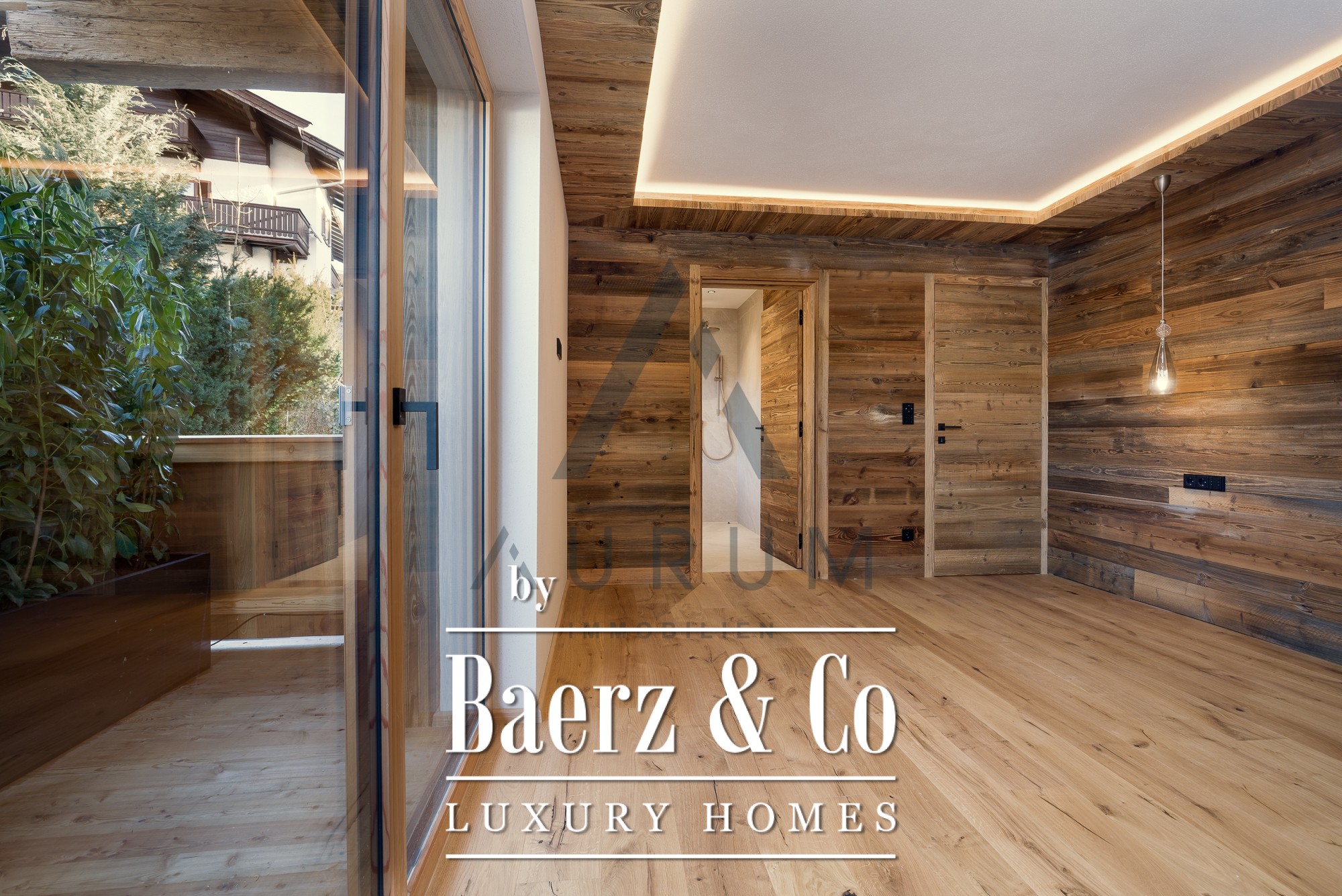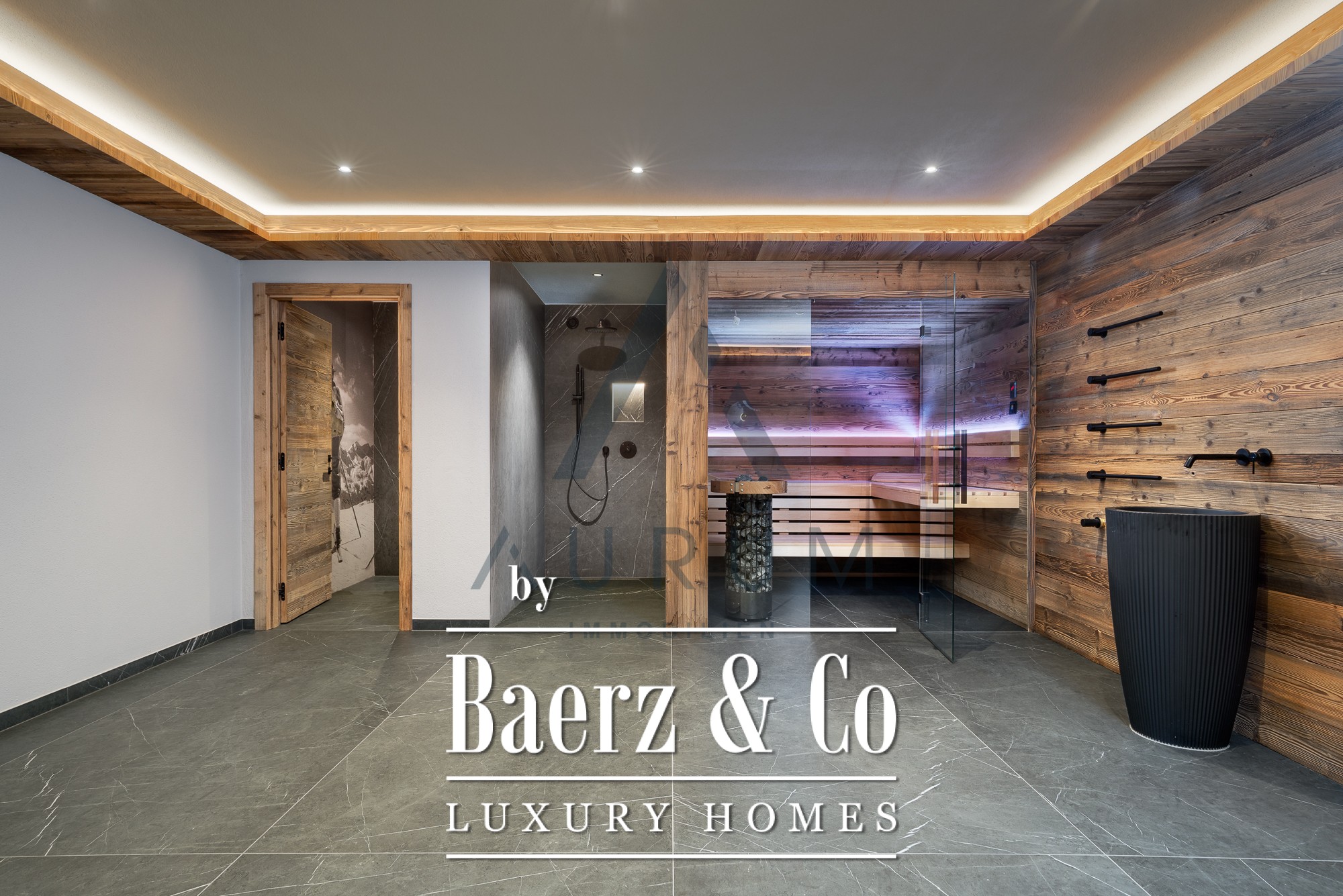 The private wellness area, reached by elevator, features a reclaimed wood sauna, wellness shower, freestanding bathtub, and space to unwind, complemented by solid wood floors and refined fixtures. Two garage parking spaces, state-of-the-art underfloor heating, a BUS system, and Occhio lighting add to the understated luxury. Here, authentic materials and controlled comfort establish a sense of place rooted in the landscape yet elevated by modern design.