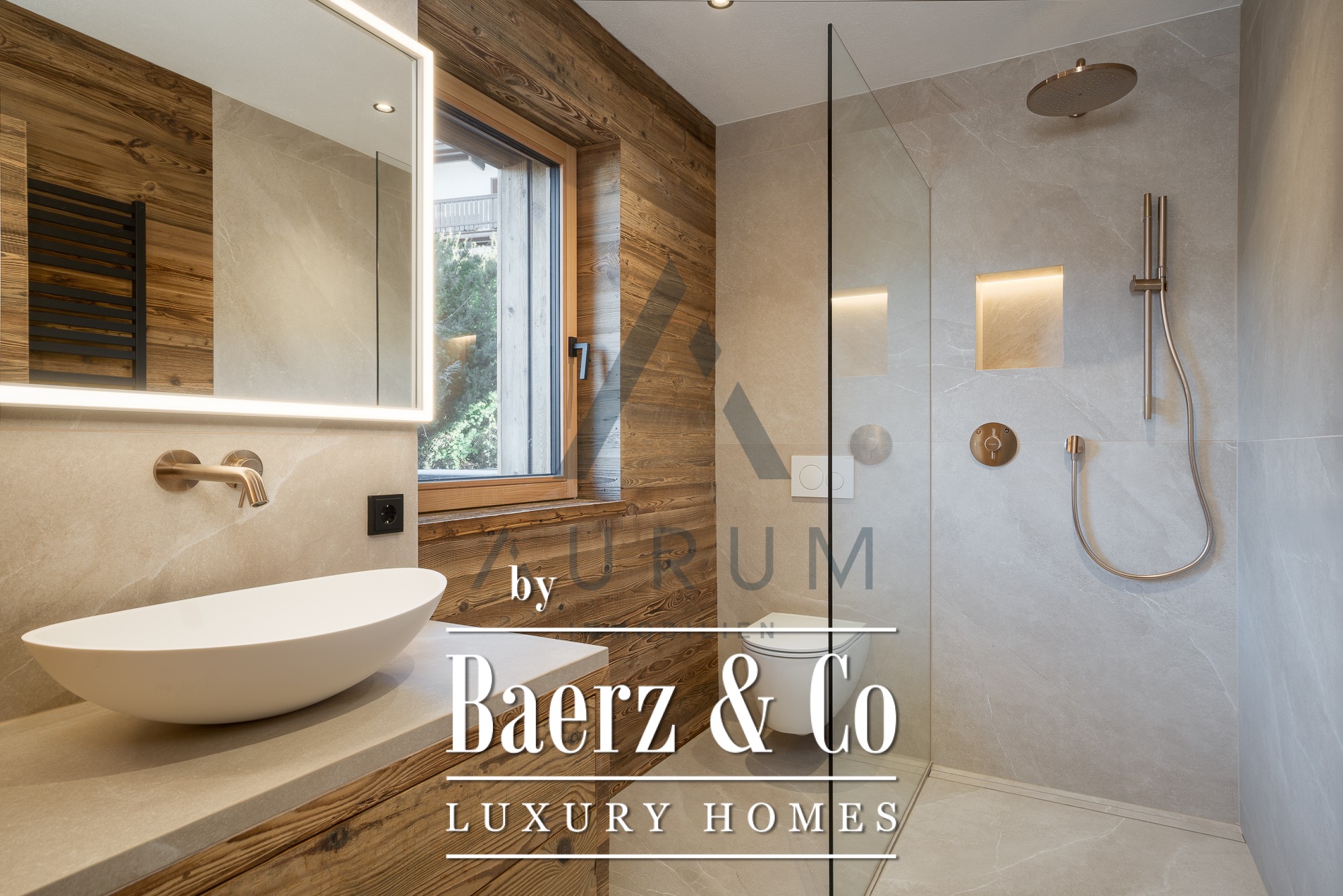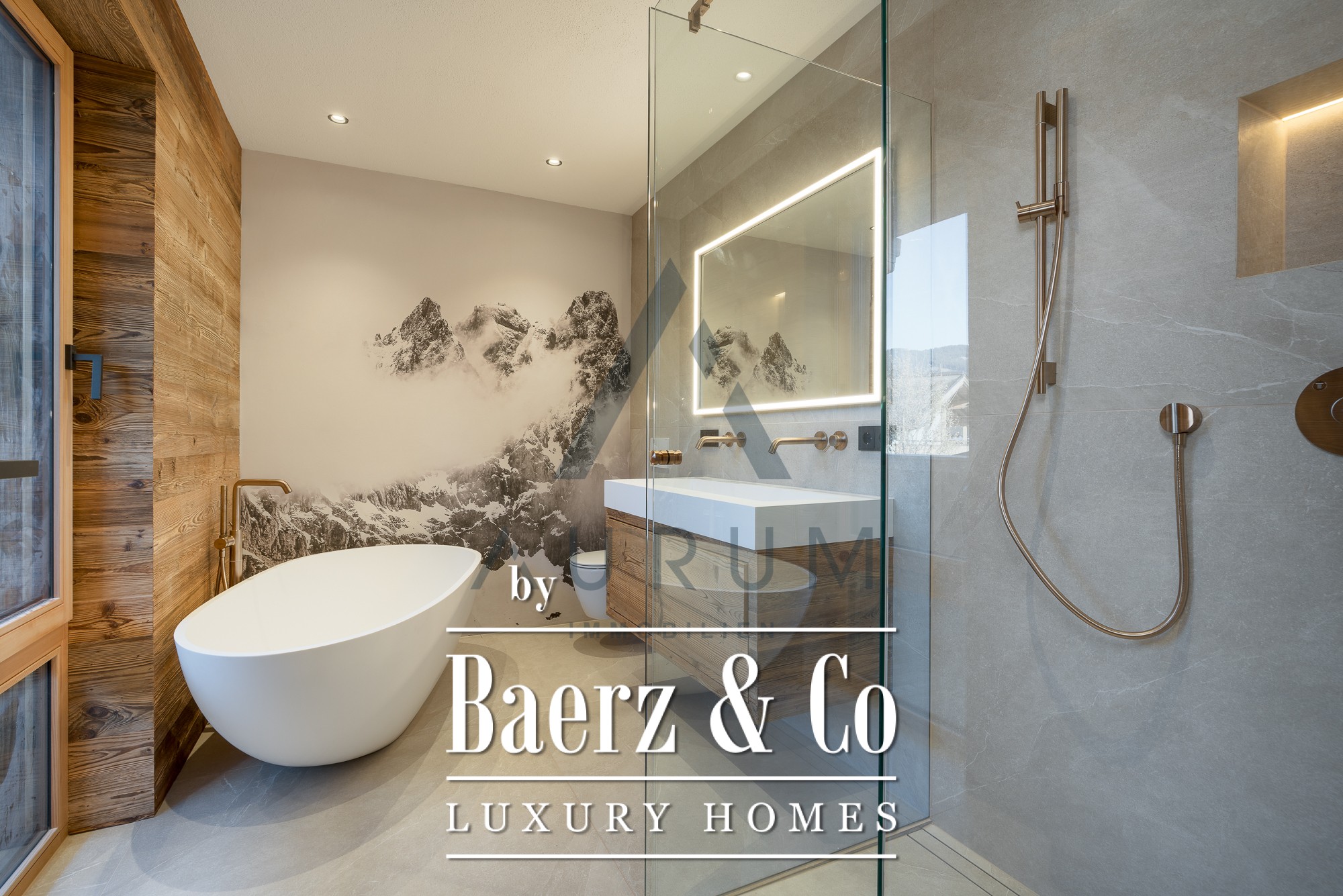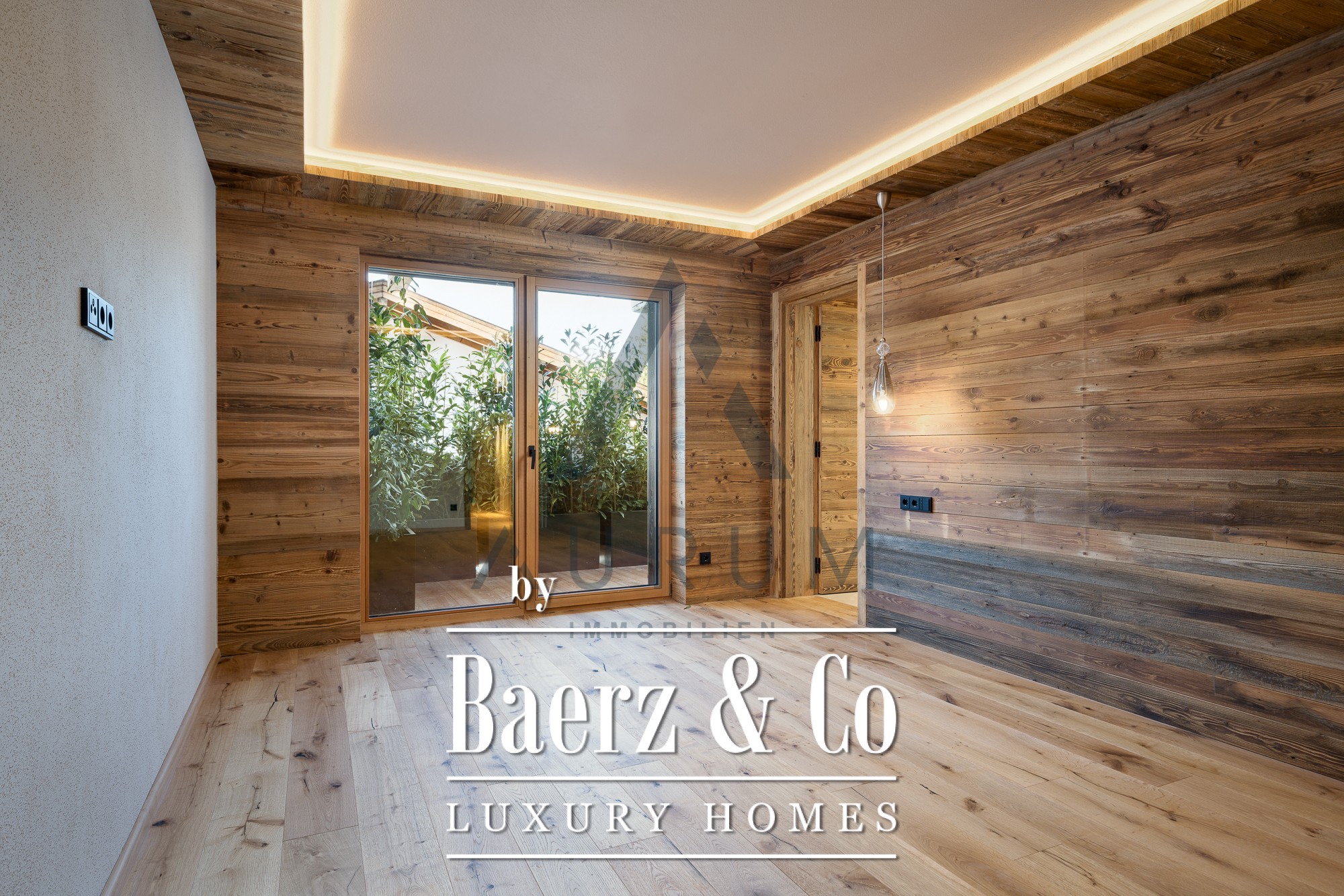 The private wellness area, reached by elevator, features a reclaimed wood sauna, wellness shower, freestanding bathtub, and space to unwind, complemented by solid wood floors and refined fixtures. Two garage parking spaces, state-of-the-art underfloor heating, a BUS system, and Occhio lighting add to the understated luxury. Here, authentic materials and controlled comfort establish a sense of place rooted in the landscape yet elevated by modern design.