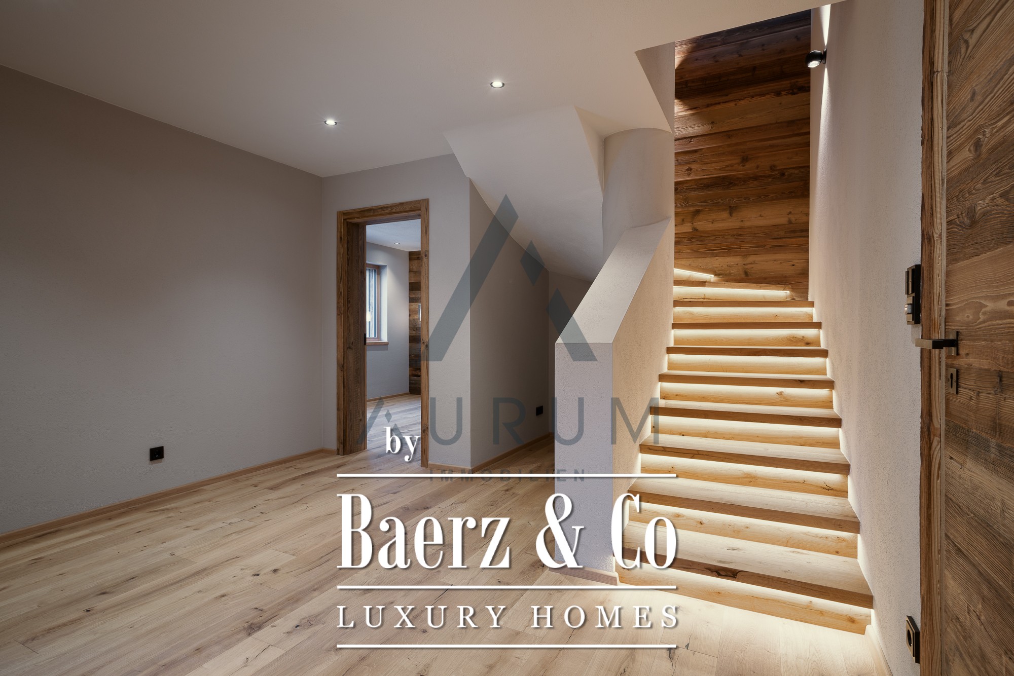 A grand staircase or private elevator ushers you into 200 m² of living space, where reclaimed wood, natural stone, and glass compose a facade attuned to Kitzbühel's modern vernacular. Inside, the first level’s three fully furnished bedrooms each offer bespoke carpentry, built-in wardrobes, and en-suite bathrooms, all connected by a thoughtfully proportioned hall. The master bedroom leads directly to a sun-bathed balcony, lending a distinct sense of retreat.