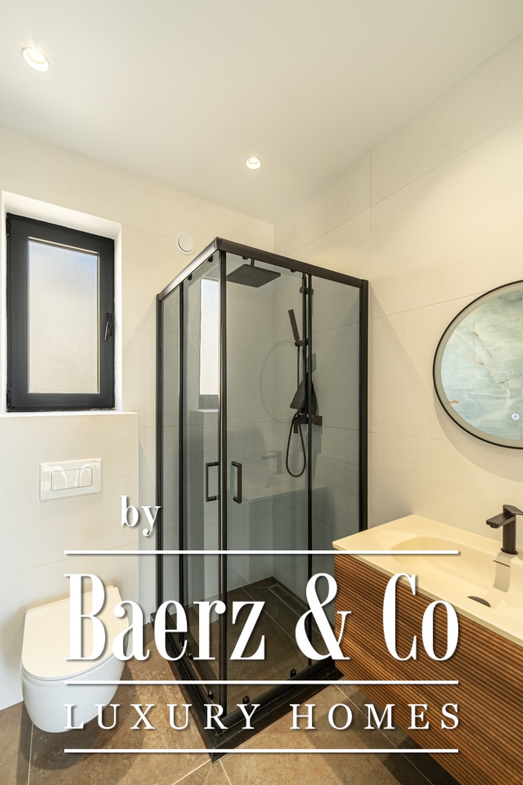 Air conditioning in the living area and master suite, underfloor heating in bathrooms and kitchen, and shockproof panoramic windows enhance both comfort and security. The grounds provide parking, a landscaped terrace, and the opportunity to tailor options such as a swimming pool or gym to individual preference, making this luxury townhouse for sale in Kotor adaptable to a discerning owner’s vision.
