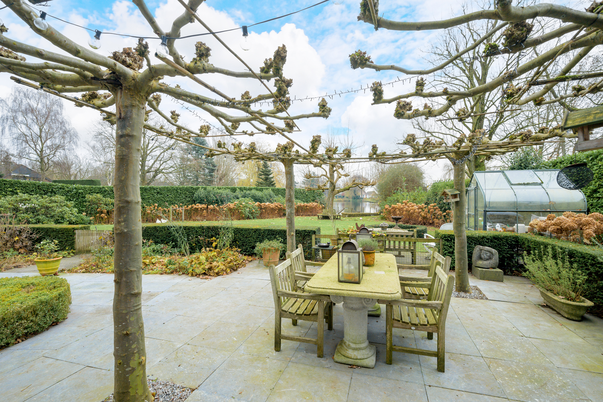 Multiple terraces have been created, including a spacious terrace directly on the water and a large hardstone-paved terrace next to the house, partially shaded by plane trees. The front/side garden also features a decorative pond.