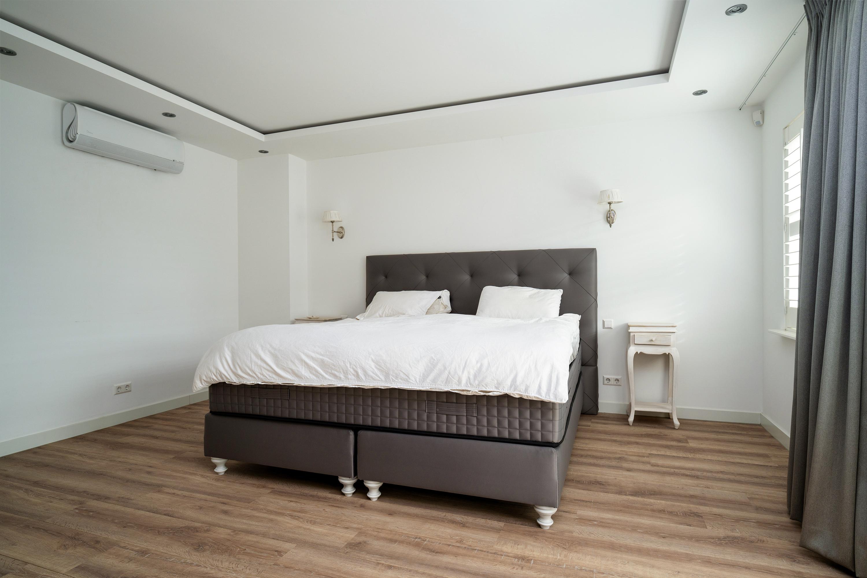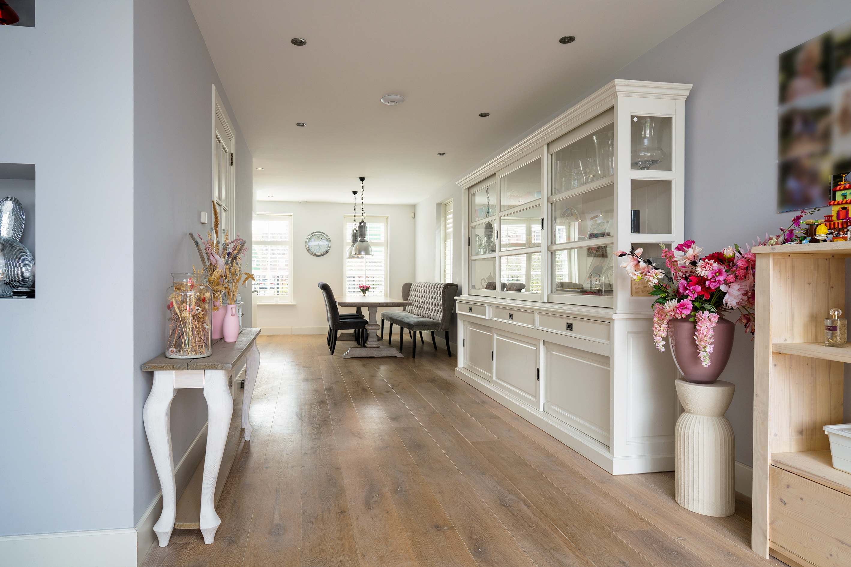 The living room at the garden side is cozy, with a striking cinewall and fireplace. From here, you walk through the double doors into the garden with a very large porch. Perfect for long evenings and outdoor gatherings on the terrace. Built-in trampoline and a swing for the kids. With a glass of wine in hand, you can keep a (small) eye on things. The garden cushions and those of your sloop can be neatly stored in the wooden shed. And that sloop? You simply moor it directly behind the house. On a beautiful summer day, you can sail straight to Amsterdam.