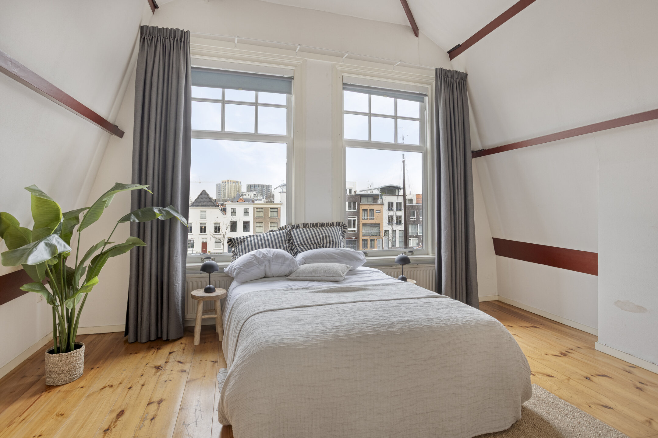 Overloop met trap naar de 2e etage. Voorkamer met hoge balkenplafonds en prachtig uitzicht over het Galgewater. Achterkamer met openslaande deuren naar het dakterras.
