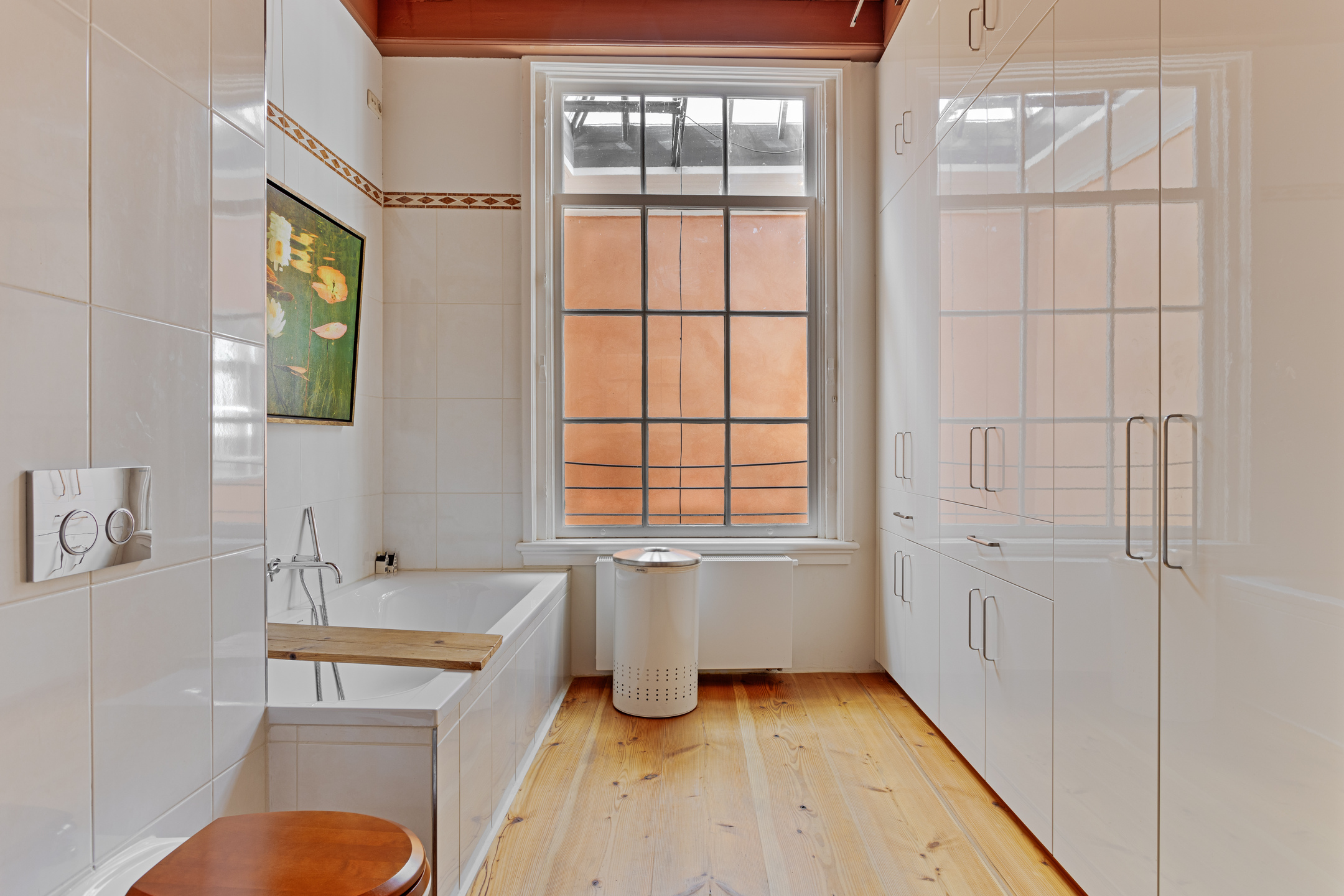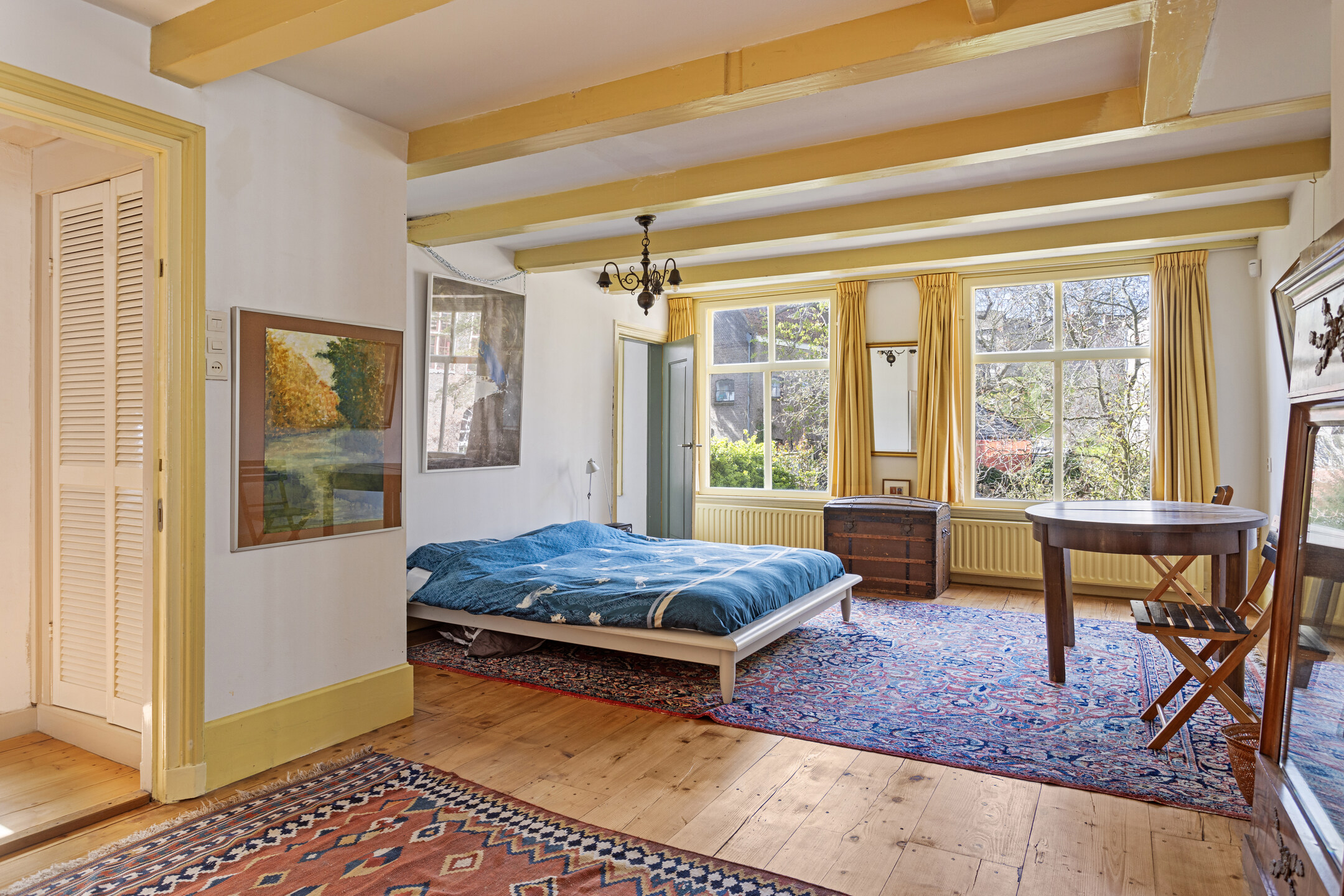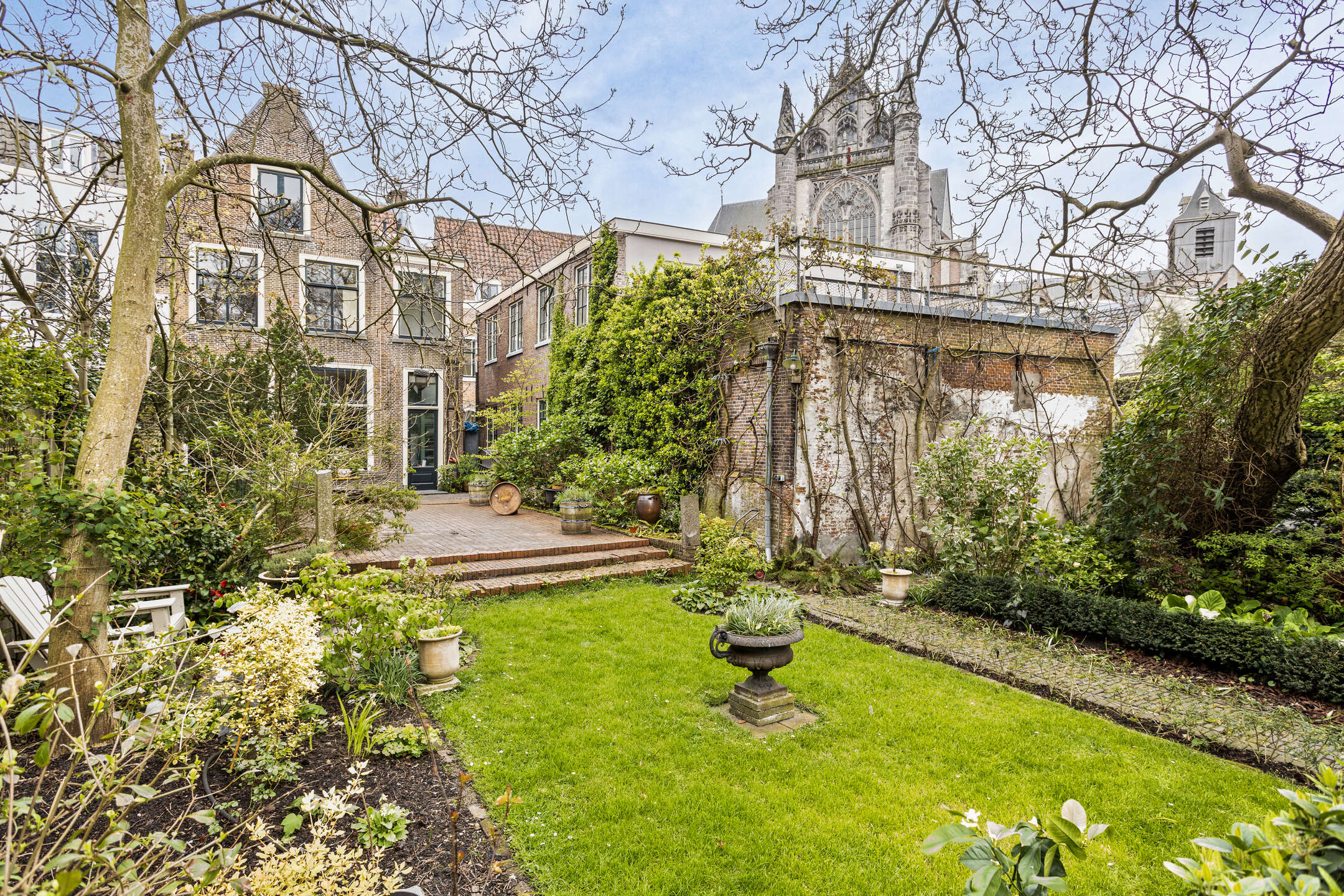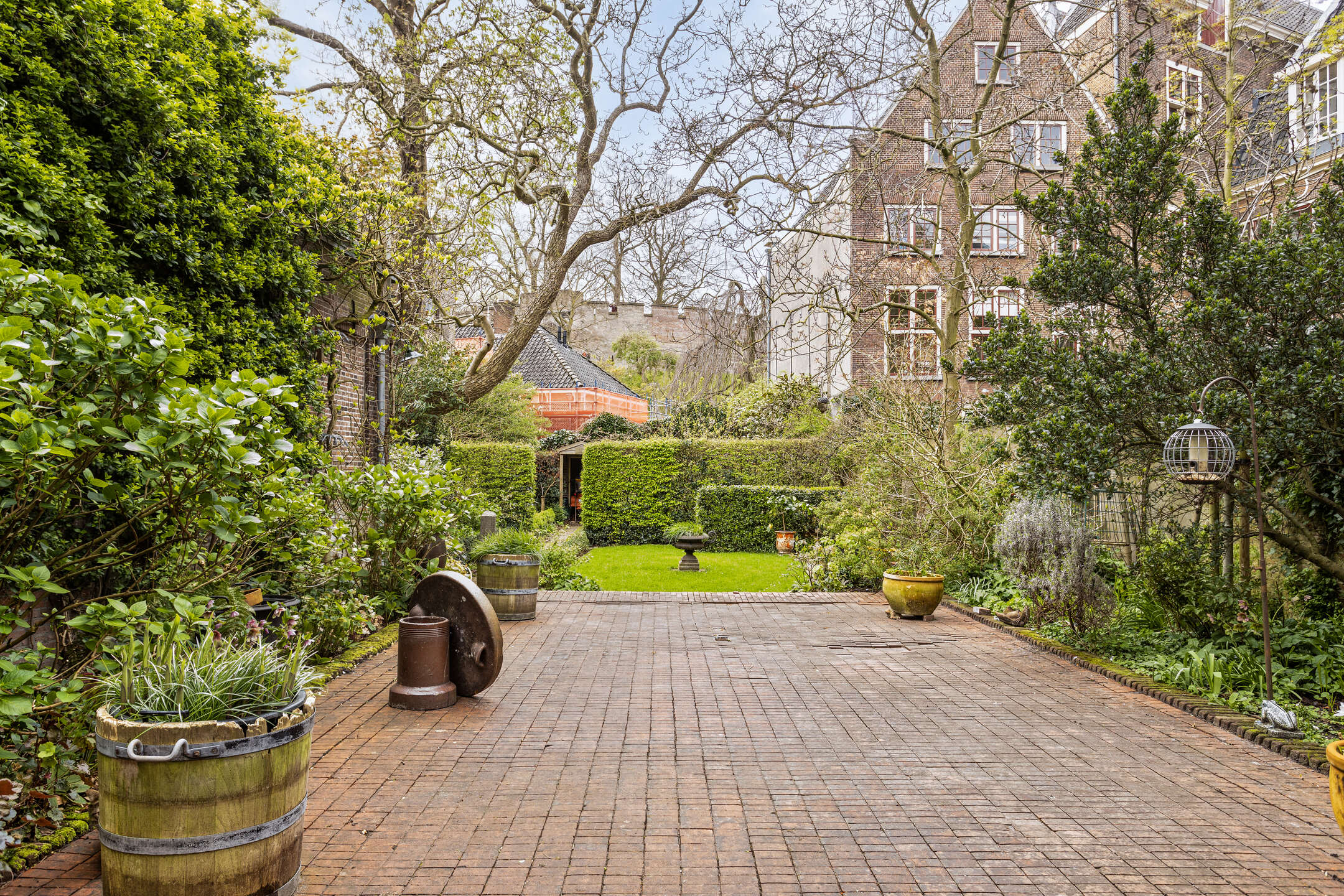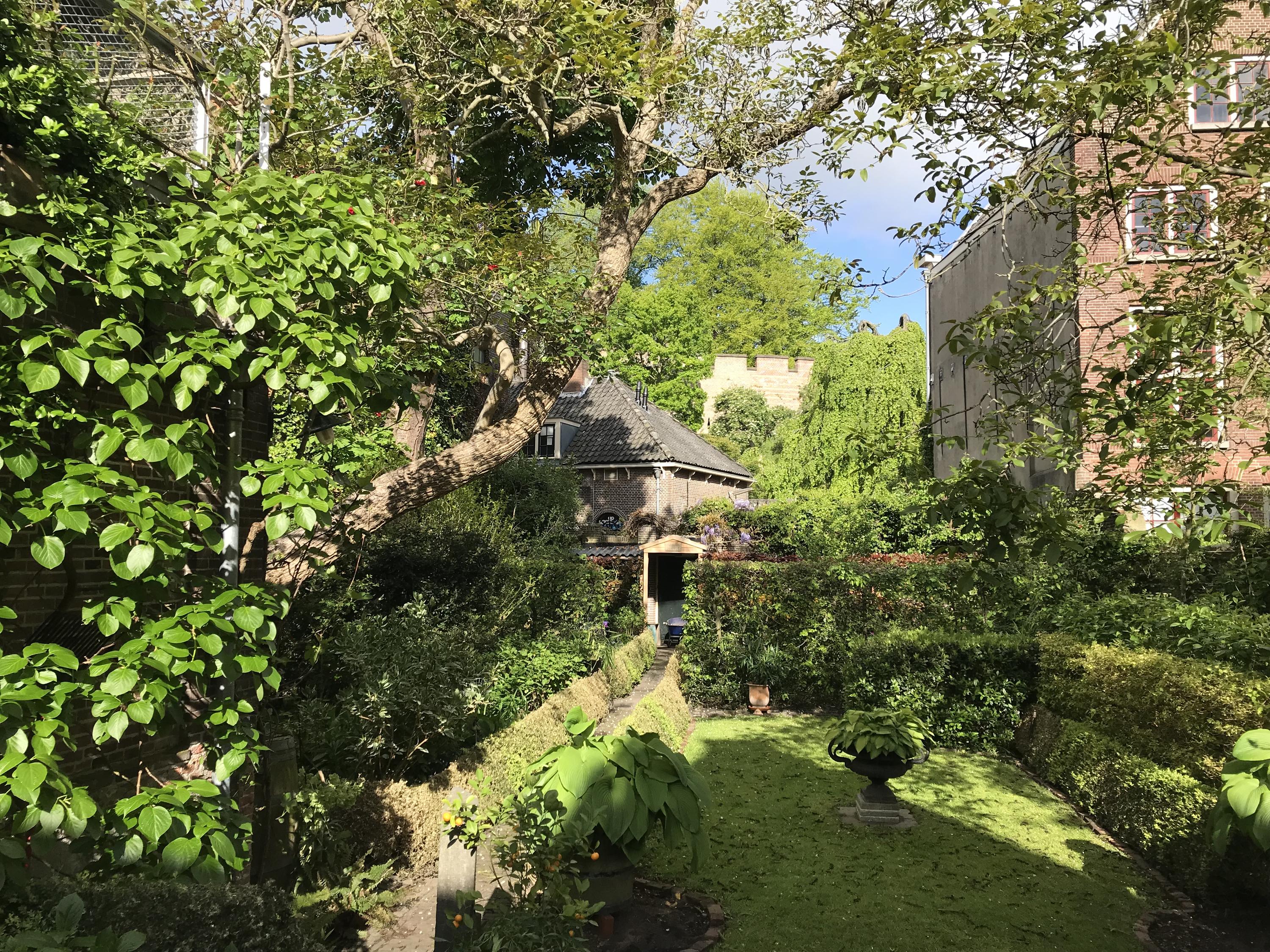 The garden is perhaps the real 'unique selling point' of this property... a garden with several terraces and seating areas for shade and sun; a garden with a back entrance; a garden with beautiful mature trees, colourful shrubs and flowers and space for your own vegetable garden; and a garden with beautiful views to, for example, 'De Burcht' and the Hooglandse Kerk.
