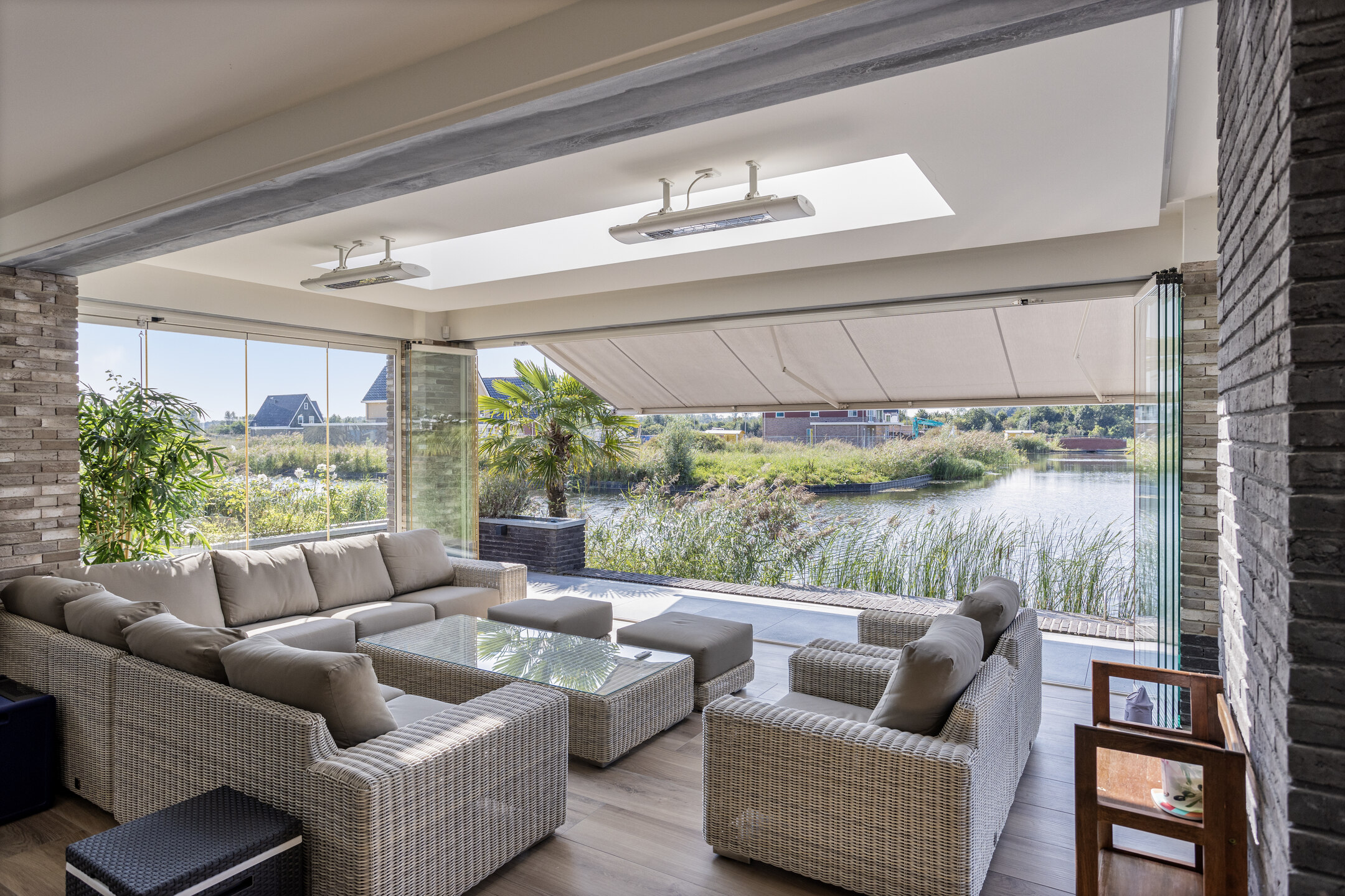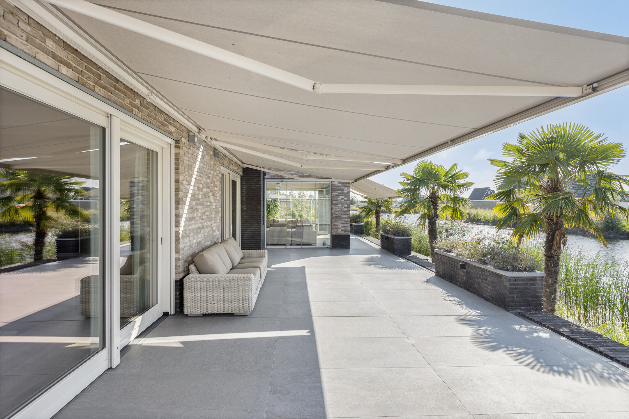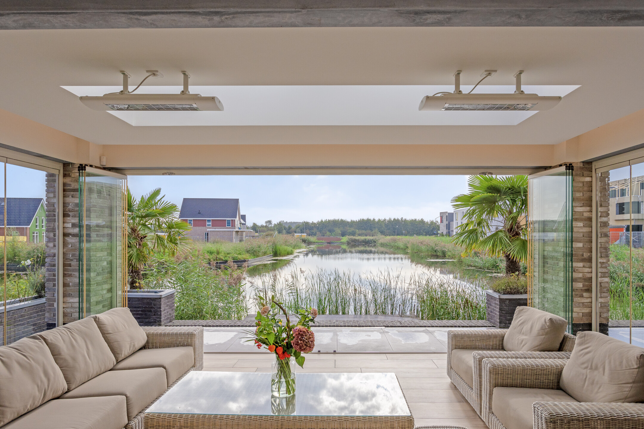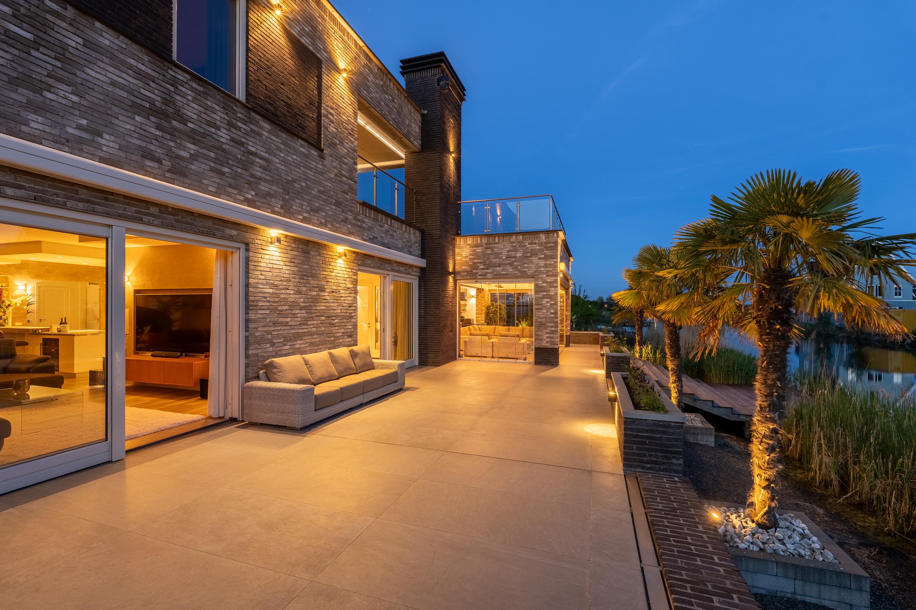 Situated by the water, the villa includes several terraces, a private jetty, and a beautifully landscaped garden with palm trees. The conservatory with folding glass walls and large skylight creates a fluid indoor-outdoor living experience – perfect in every season. The wood-burning stove and dual infrared heaters make this a pleasant spot even in colder months.