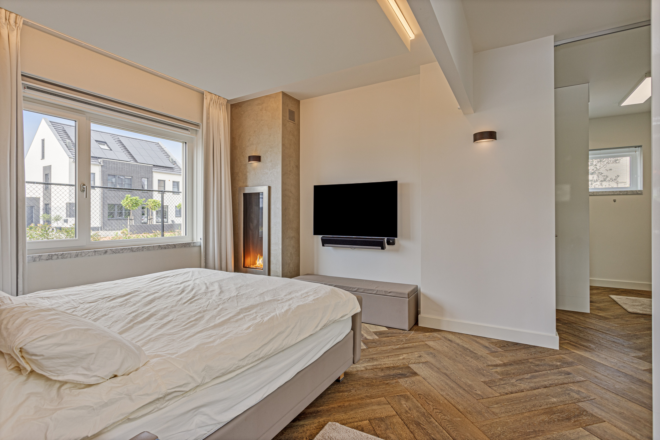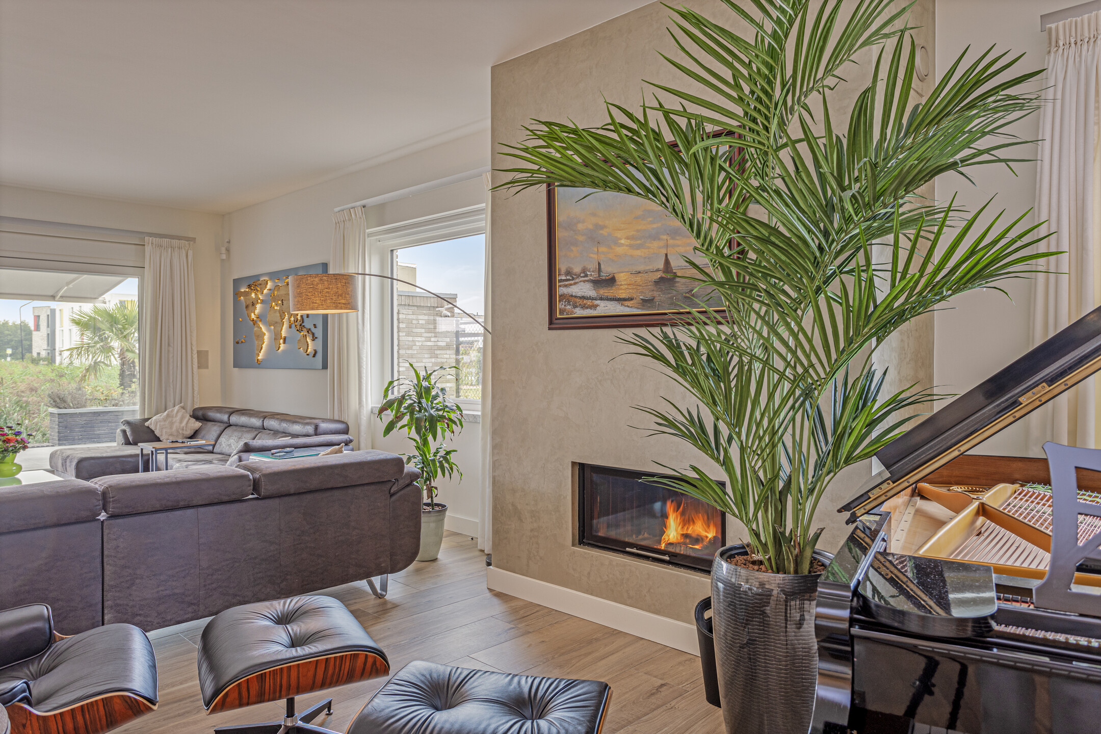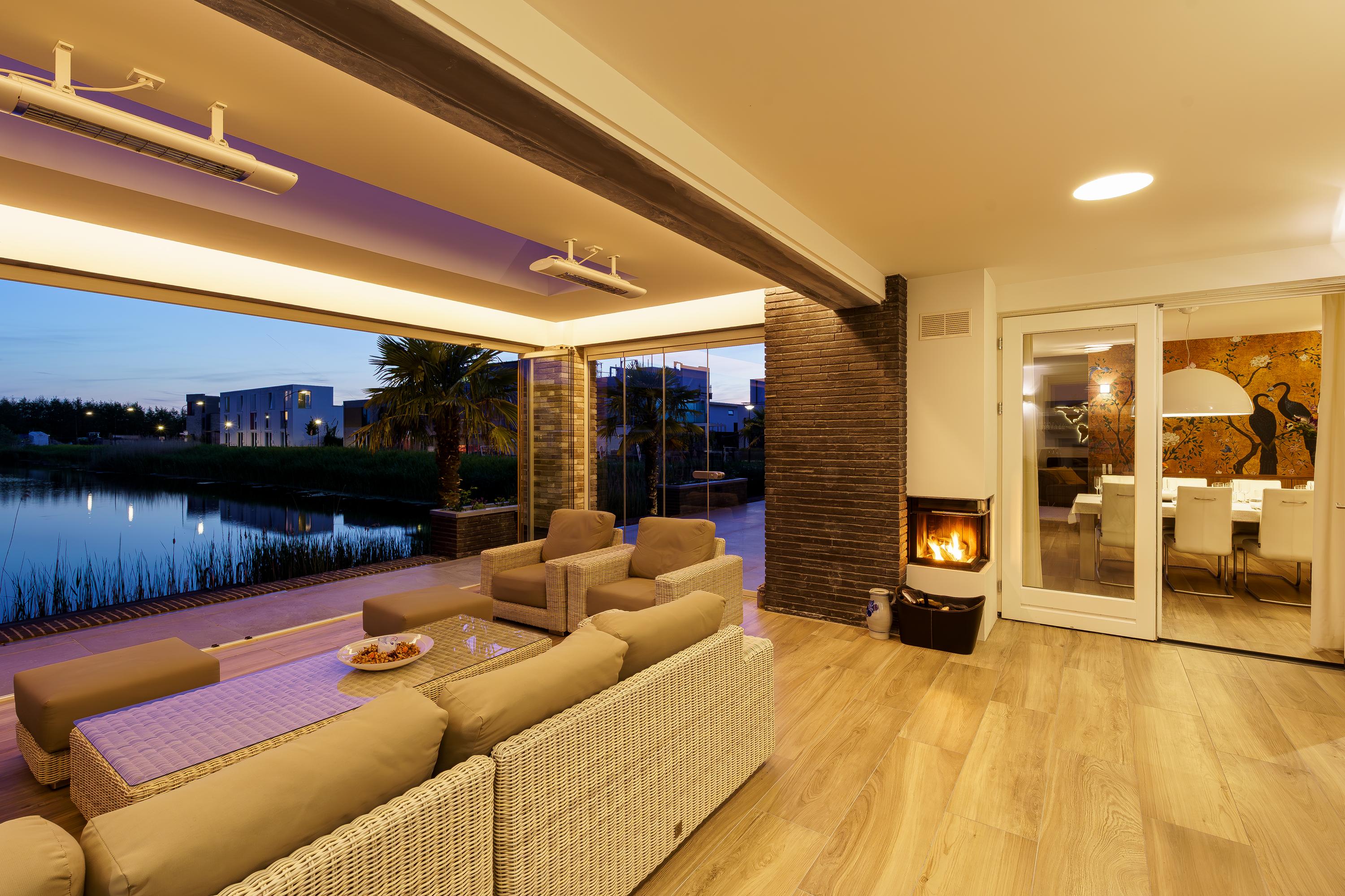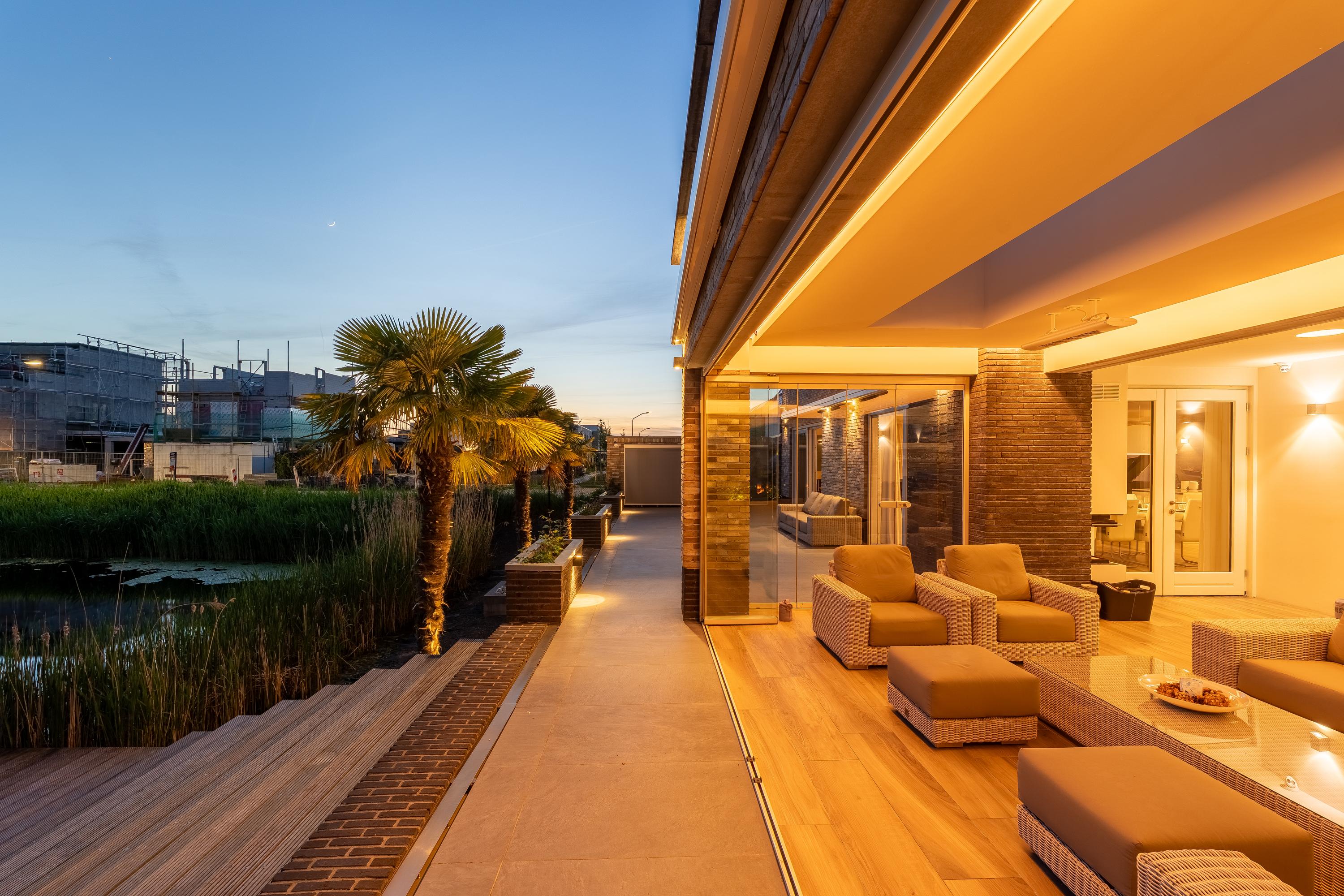 Situated by the water, the villa includes several terraces, a private jetty, and a beautifully landscaped garden with palm trees. The conservatory with folding glass walls and large skylight creates a fluid indoor-outdoor living experience – perfect in every season. The wood-burning stove and dual infrared heaters make this a pleasant spot even in colder months.