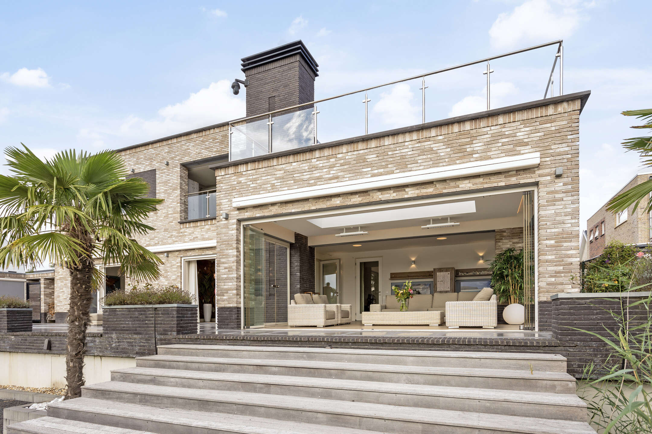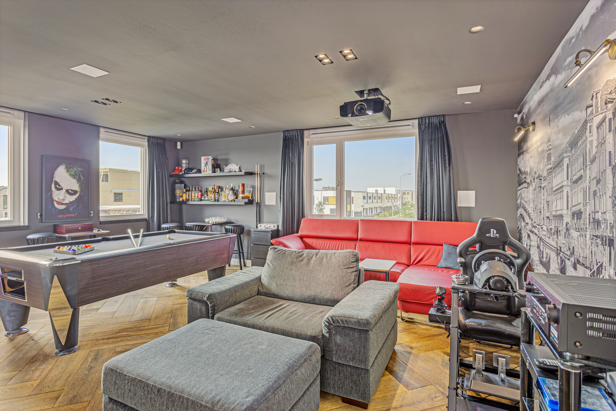 A thoughtfully designed, luxurious and sustainable villa with 8 (bed)rooms, 2 bathrooms, an expansive, high-end kitchen in a loft-style open-plan living area with adjoining conservatory, cinema and relaxation room, fitness and wellness suite with sauna and steam room, 55 m² garage, double carport, rooftop terrace with loggia, private jetty – and so much more.