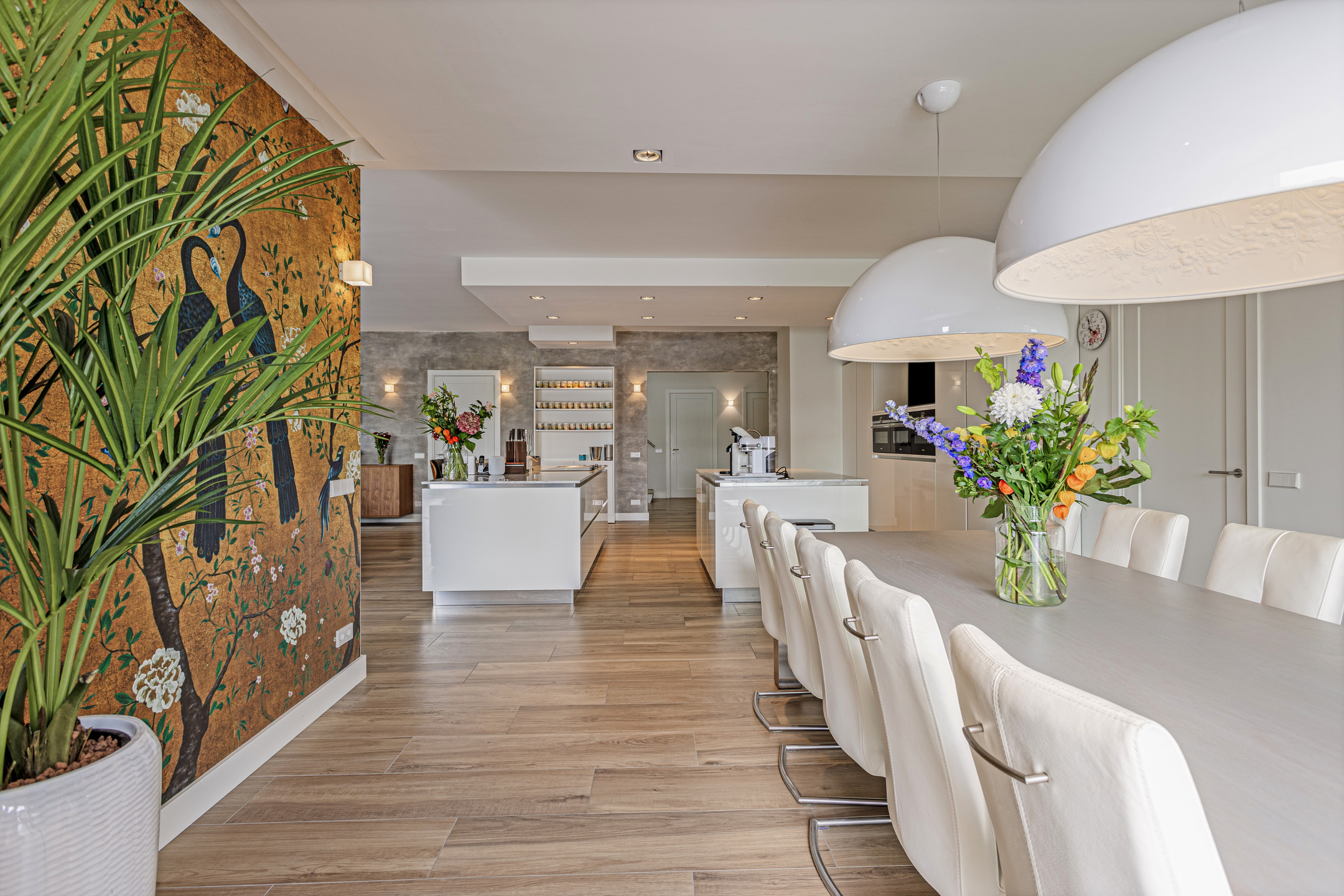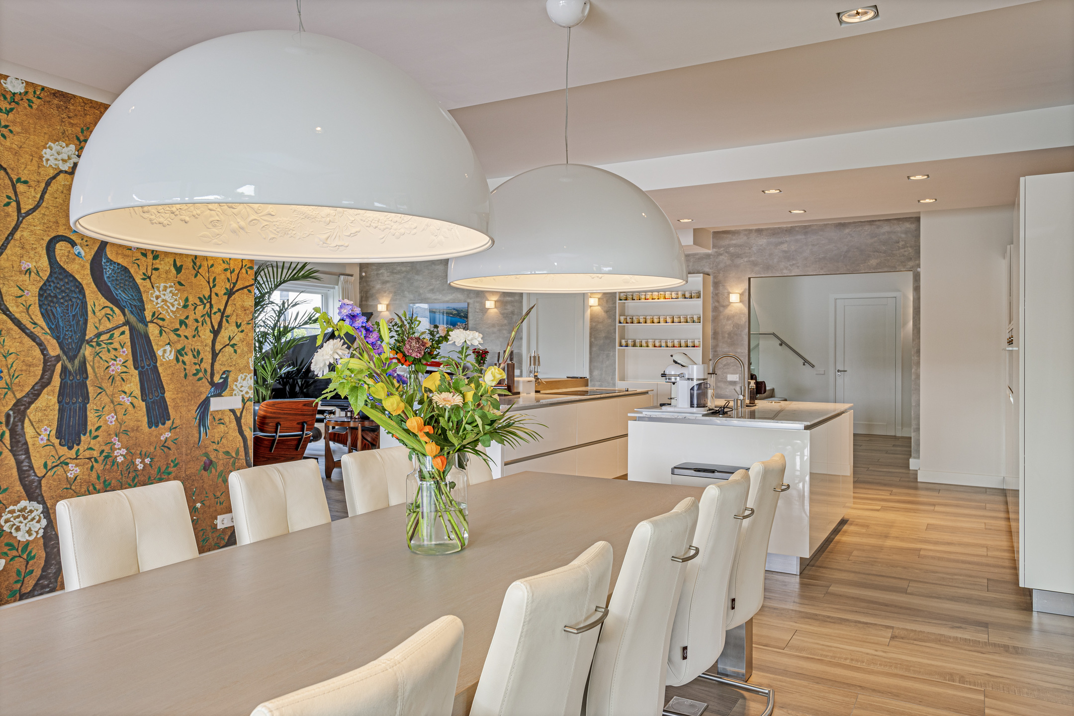 The kitchen connects beautifully to the surrounding living space and includes two kitchen islands and a wall unit with top-tier appliances: Quooker tap, multiple induction zones with integrated extraction, teppanyaki grill, oven, combi microwave/oven, steam oven, large fridge and separate freezer. An adjacent bar area with a wine fridge keeps refreshments close at hand. The spacious dining table comfortably seats 12 guests.