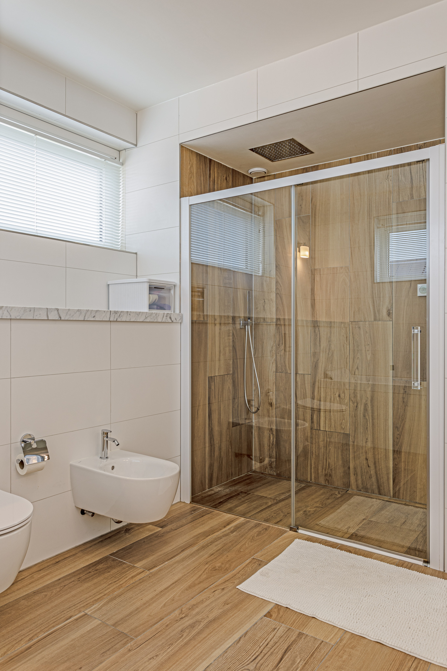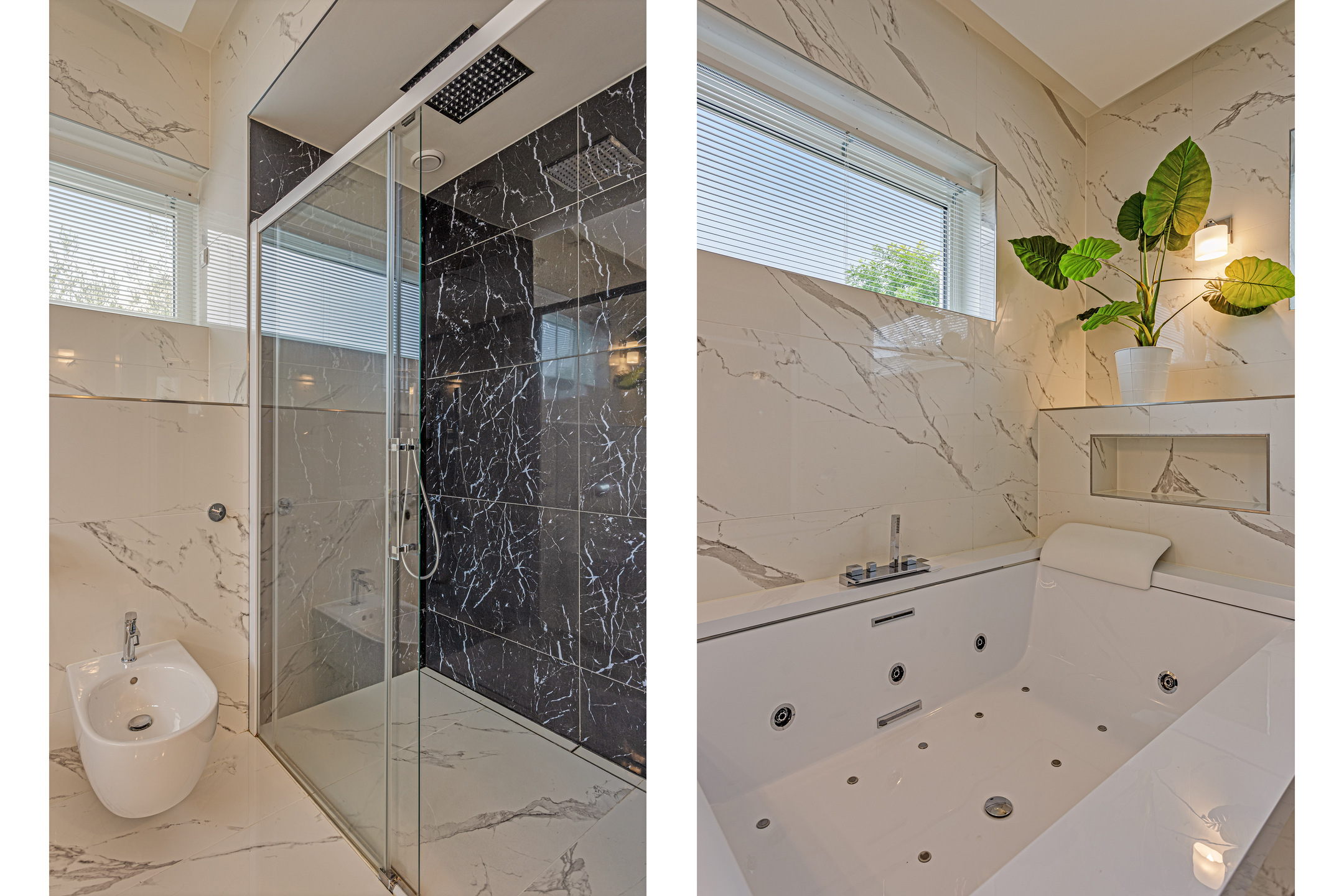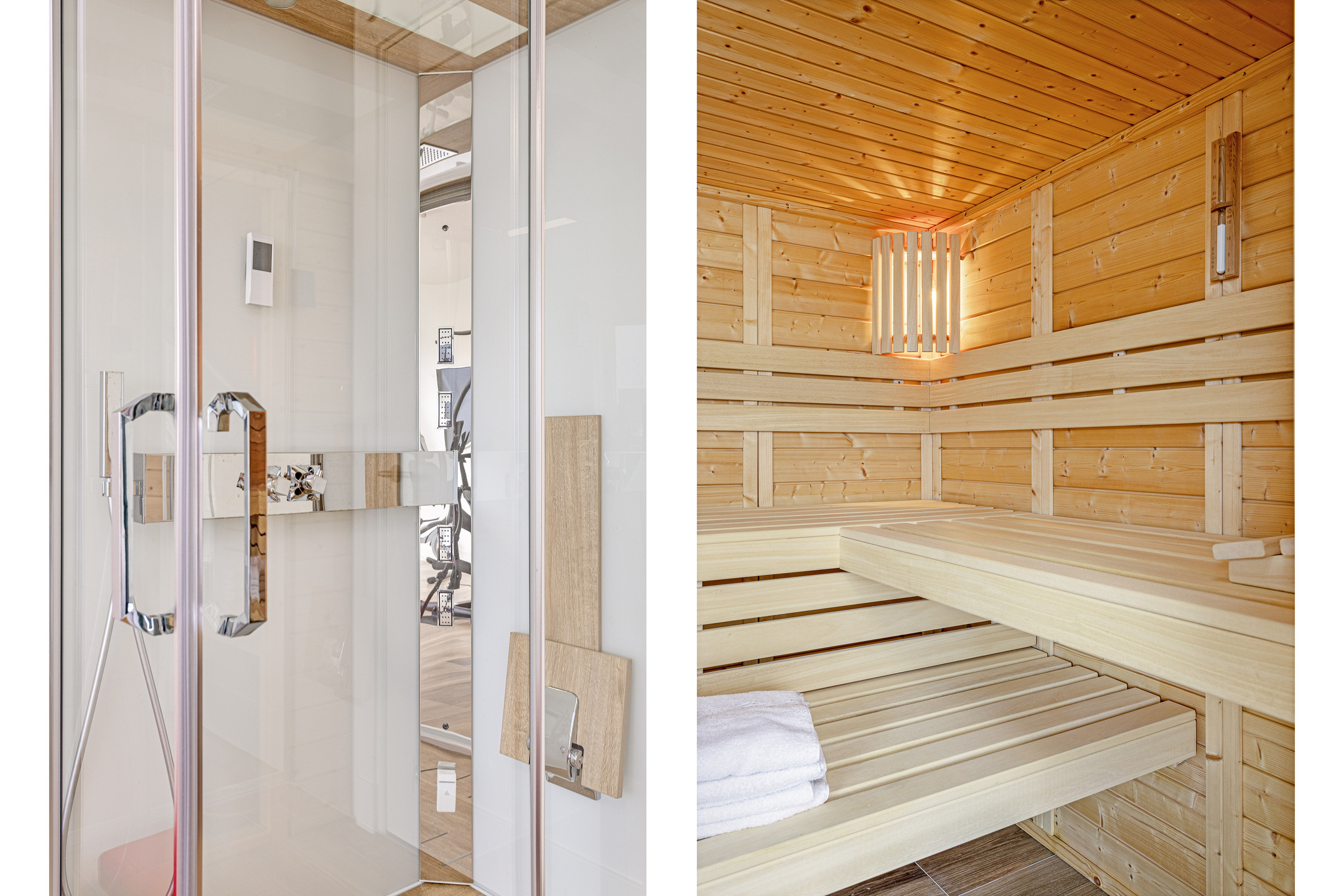 Upstairs are four further generous bedrooms, a second luxurious bathroom (with bathtub, shower, bidet and WC), and a fully equipped fitness and wellness suite featuring a private sauna and deluxe steam cabin.
