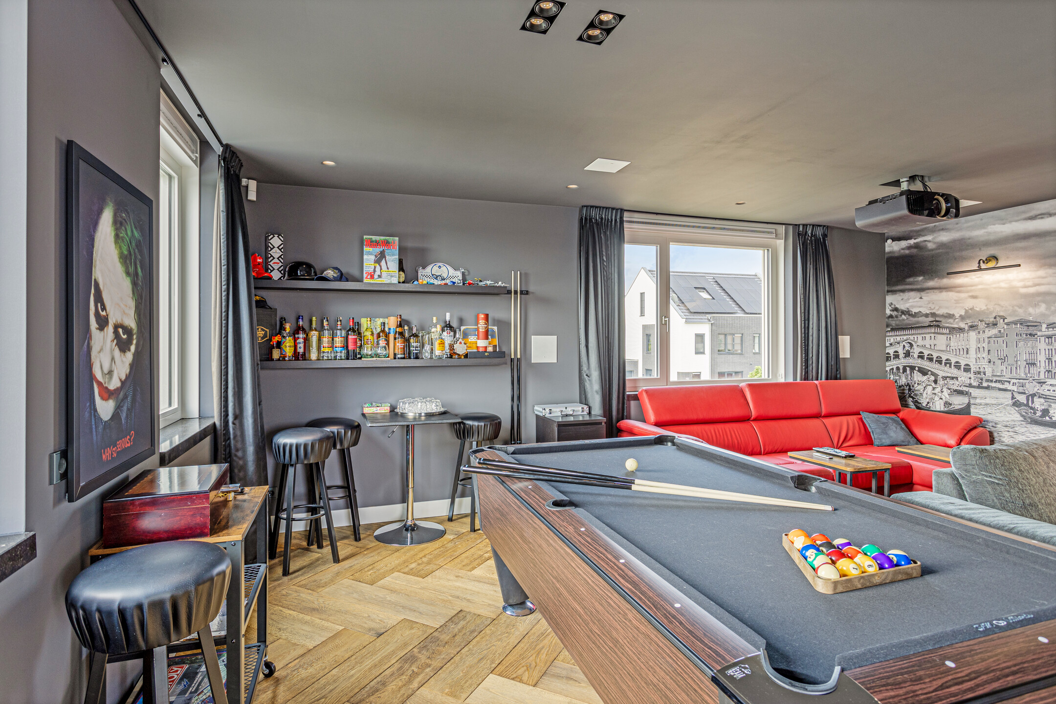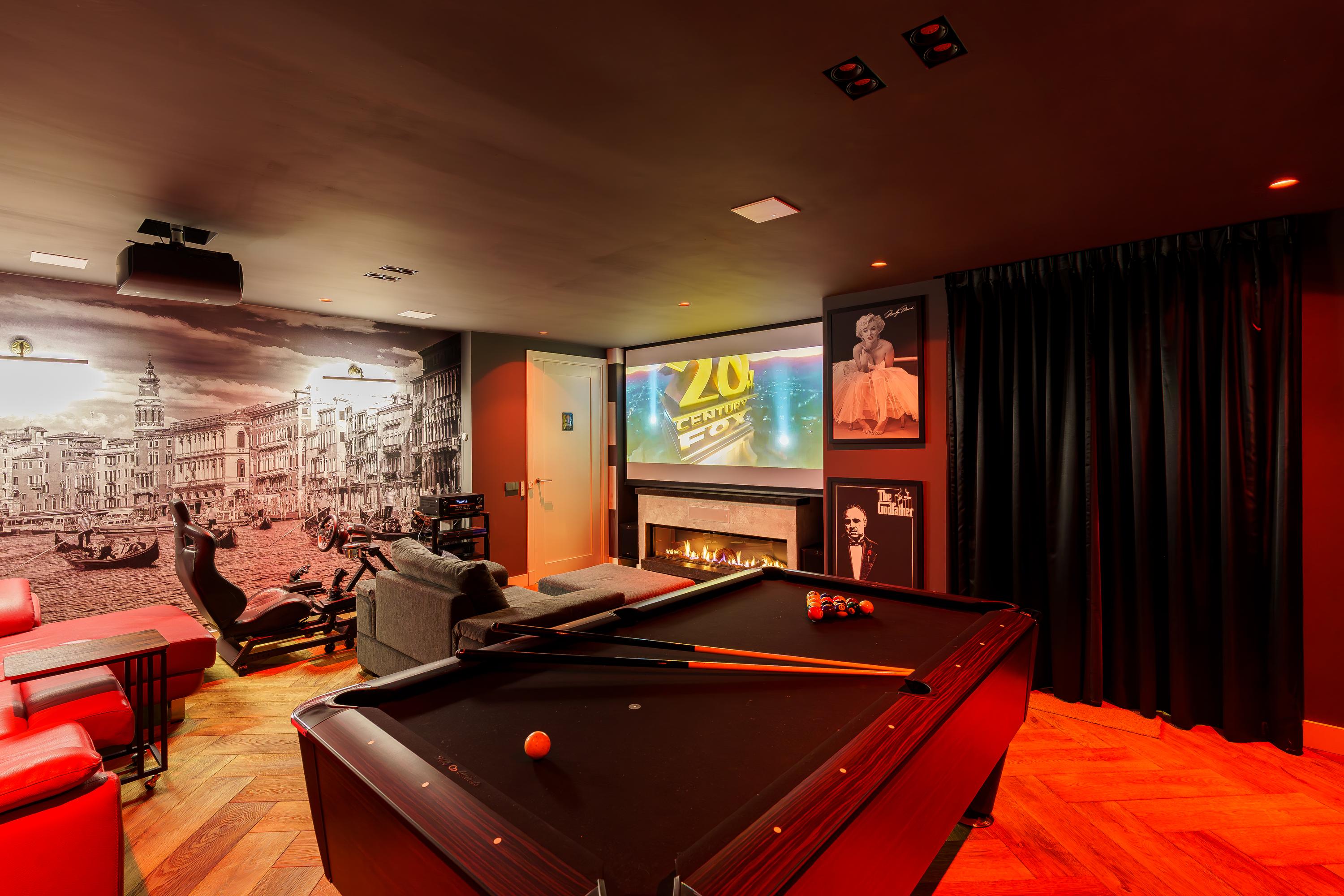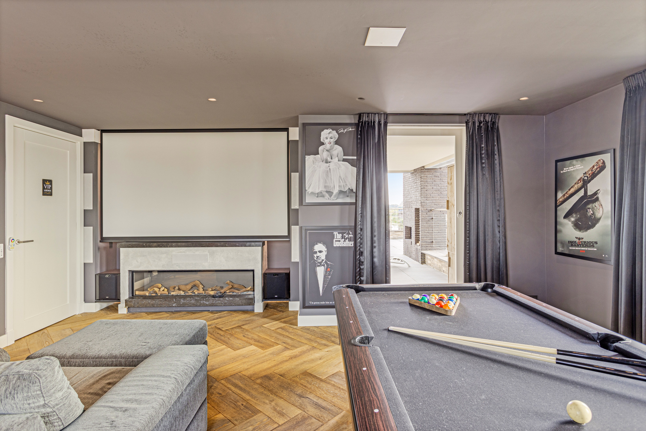 The stylish cinema room is ideal for a film night, a round of pool, or gaming. A place for all ages to unwind or have fun. It connects directly to the loggia with an outdoor fireplace and infrared heating – making it a versatile extension of the entertainment space.