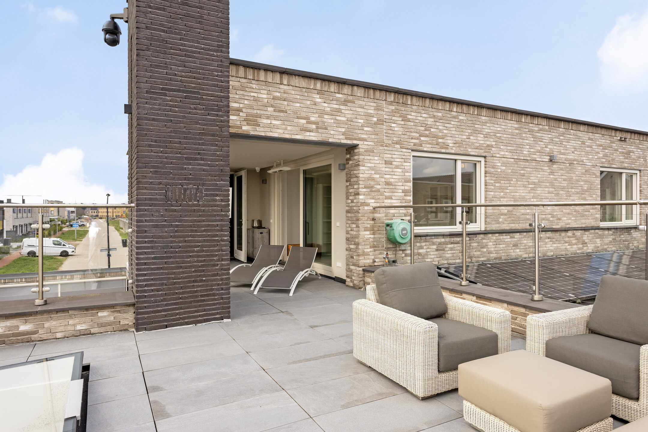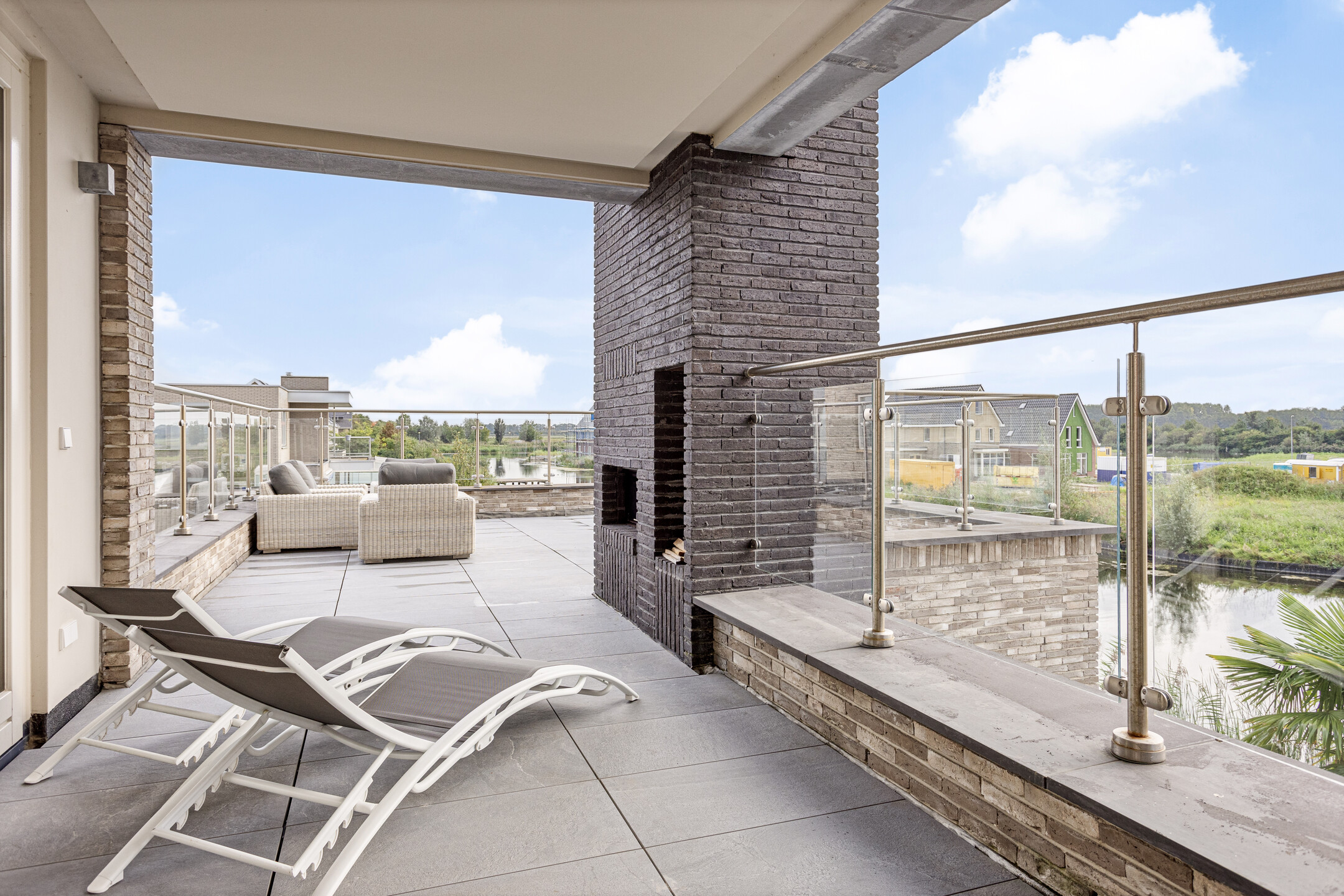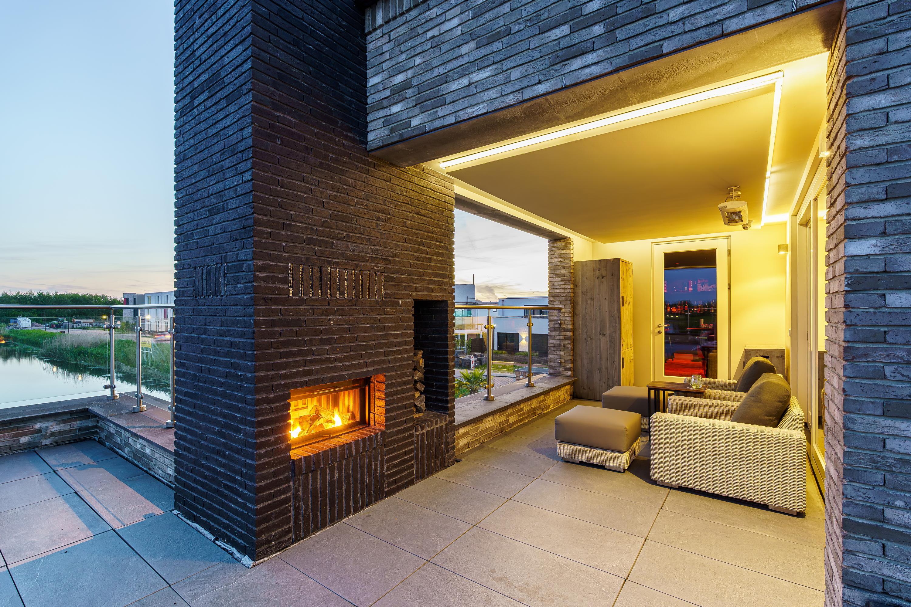 The roof terrace with loggia is one of the home's best features. With views over the water and the flicker of flames from the outdoor fireplace, it’s the perfect spot to enjoy a breathtaking sunset.