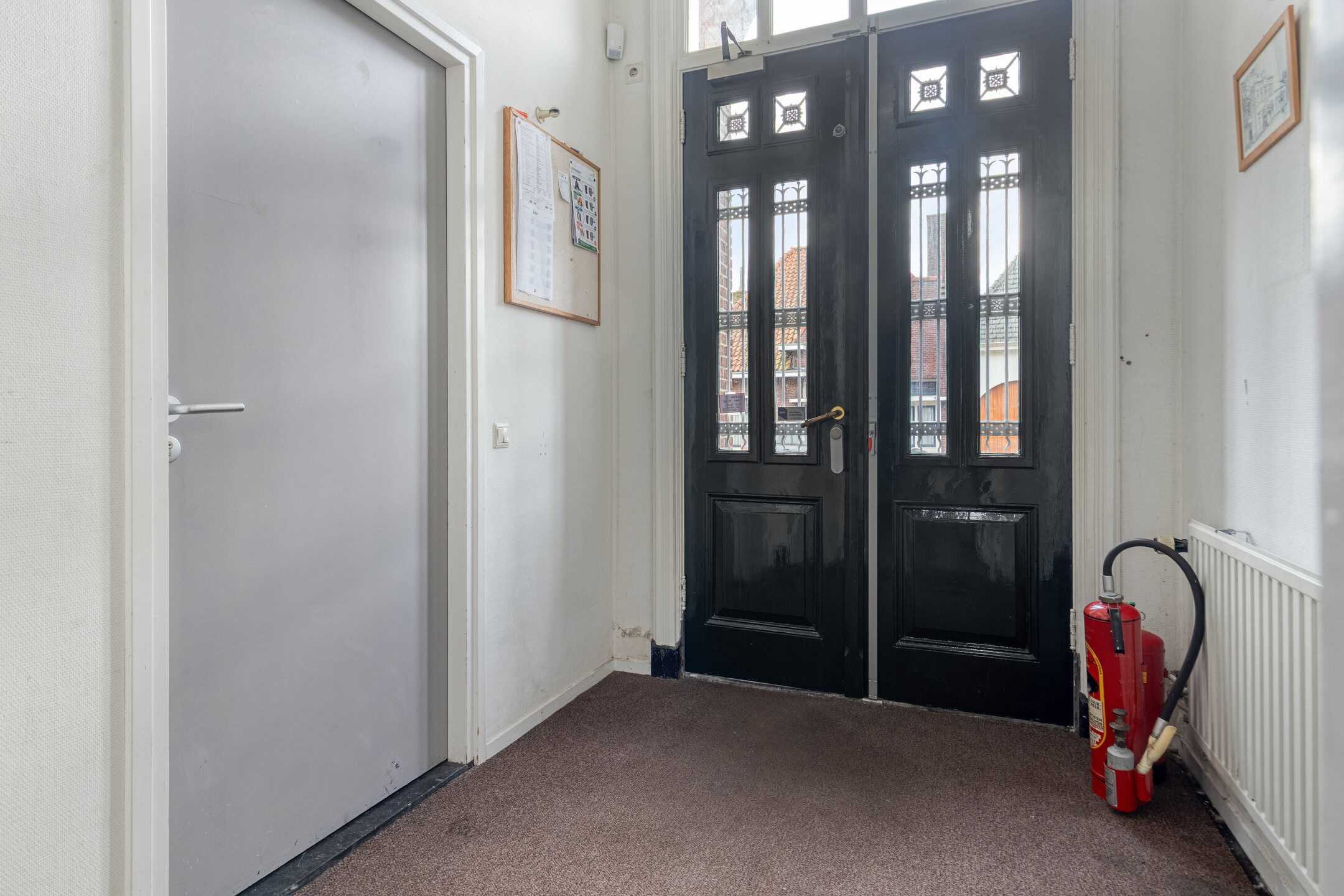 Entrance hall with staircase to the first floor; plastered walls, linoleum flooring, plastered ceiling