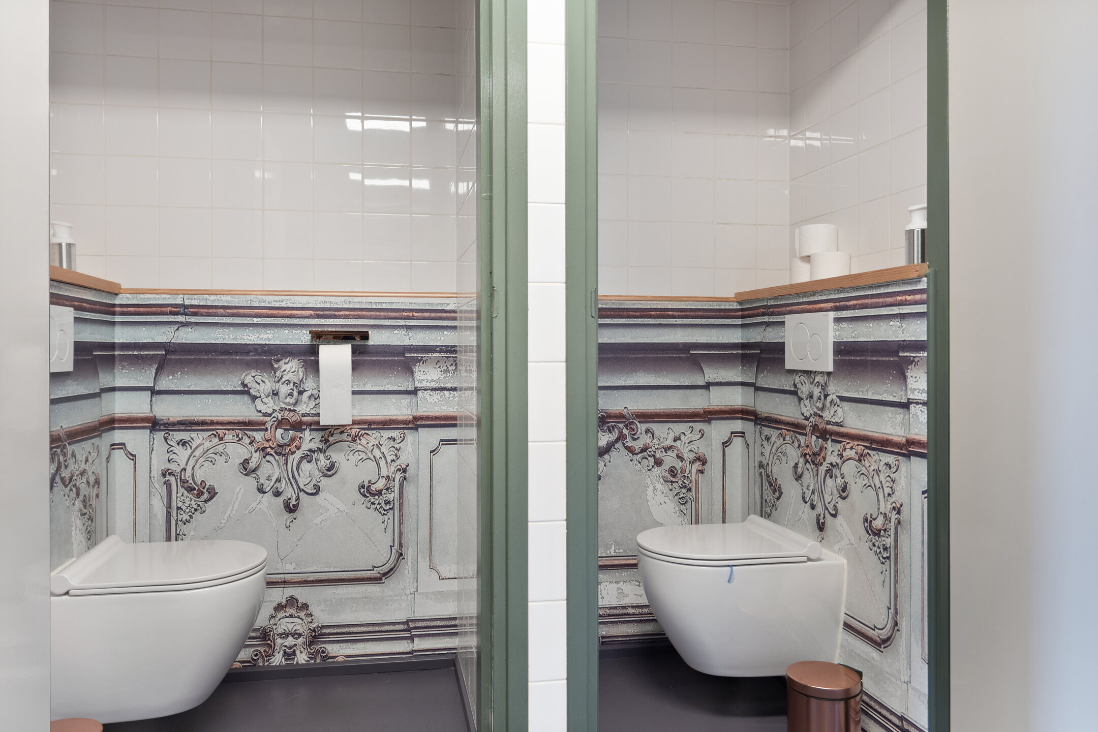 Tiled toilet with wall-mounted unit