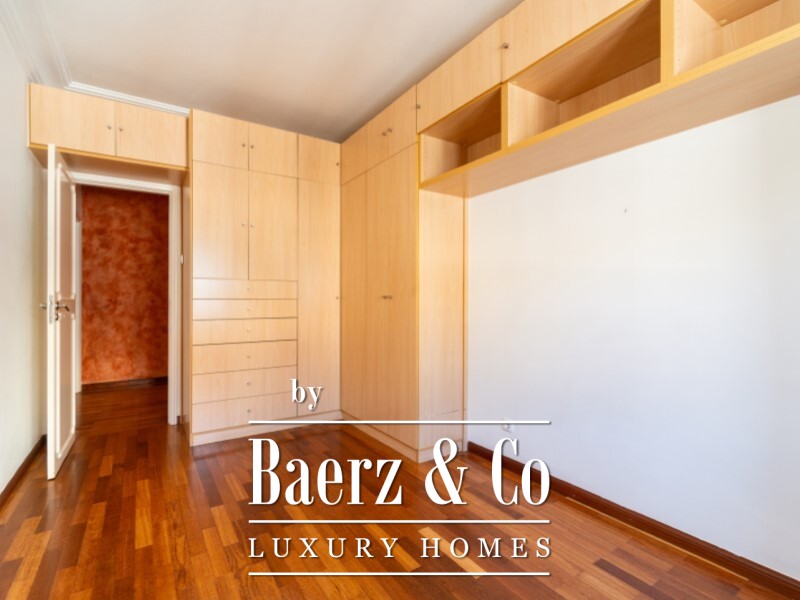 The three bedrooms offer distinct and versatile features: one with a built-in bookcase, another with a wardrobe, and the third with an enclosed sunroom and built-in storage cabinets. There is also a large closet for household linen, two full bathrooms, and a balcony.