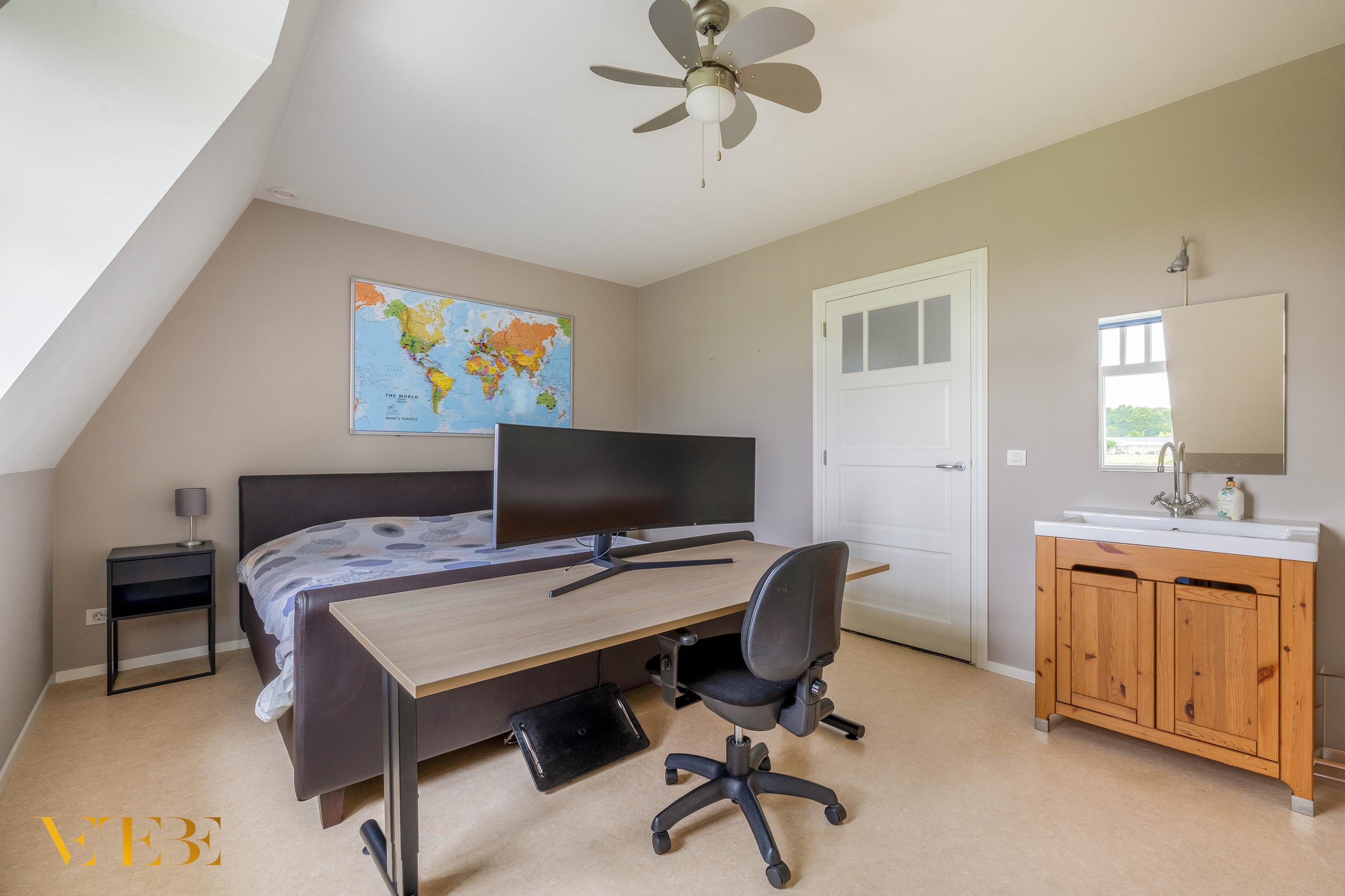 Bedroom 1 (approx. 18 m²): Novilon flooring, dormer window, built-in wardrobe, and washbasin unit with hot and cold water.