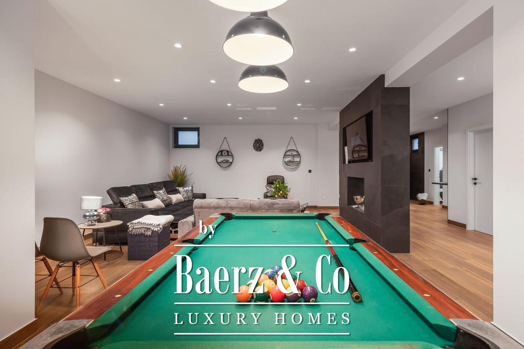 The architecture unfolds over three levels. The basement is dedicated to leisure, featuring fitness equipment, a billiard table, a generous sofa and television, a sauna with shower, a separate toilet, and storage. The ground floor welcomes with an open kitchen, dining, and living area, complemented by a bathroom and a guest bedroom. Upstairs, three bedrooms each enjoy private en-suite bathrooms and access to a dedicated laundry space, allowing for privacy and ease.