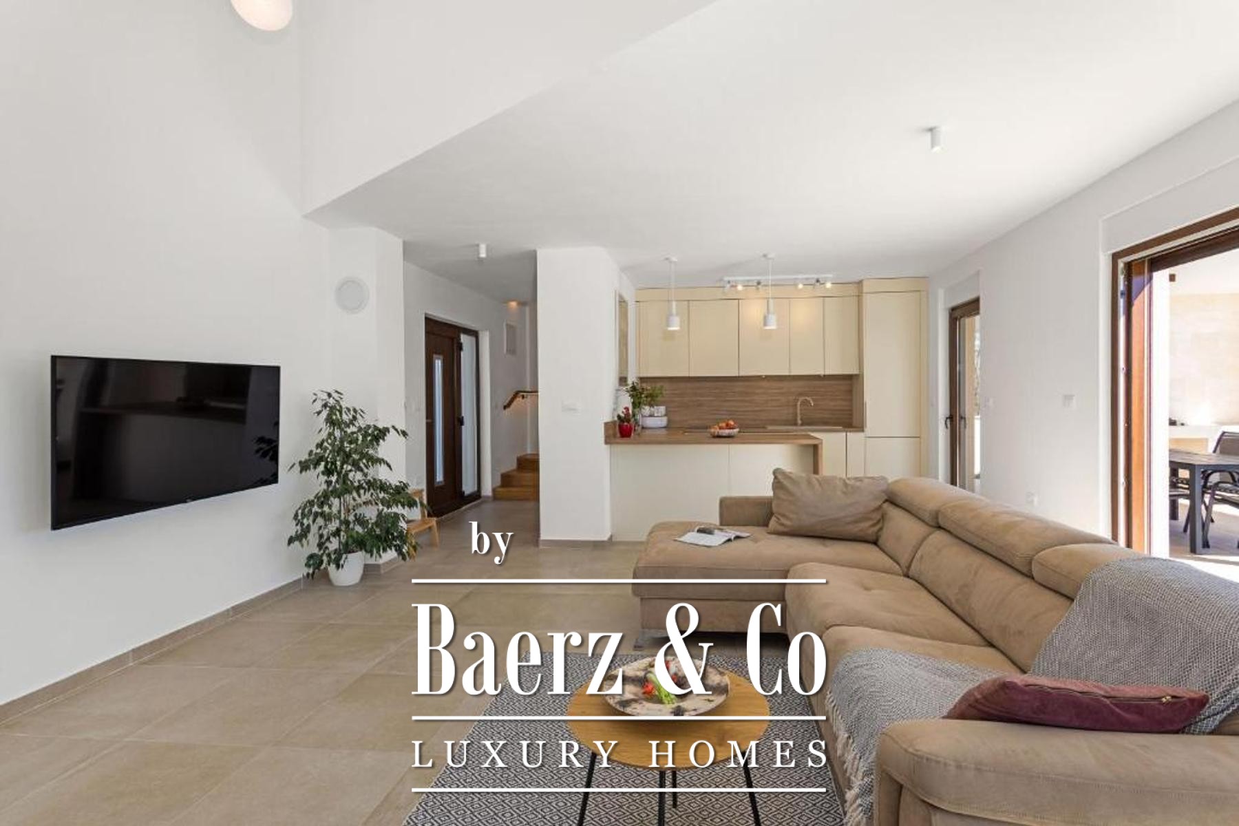 Modern villa Marčana stands quietly near Krnica, drawing the eye with its refined contemporary design and far-reaching sea views that embrace the surrounding islands. This property offers a living area of 100 m² elegantly set over two floors, designed for comfort and openness. The ground floor welcomes you with a bright, open-plan living room, kitchen, and dining space, where broad glass sliding doors invite natural light inside, seamlessly linking the interior with the outdoors. A bathroom and a dedicated storage room offer functionality on this level.