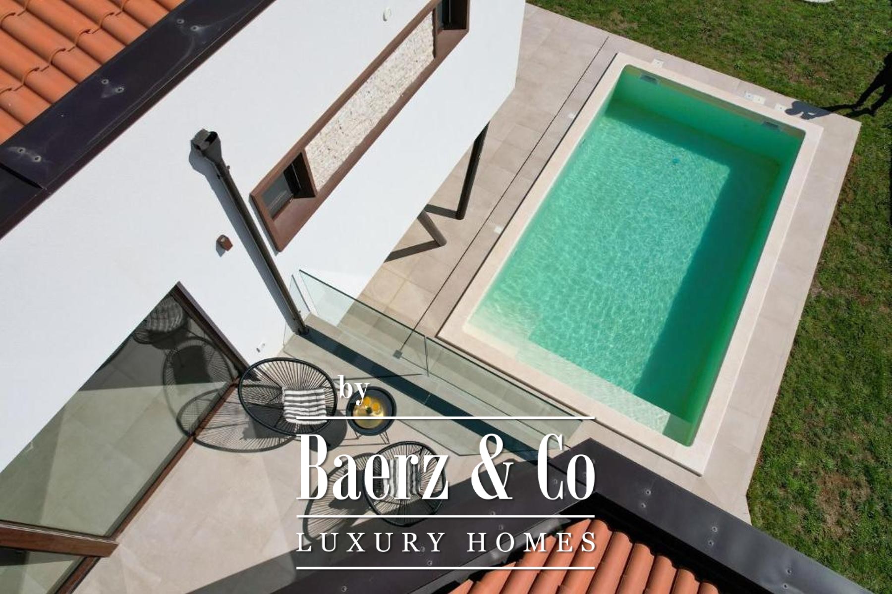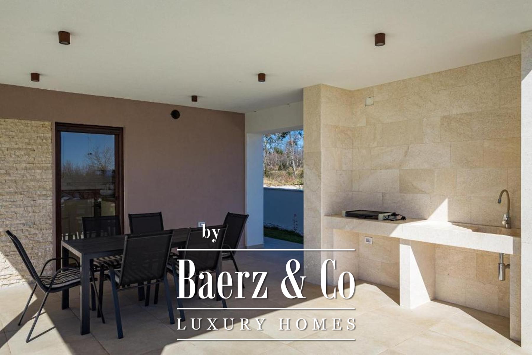 Outdoors, the landscaped 500 m² garden creates privacy and calm, centered around a swimming pool prepared for heating system installation. A covered summer kitchen, decorative planting, and an olive tree recall the Mediterranean setting, all framed by fencing, a stone wall, and sliding entrance gate. This modern villa Marčana offers a blend of tranquility, design, and proximity to the Adriatic coast.