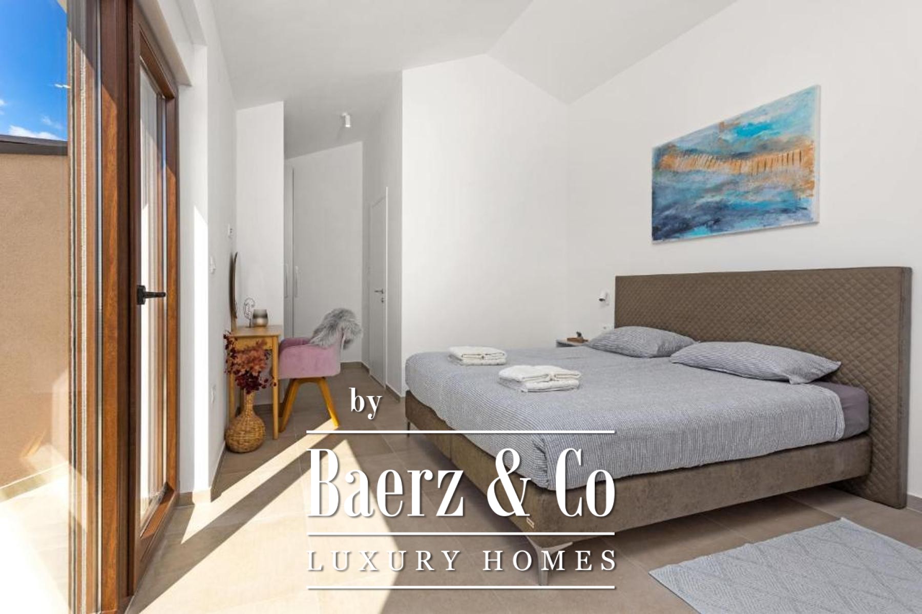 Upstairs, two serene bedrooms each feature an en-suite bathroom and private terrace, presenting beautiful views of the sea and fostering a sense of retreat. Underfloor heating and air conditioning provide year-round comfort, while Italian ceramic tiles and a crafted wood staircase speak to the quality of materials and thoughtful detailing throughout.