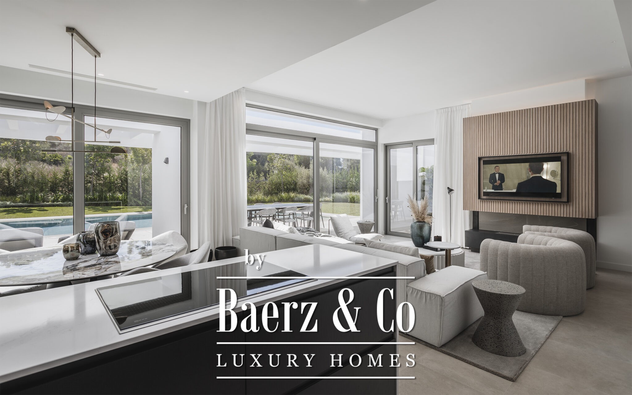 Villa Marbella in El Paraiso offers a tranquil and sophisticated setting among the Andalusian hills, surrounded by the exclusivity of a select gated community of just nine residences. This villa, with 626 m² of living space set upon an 808 m² plot, is designed for those seeking seclusion and easy proximity to Marbella, Estepona, and the coast. Villa Marbella in El Paraiso presents clean lines and generous south to southeast orientation, ensuring interiors are flooded with natural light. Floor-to-ceiling glazing connects open-plan living spaces and a sculptural, high-end German kitchen to terraces, private landscaped gardens, and a personal swimming pool. Each bedroom features en-suite bathrooms, elegant wood flooring, and muted, contemporary finishes—combining Villeroy & Boch fixtures, grey marble tiling, and thoughtful lighting. The residence privileges comfort and refinement, with amenities such as underfloor heating, hot and cold air conditioning, home automation, and a fireplace. Two covered parking spaces, intelligent movement sensors, and a multi-purpose basement—ideal for a gym or cinema—complete the offering. The surrounding El Paraiso enclave is serviced by renowned golf courses, international schools, boutiques, and fine dining, supporting a pace of life defined by discretion and access.