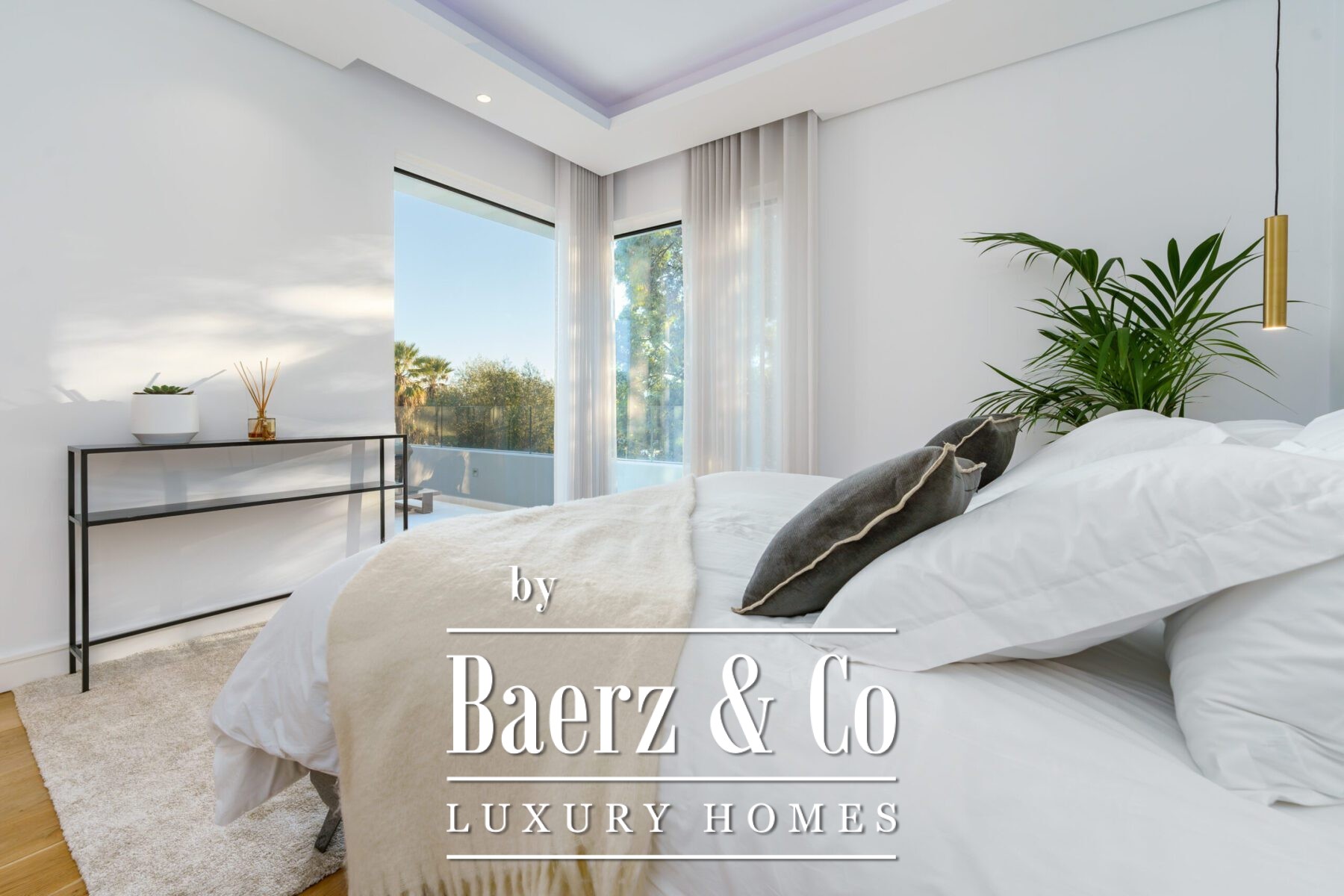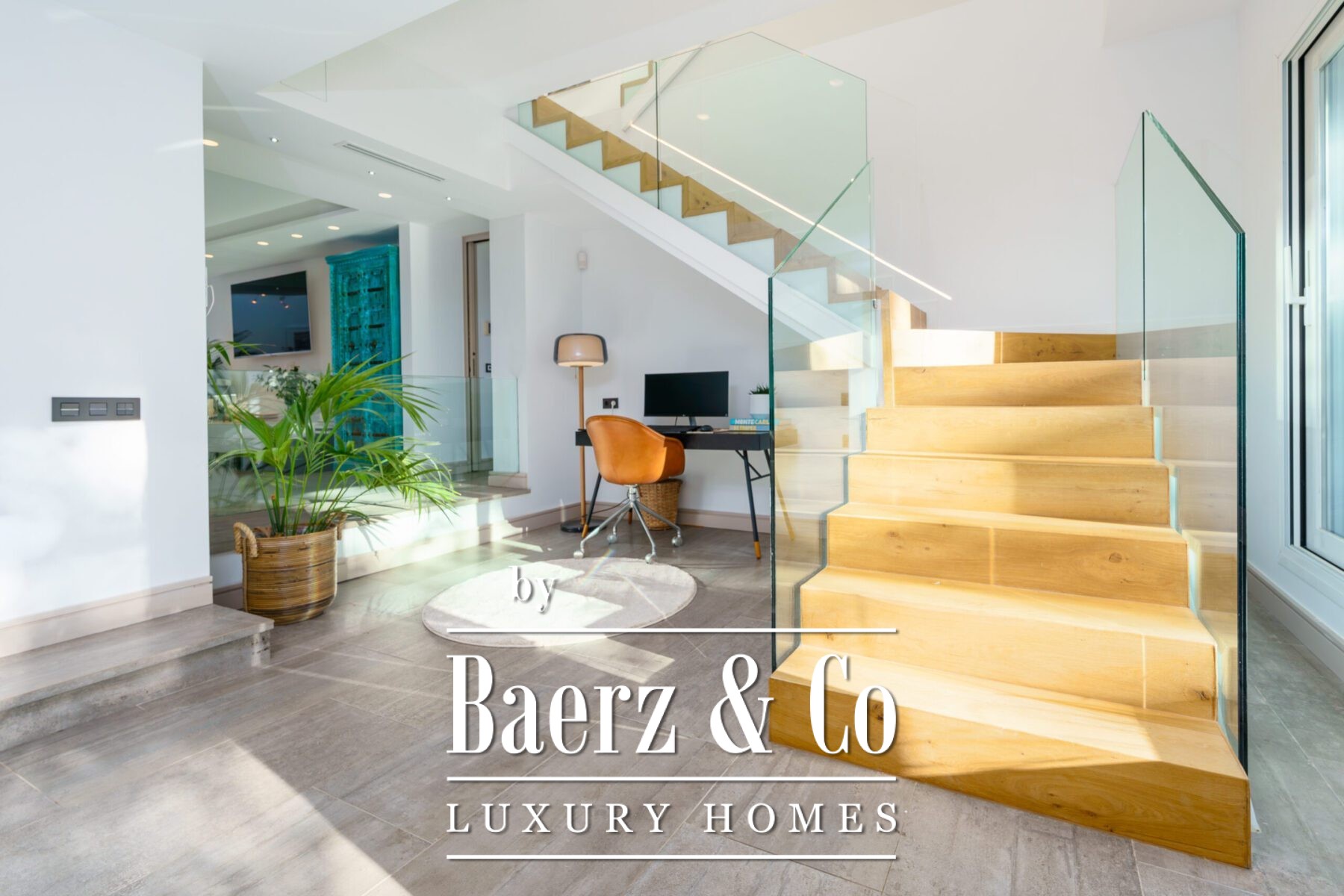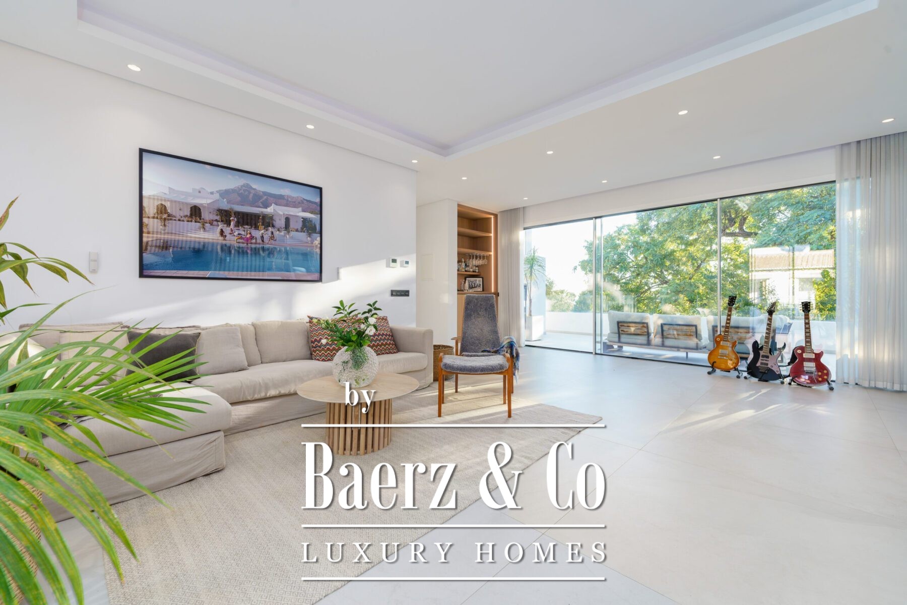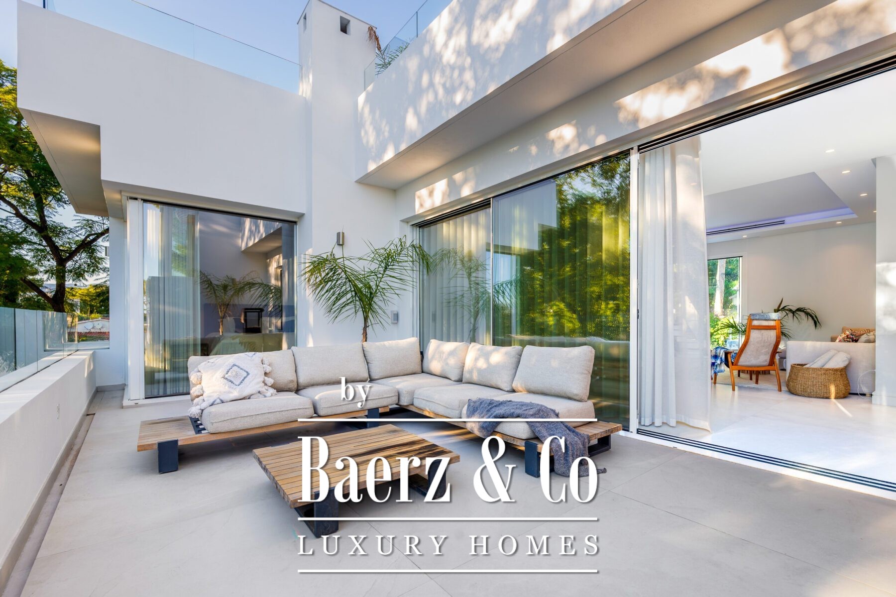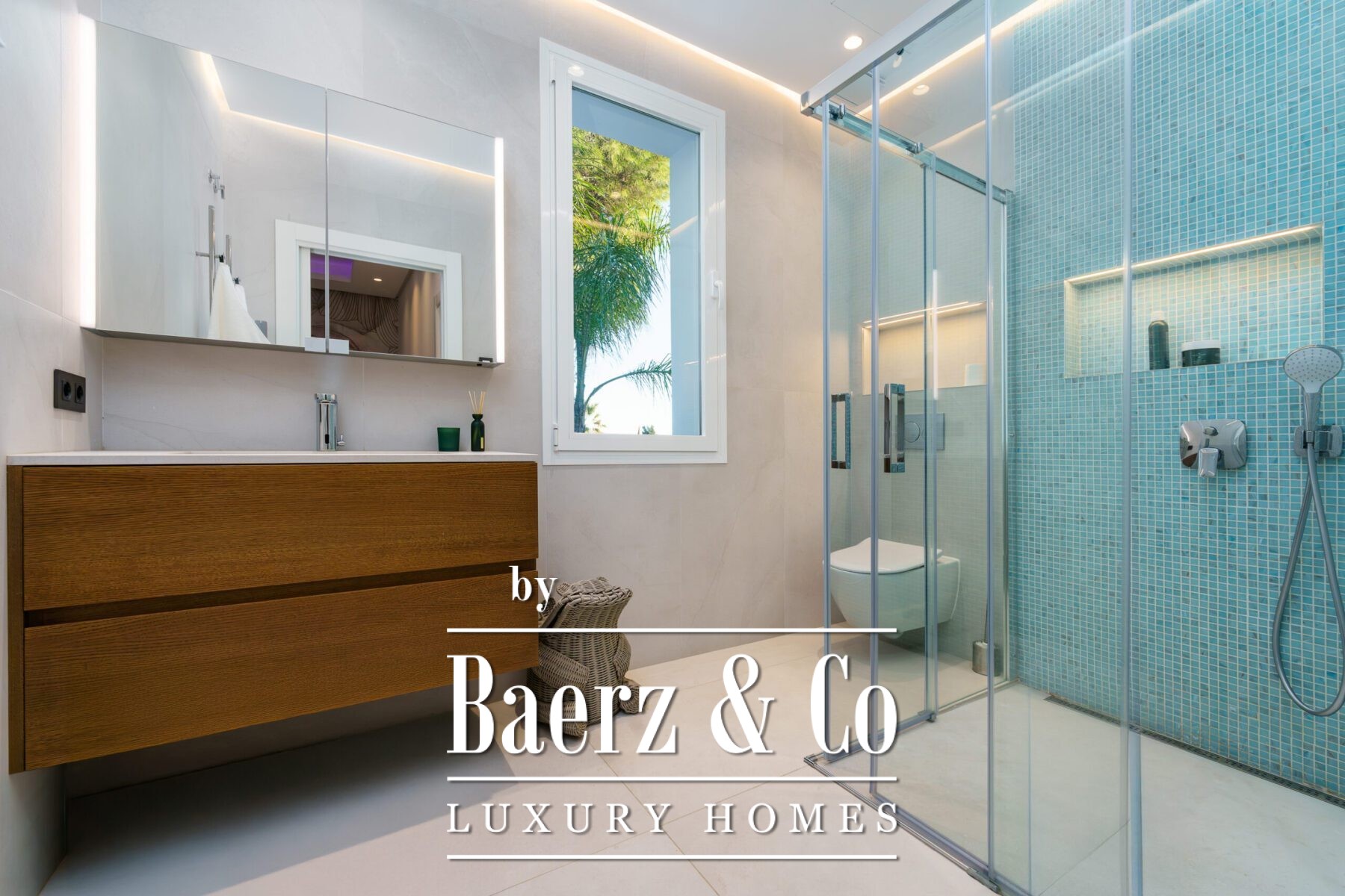 Set in lower Nueva Andalucía, the villa is moments from the beaches, Centro Plaza Shopping Center, distinguished schools, and celebrated golf clubs such as Las Brisas and Aloha Golf. The tranquil setting, comprehensive amenities, and modern elegance establish this property as a sophisticated choice for those seeking a luxury villa for sale in Nueva Andalucía.