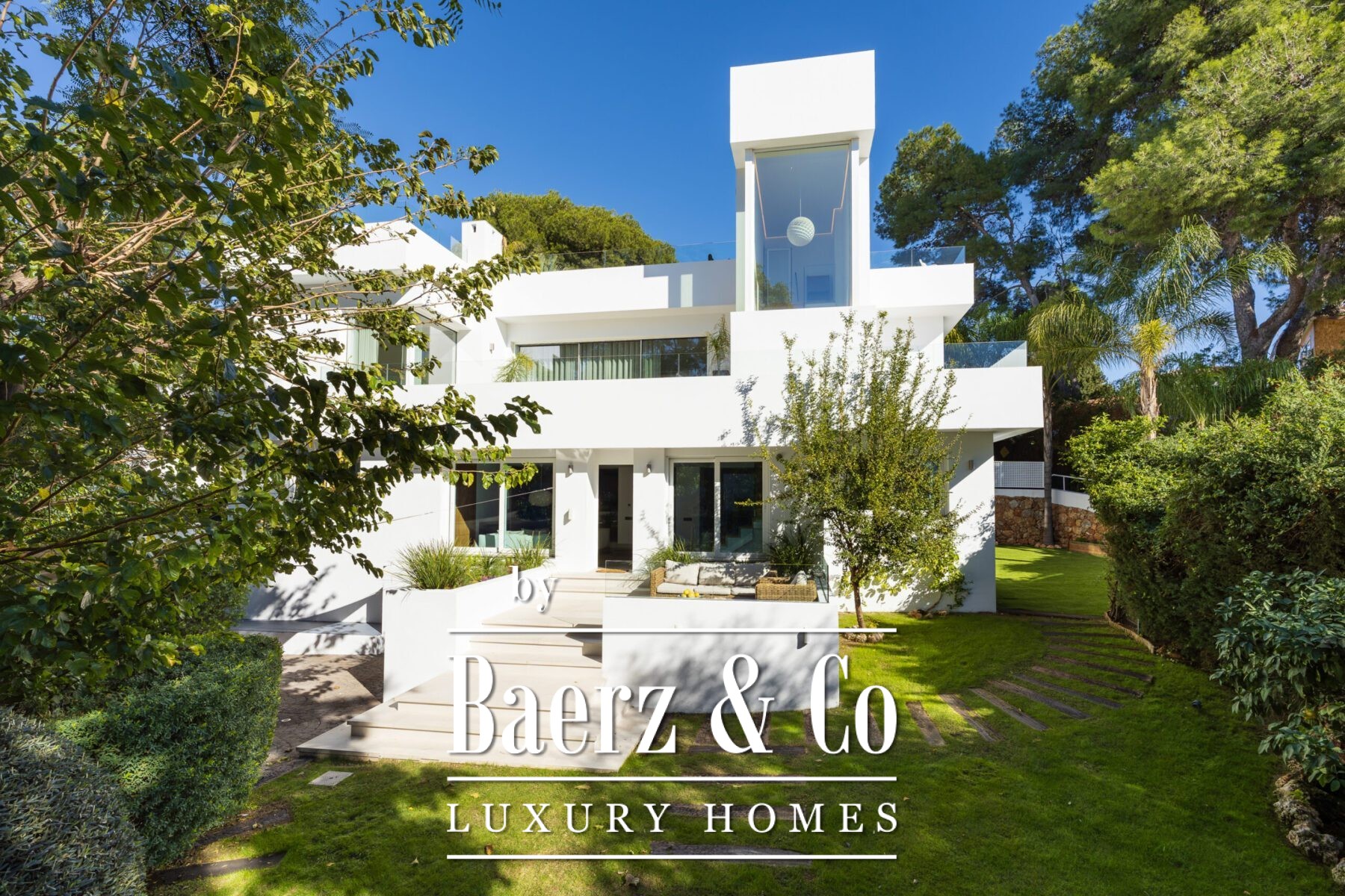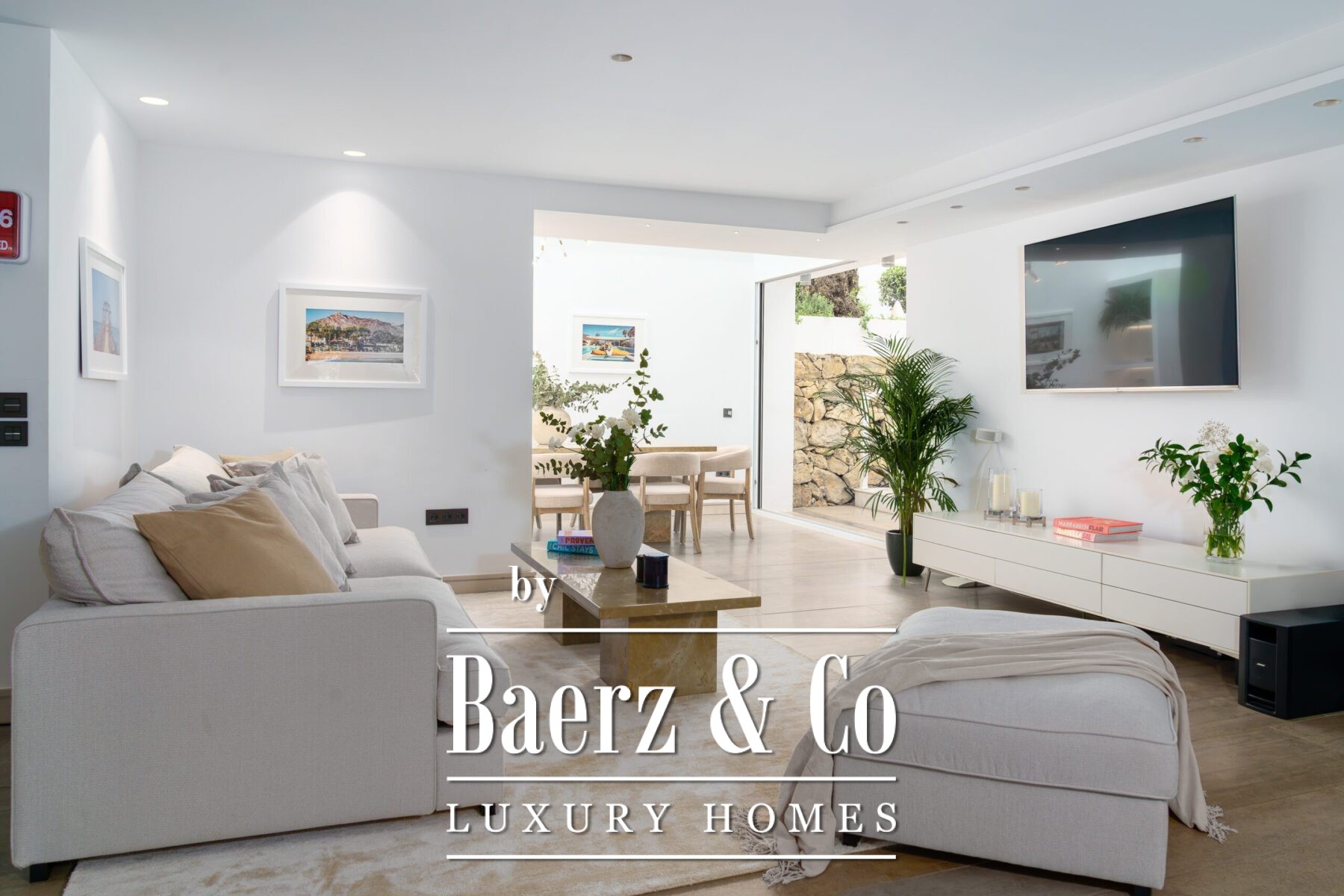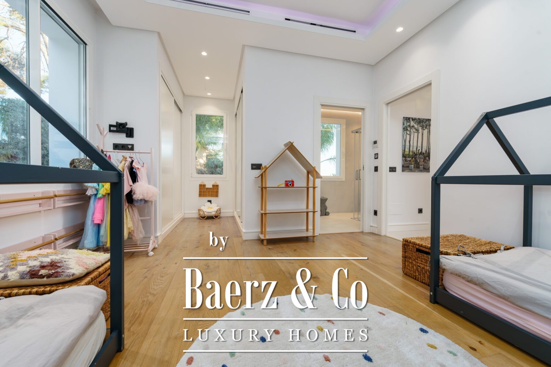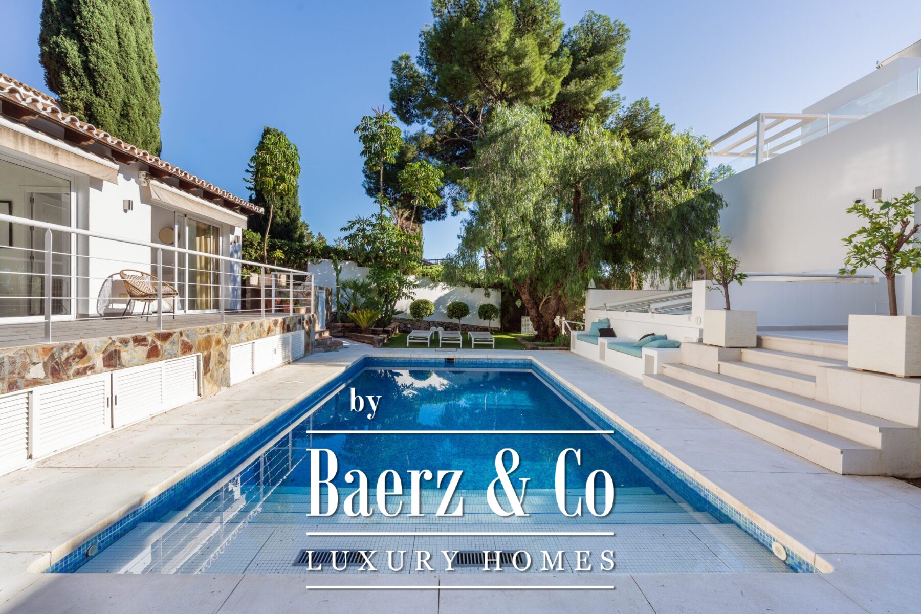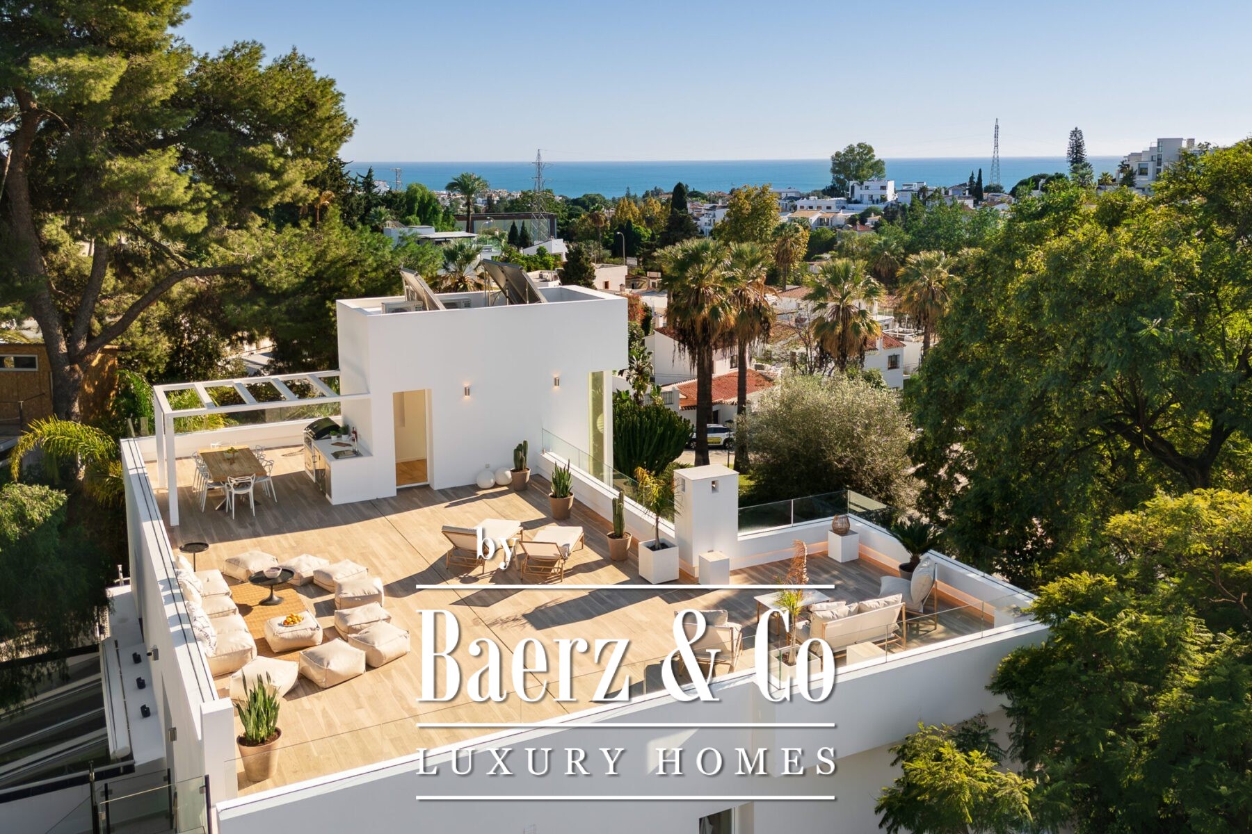 Set in lower Nueva Andalucía, the villa is moments from the beaches, Centro Plaza Shopping Center, distinguished schools, and celebrated golf clubs such as Las Brisas and Aloha Golf. The tranquil setting, comprehensive amenities, and modern elegance establish this property as a sophisticated choice for those seeking a luxury villa for sale in Nueva Andalucía.