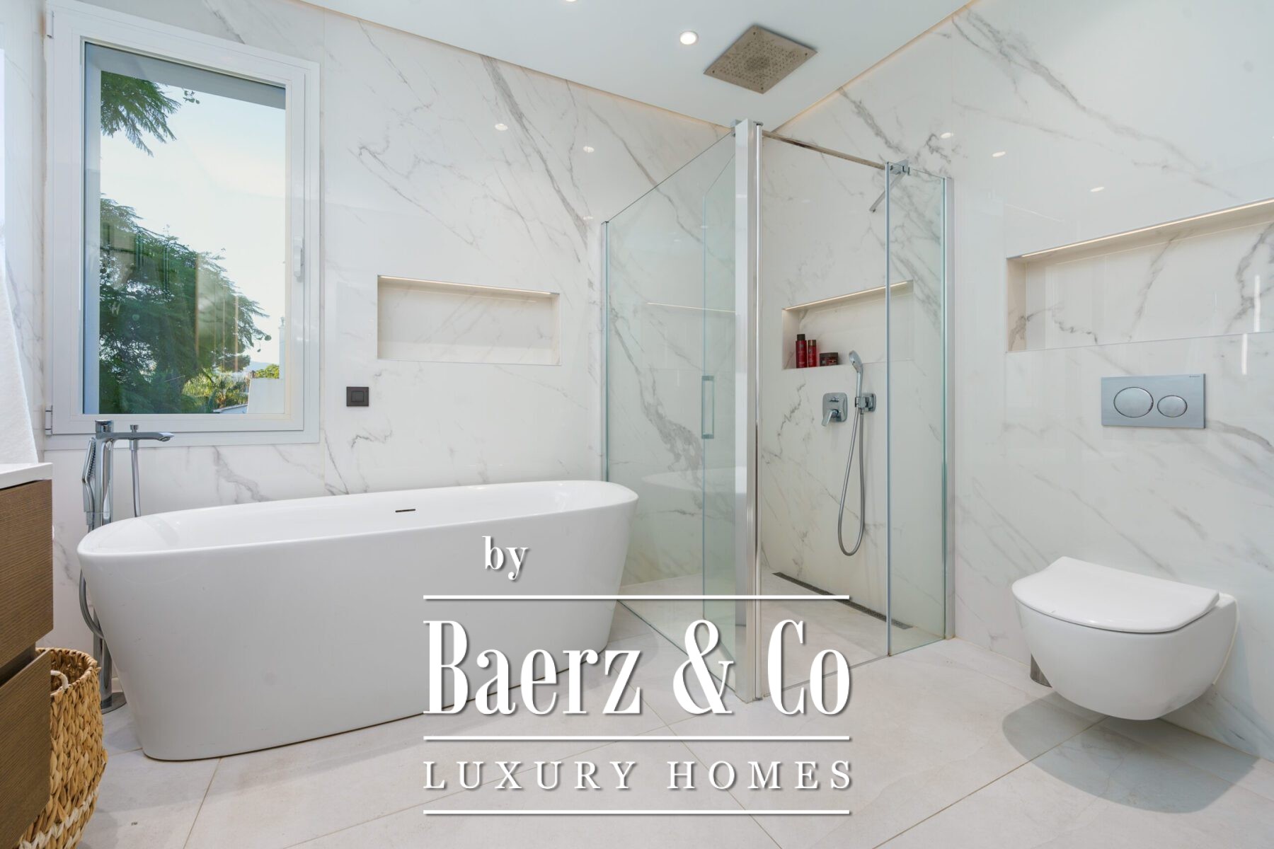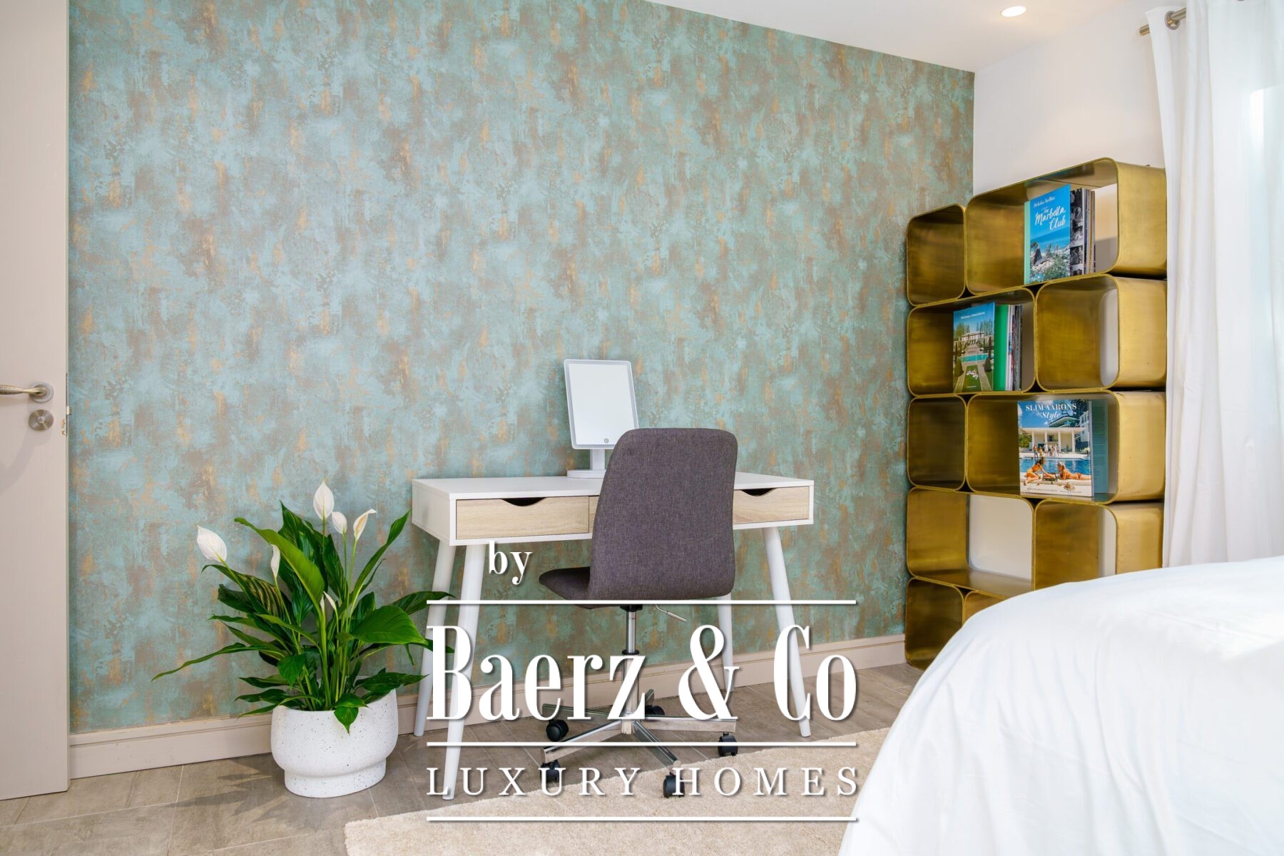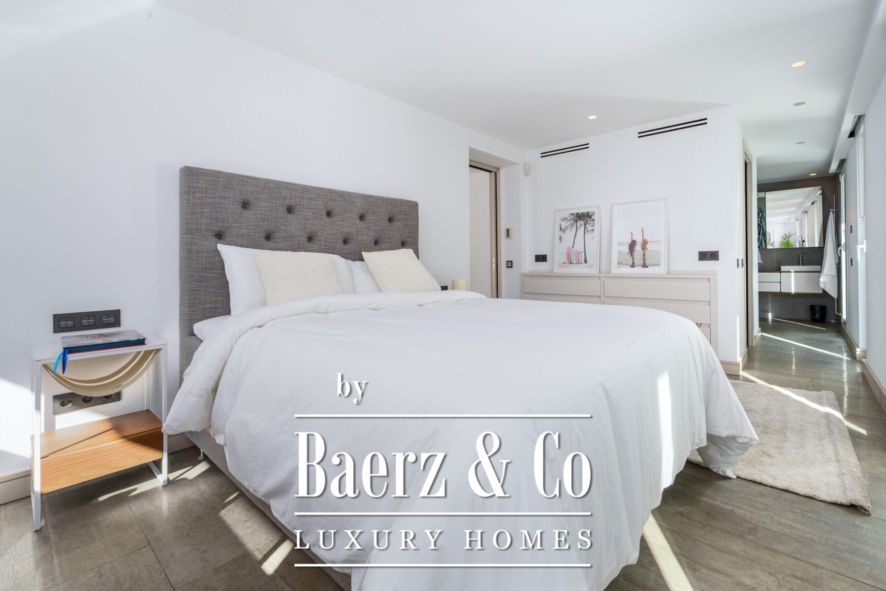Upstairs, the master suite offers a generous walk-in wardrobe and a refined en-suite bathroom. An additional guest bedroom on this floor features its own walk-in closet and en-suite, while the living area opens to the solarium terrace, framing partial sea and mountain views. The terrace provides ample opportunity for both relaxation and entertaining.