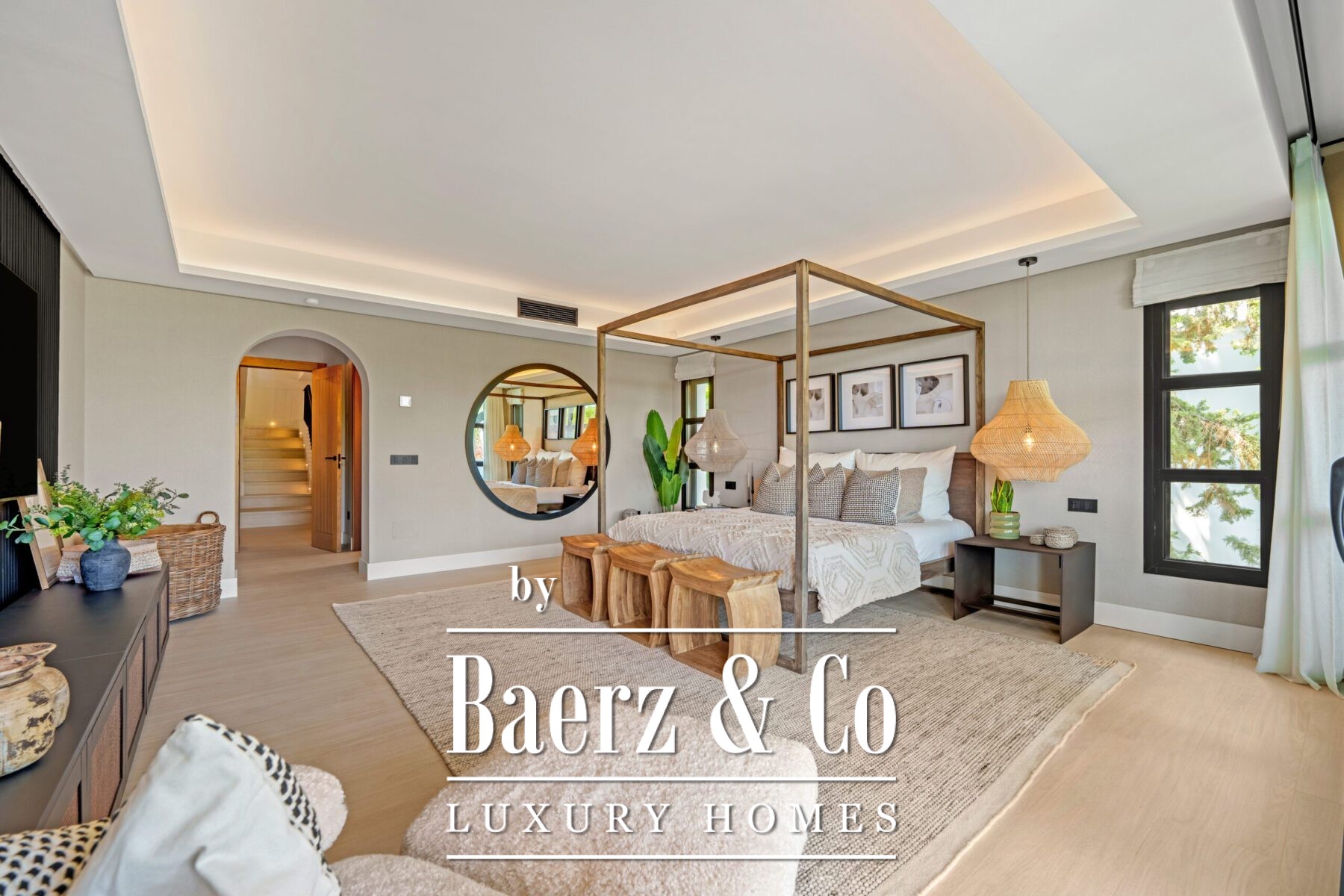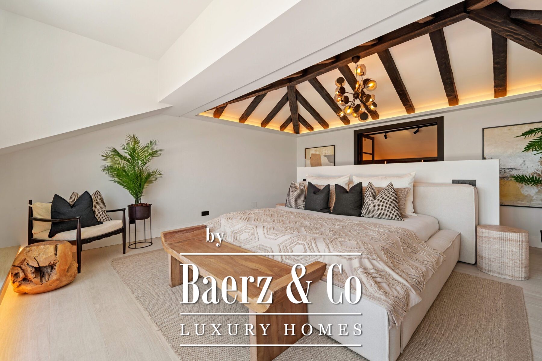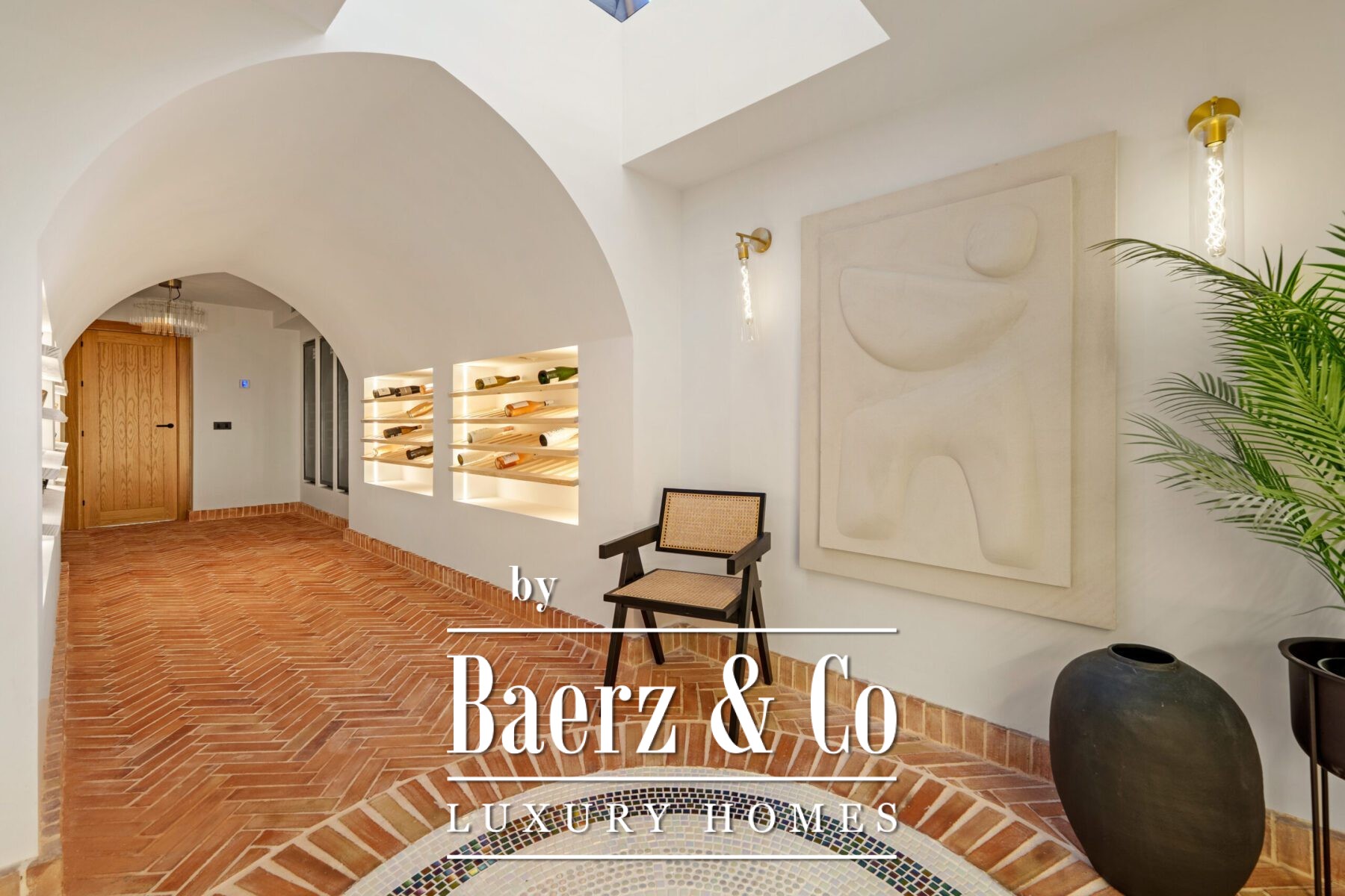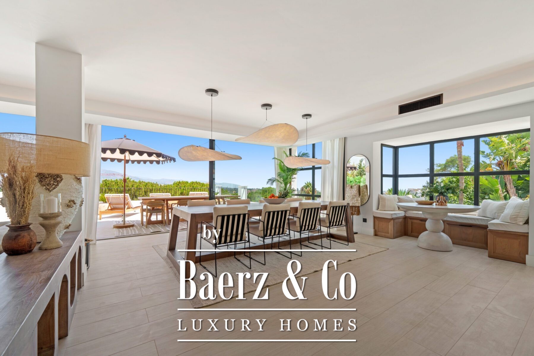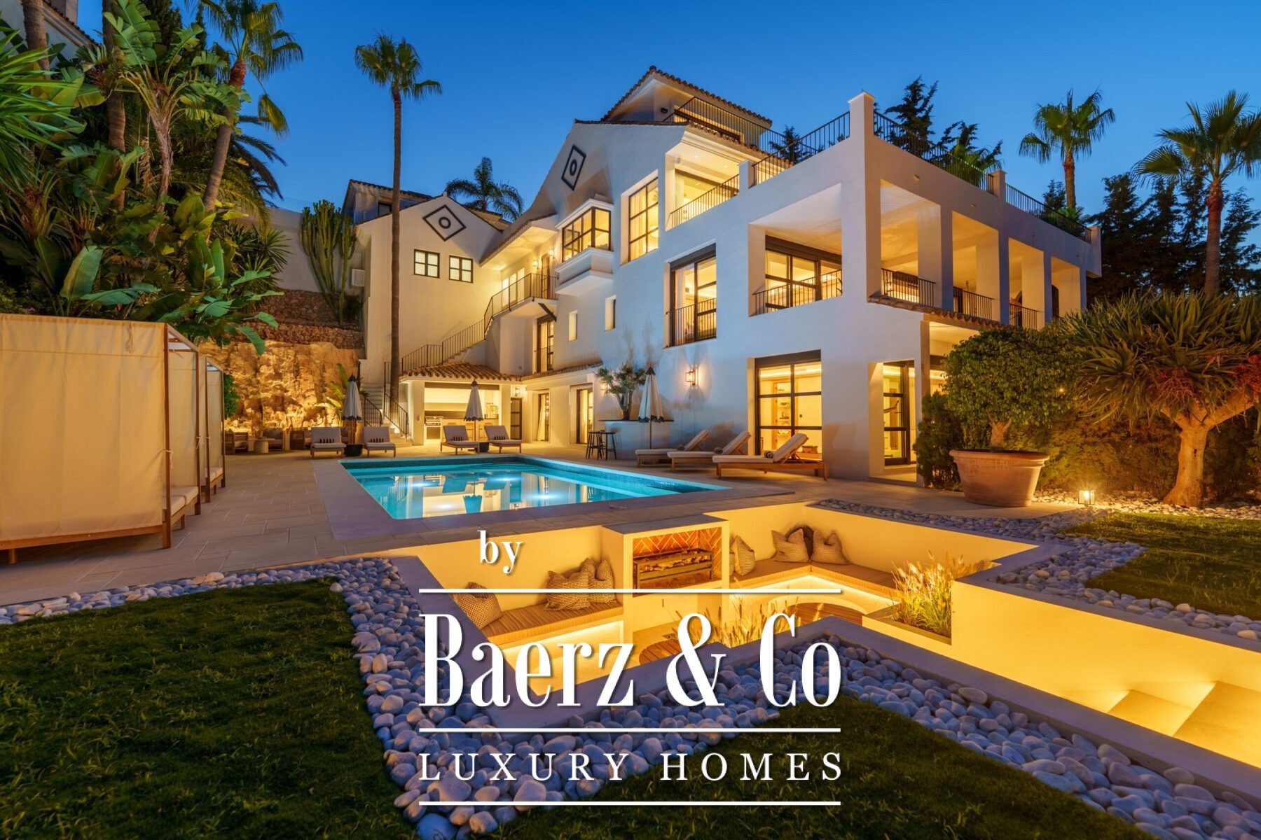 Outside, landscaped gardens embrace a private swimming pool and sunken lounge, adorned with ambient lighting and shaded spaces for tranquil reflection or social occasions. A multi-car garage, security features, and proximity to golf courses, the beach, Puerto Banús, and Marbella’s amenities complete the offering.