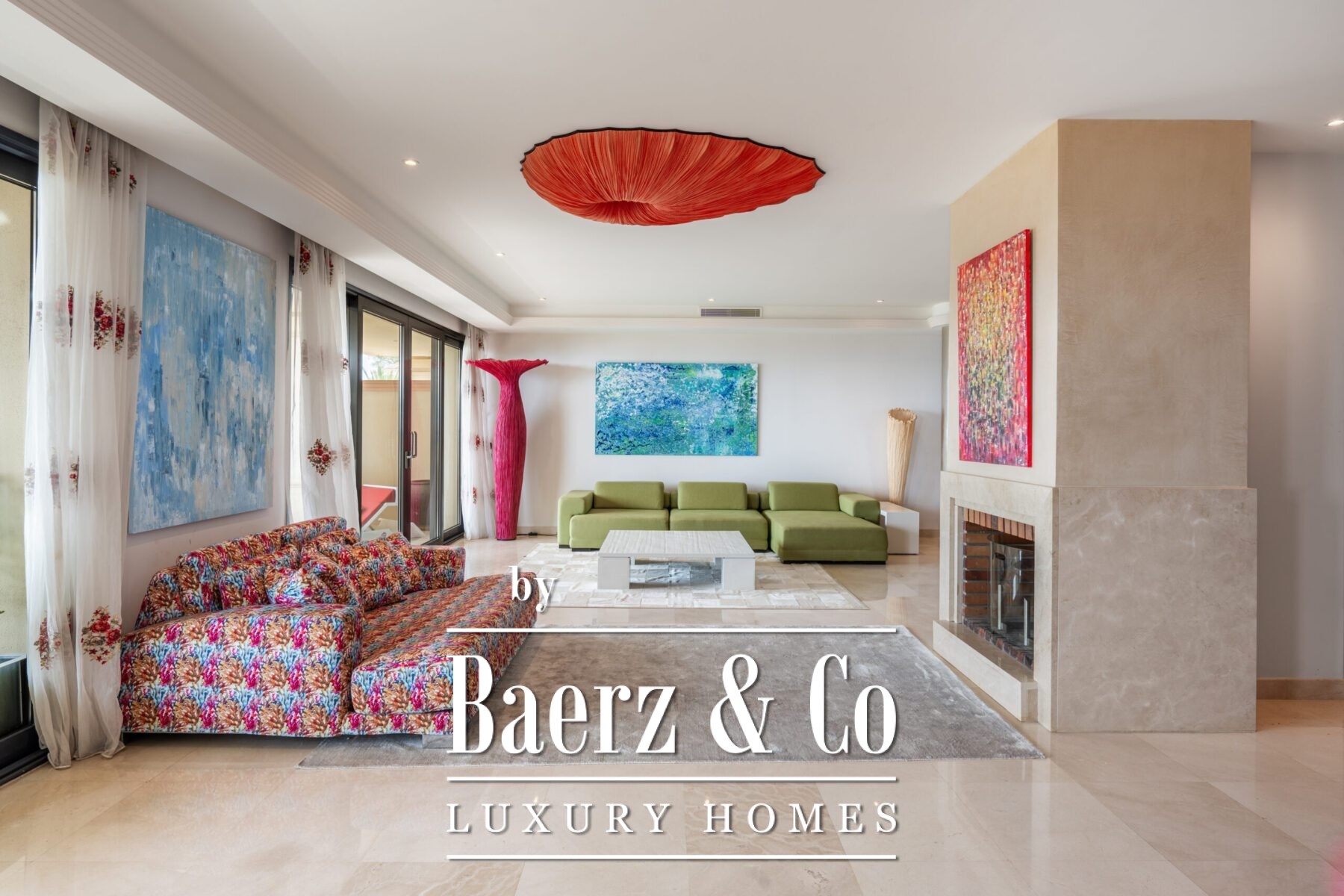 The main living space is generous, inviting both quiet retreat and effortless entertaining. Wide sliding doors extend the living area onto covered and open terraces, allowing a seamless transition between interior comfort and the expansive outdoors. A fully fitted kitchen, paired with a secondary service entrance and potential for a discreet dirty kitchen, is designed for those who value both function and form.