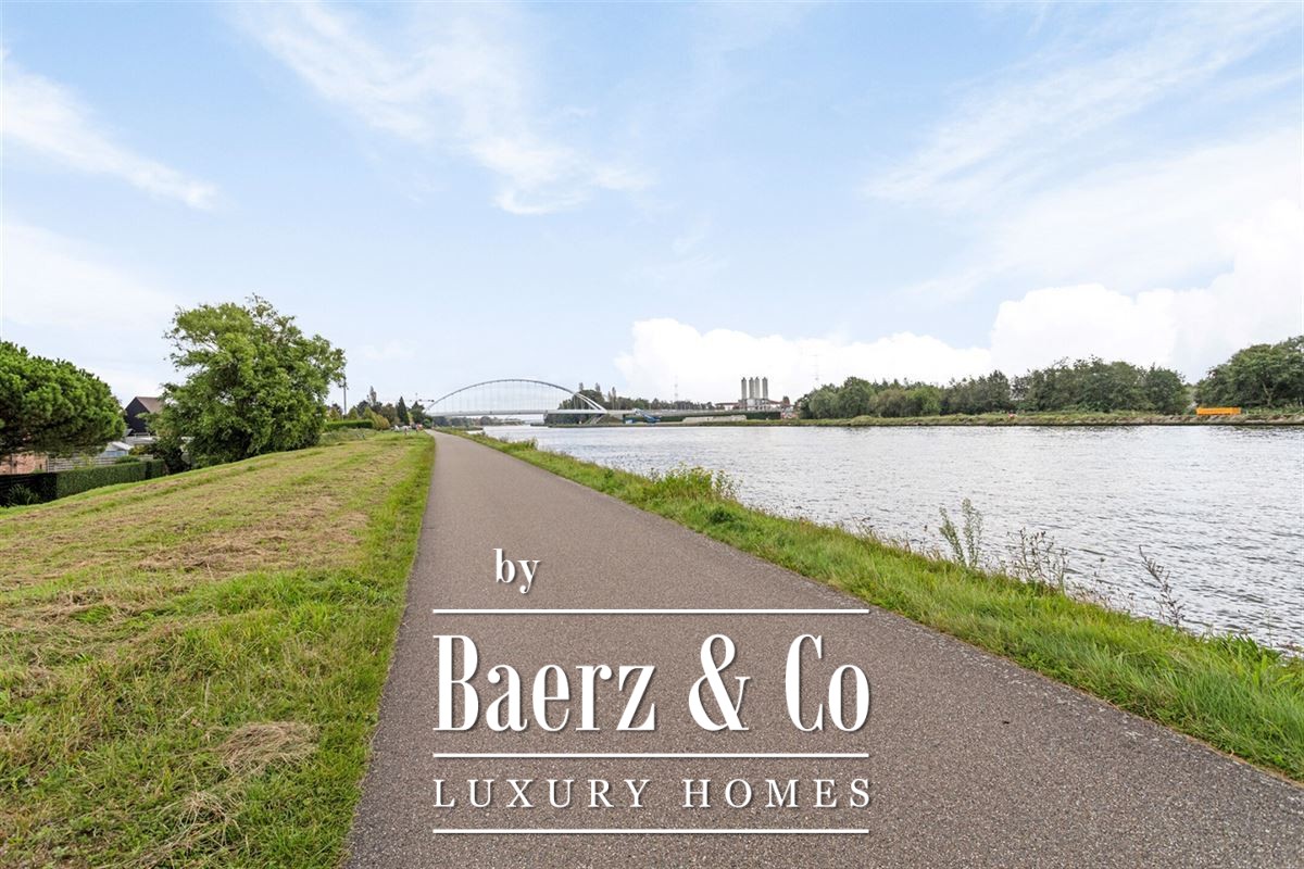 De unieke hoofdslaapkamer (ca 21m²) biedt toegang tot een open zonneterras met luifel van maar liefst 24m², met een prachtig panoramisch uitzicht op het kanaal en de omgeving.