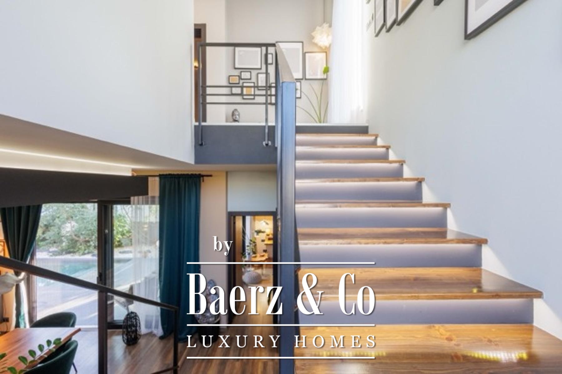 On the ground floor, an expansive living room anchors the home, featuring bespoke furnishings sourced from Germany, Italy, and the Czech Republic. The interplay of soft color palettes, a statement fireplace, and generous glazing blurs indoor and outdoor life, opening to the private pool and surrounding terrace. Adjoining rooms include a thoughtfully equipped kitchen, a guest bedroom, a toilet, additional service spaces, and direct garden access.
