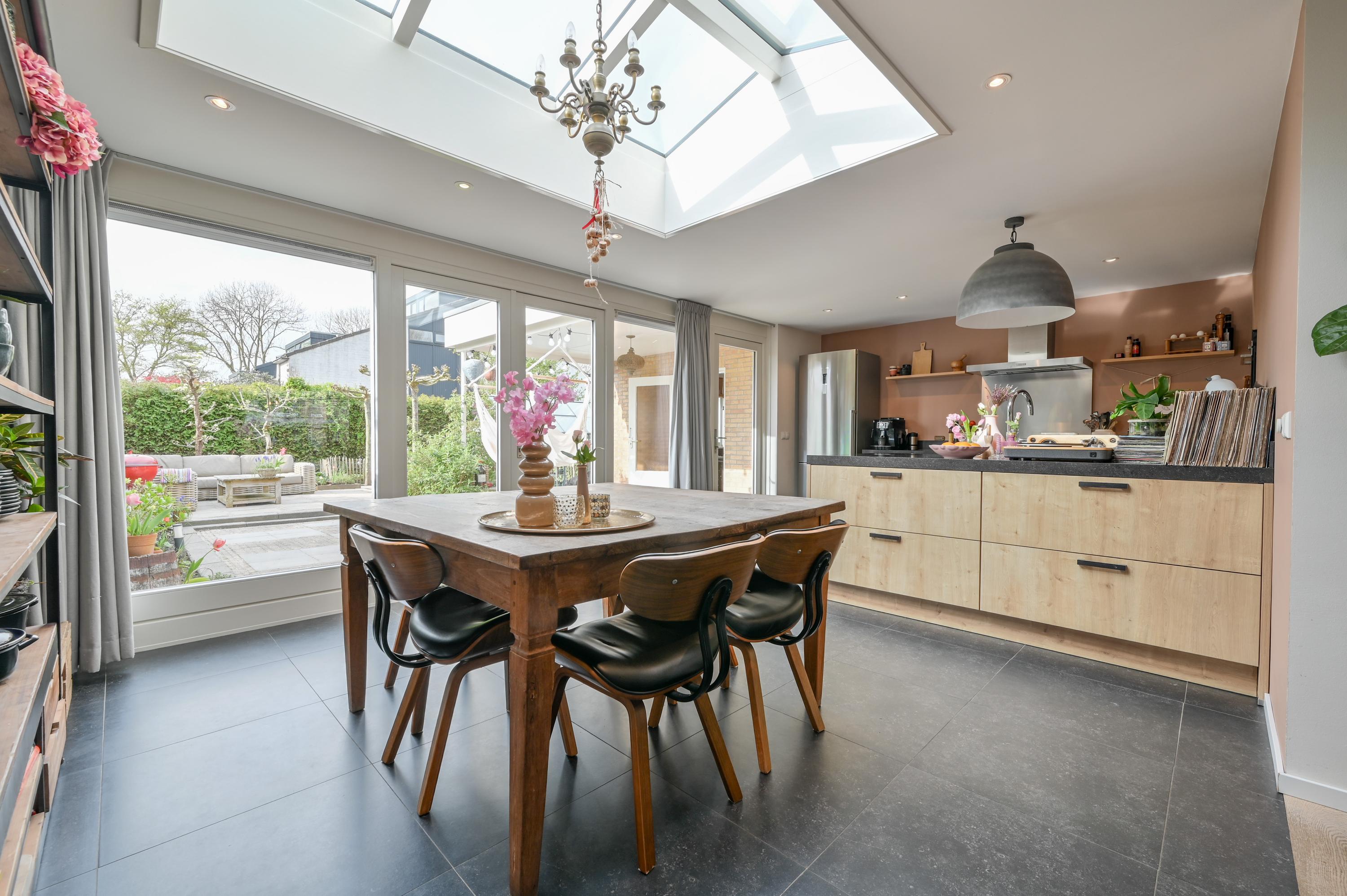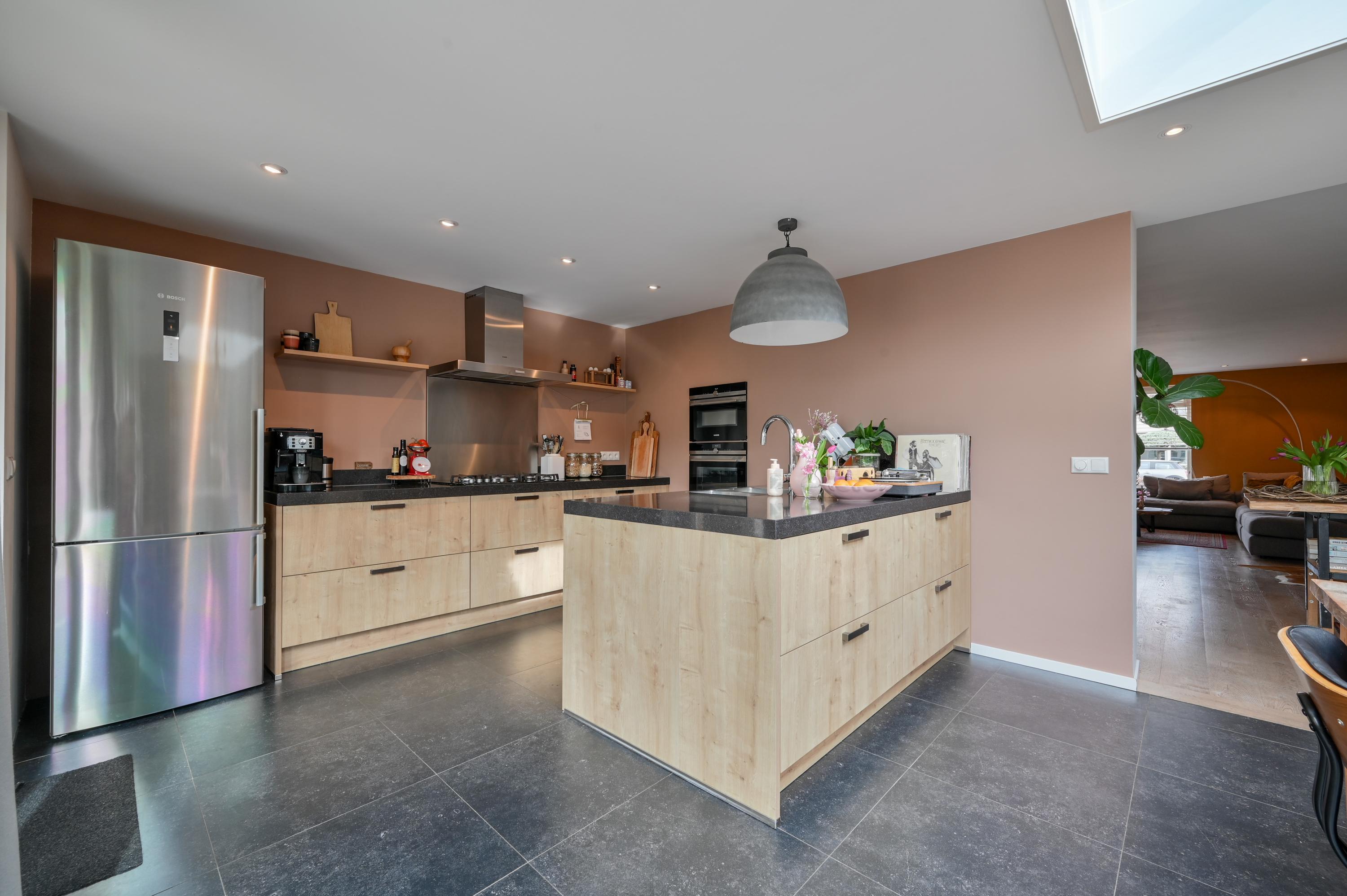 At the rear, the house has been extended to create a spacious open-plan kitchen that truly forms the centerpiece of the home. A skylight allows beautiful natural light to flood in throughout the day. The tiled floor with underfloor heating ensures comfort in every season. The kitchen is both practical and luxurious, featuring a kitchen island with sink, dishwasher, and a Grohe boiling water tap. On the opposite side, you’ll find the cooking area with a 5-burner gas stove, oven, and combination oven. The kitchen easily accommodates a large dining table, making it the perfect setting for long dinners and social gatherings. French doors and a separate door provide direct access to the garden, seamlessly connecting indoor and outdoor living.