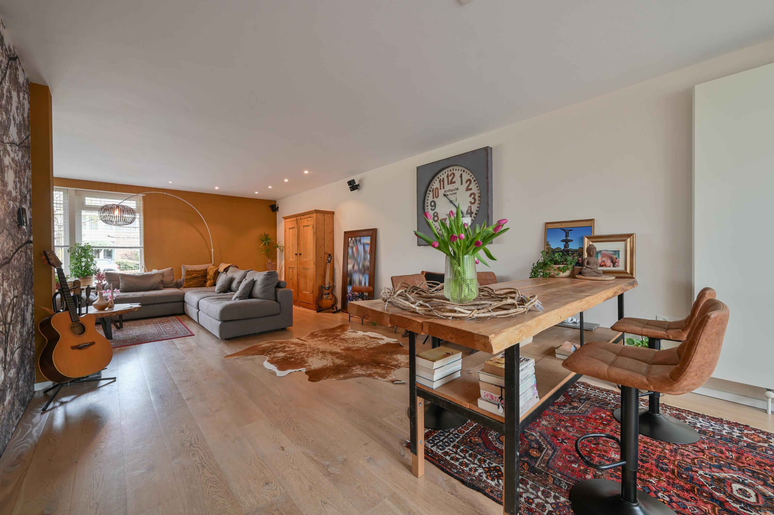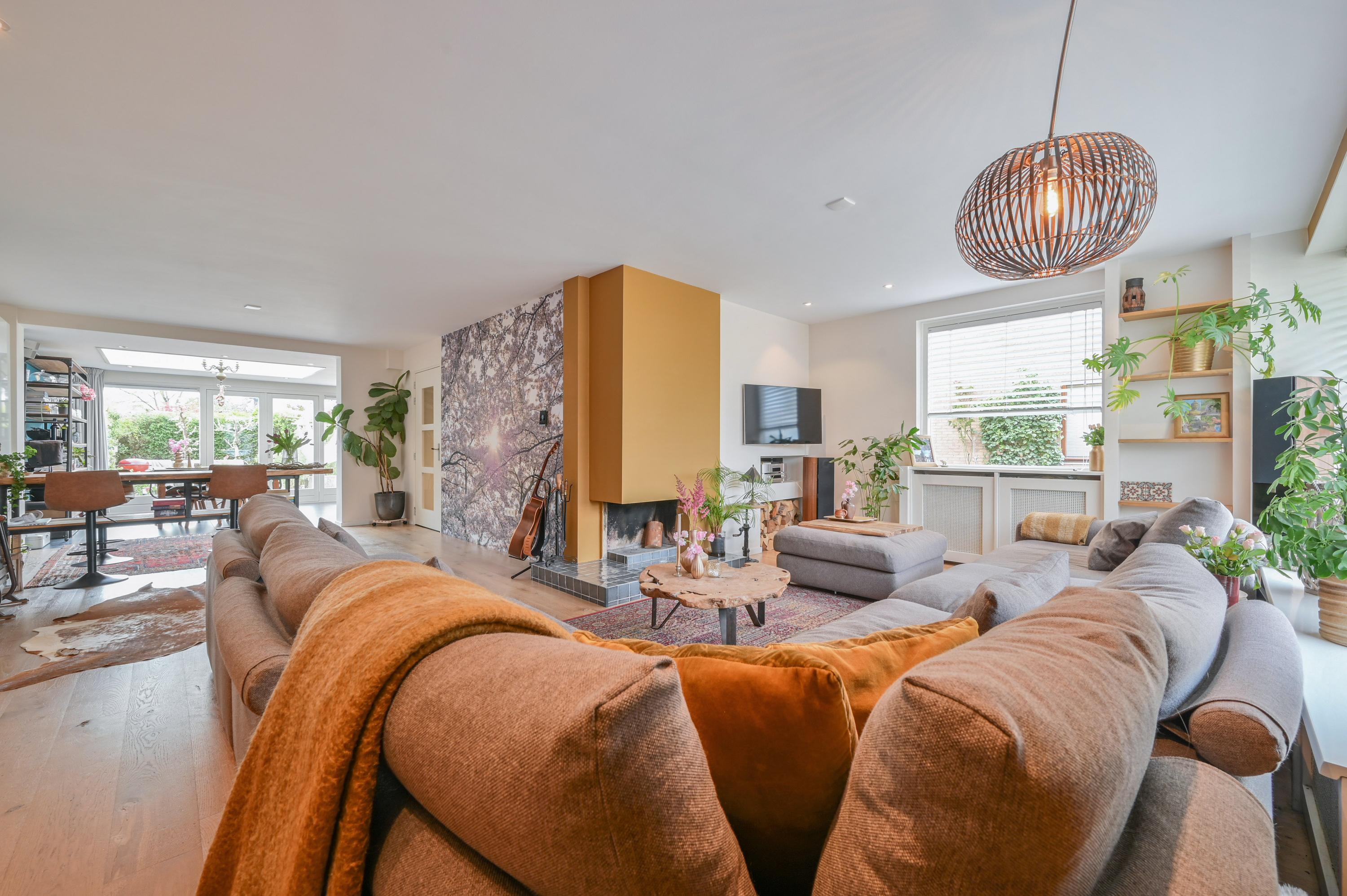 The living room has a cozy L-shaped layout. At the front, a large window provides pleasant natural light and an open connection to the quiet street. The seating area with fireplace forms the warm heart of the home — a place to truly unwind. On the side, a large window offers unique views over the meadows, beautifully blending indoor and outdoor living. The wooden flooring enhances the calm and timeless atmosphere.