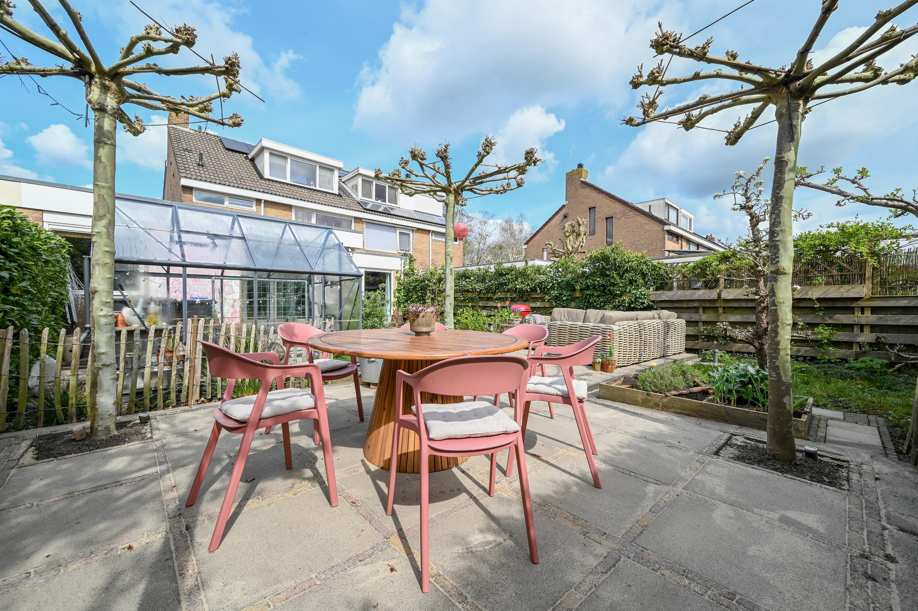 The garden has been thoughtfully landscaped with a mix of terraces, borders, and greenery. A small greenhouse offers space for homegrown produce and hobbies, while fruit trees add a playful and natural character. The layout provides multiple seating areas, each offering a different experience of sun and privacy.