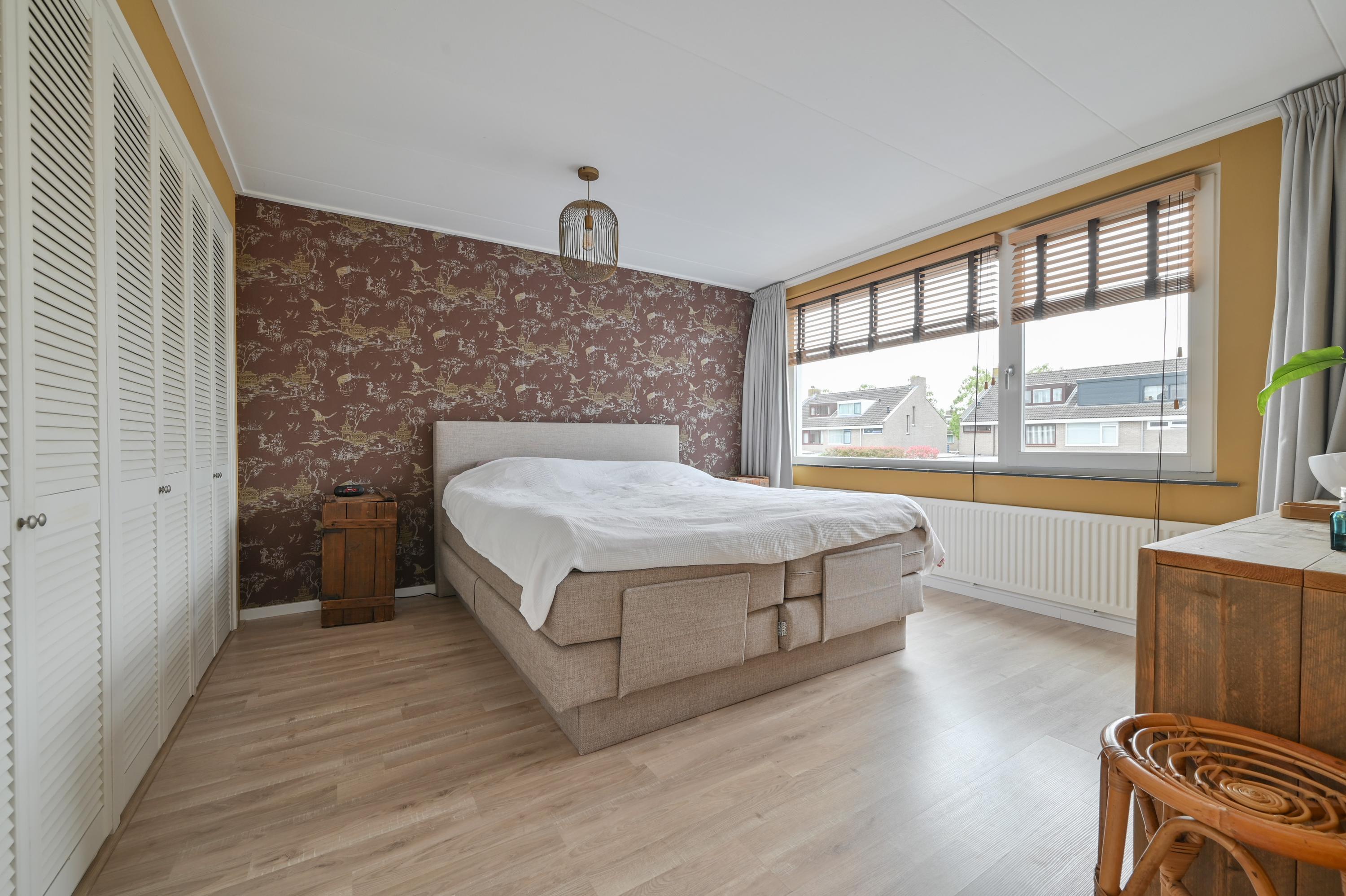 At the rear is a generous bedroom with a full-length built-in wardrobe. An extra insulated wall towards the adjacent room ensures peace and privacy, making this a comfortable and quiet master bedroom.