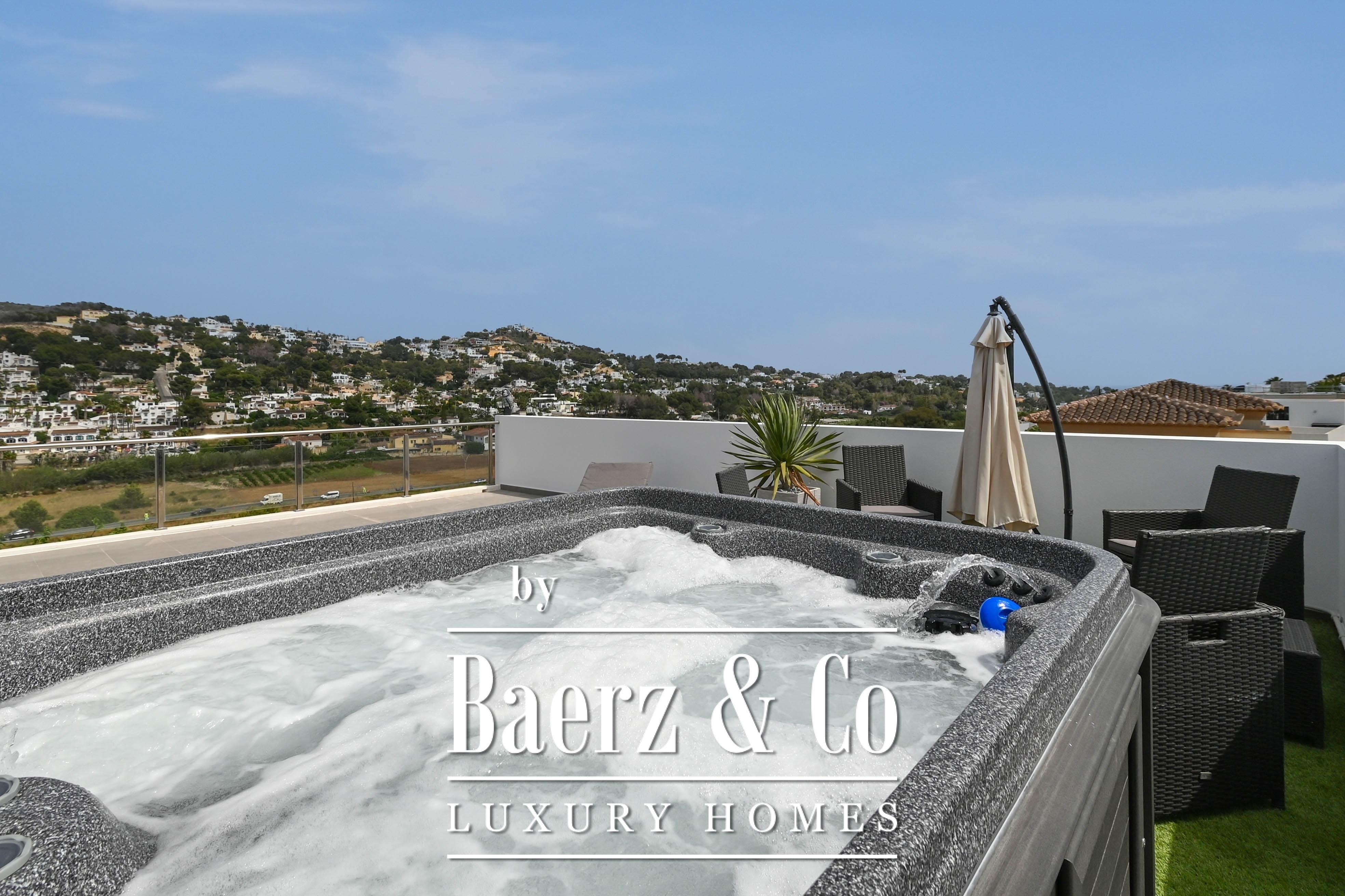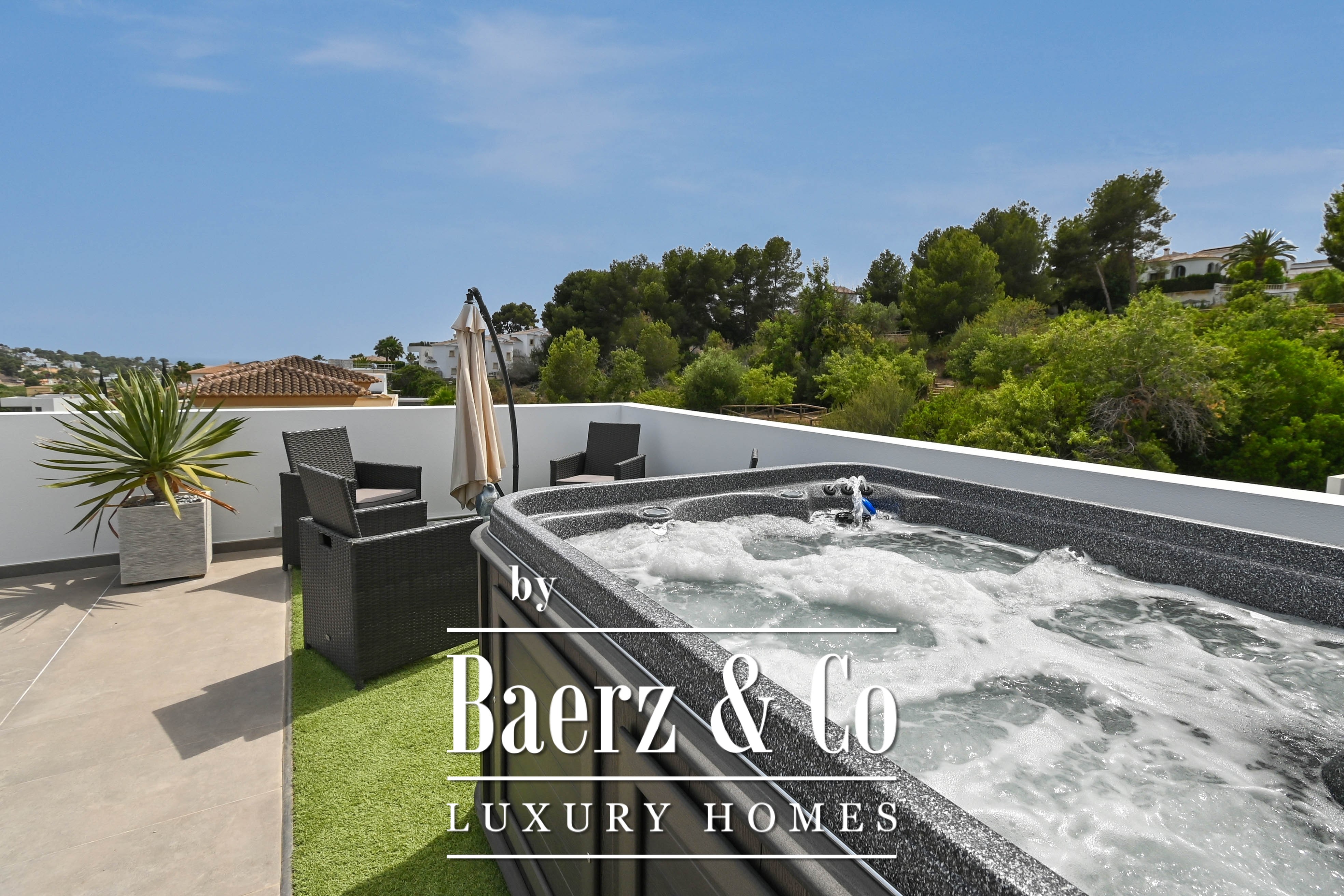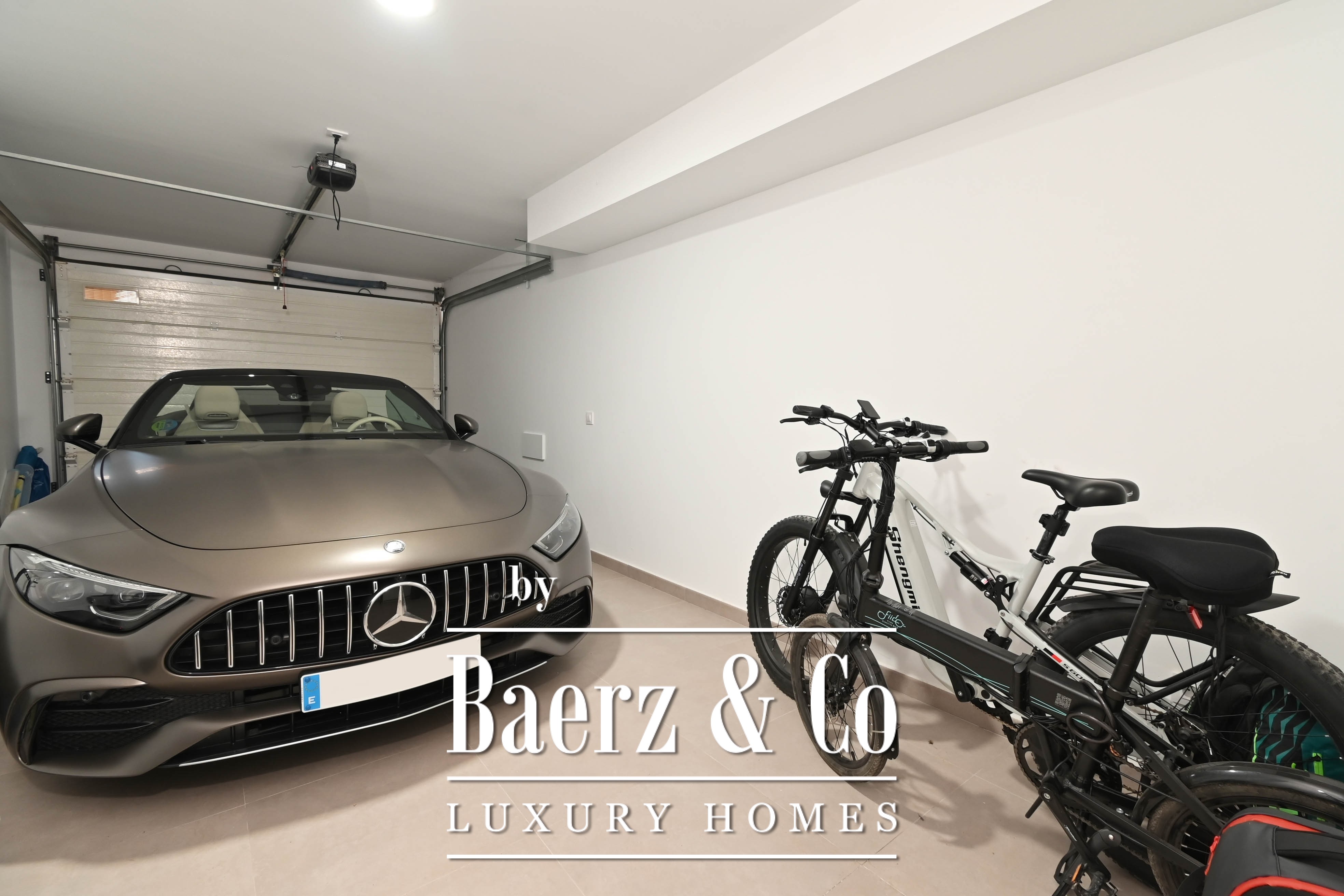 Five bedrooms unfold across the home’s two levels, three bathrooms detailed with a discerning eye. The master suite enjoys the privilege of direct access to a sun terrace that hosts a private jacuzzi, a secluded spot to pause above it all. On the lower level, a bar lounge offers scope for entertaining or quiet retreat, with flexibility for a fitness area if desired. Thoughtful utility continues in the garage with secure storage.
