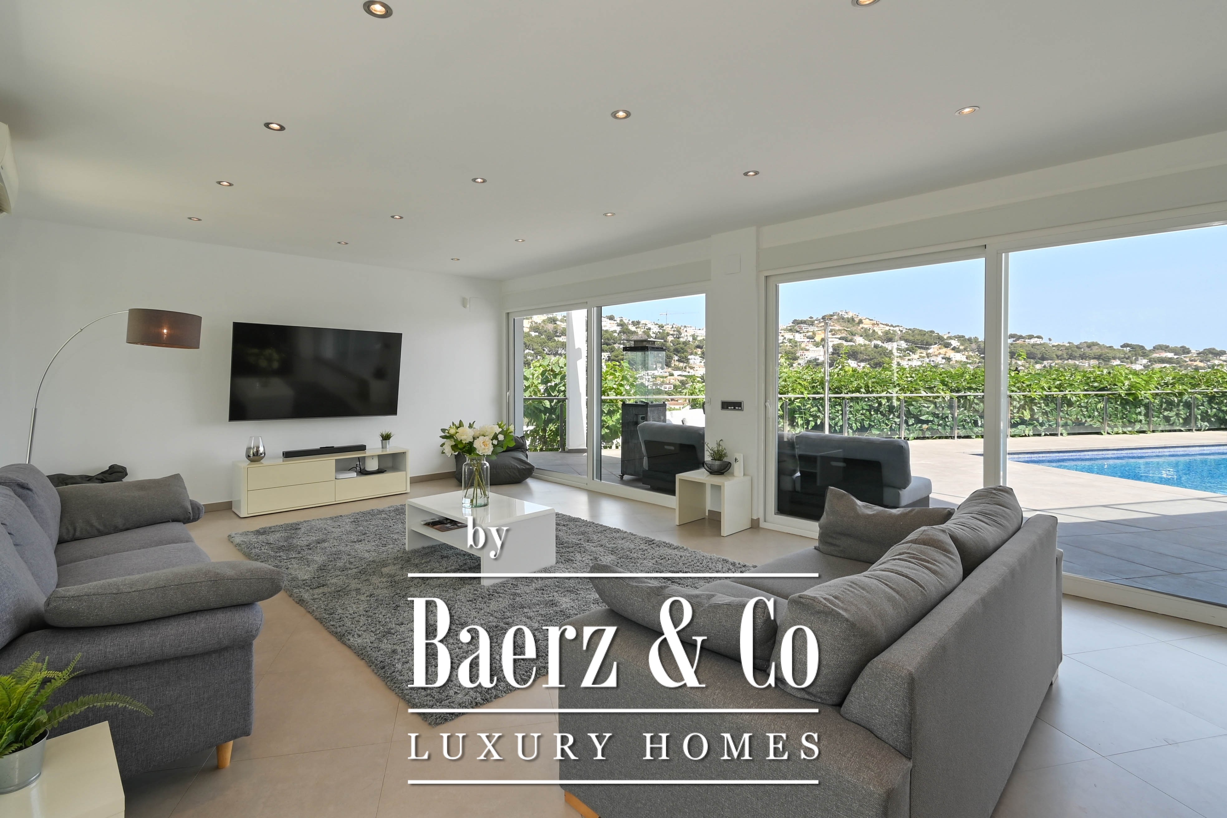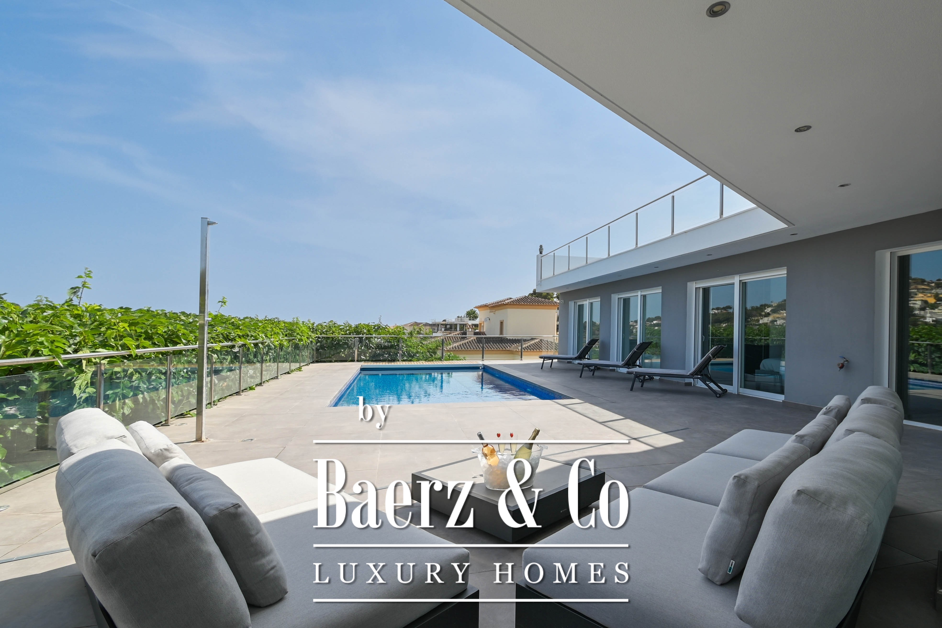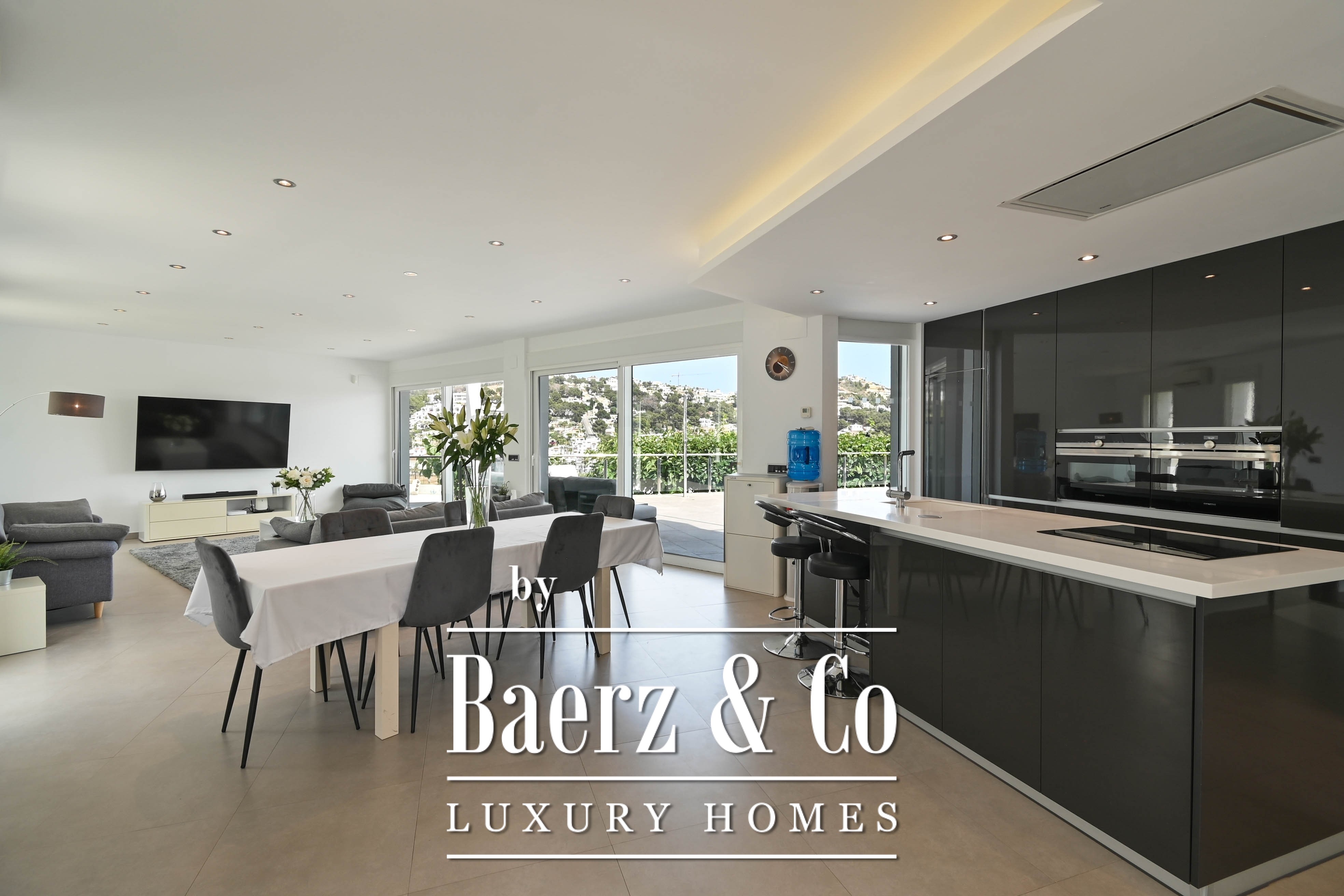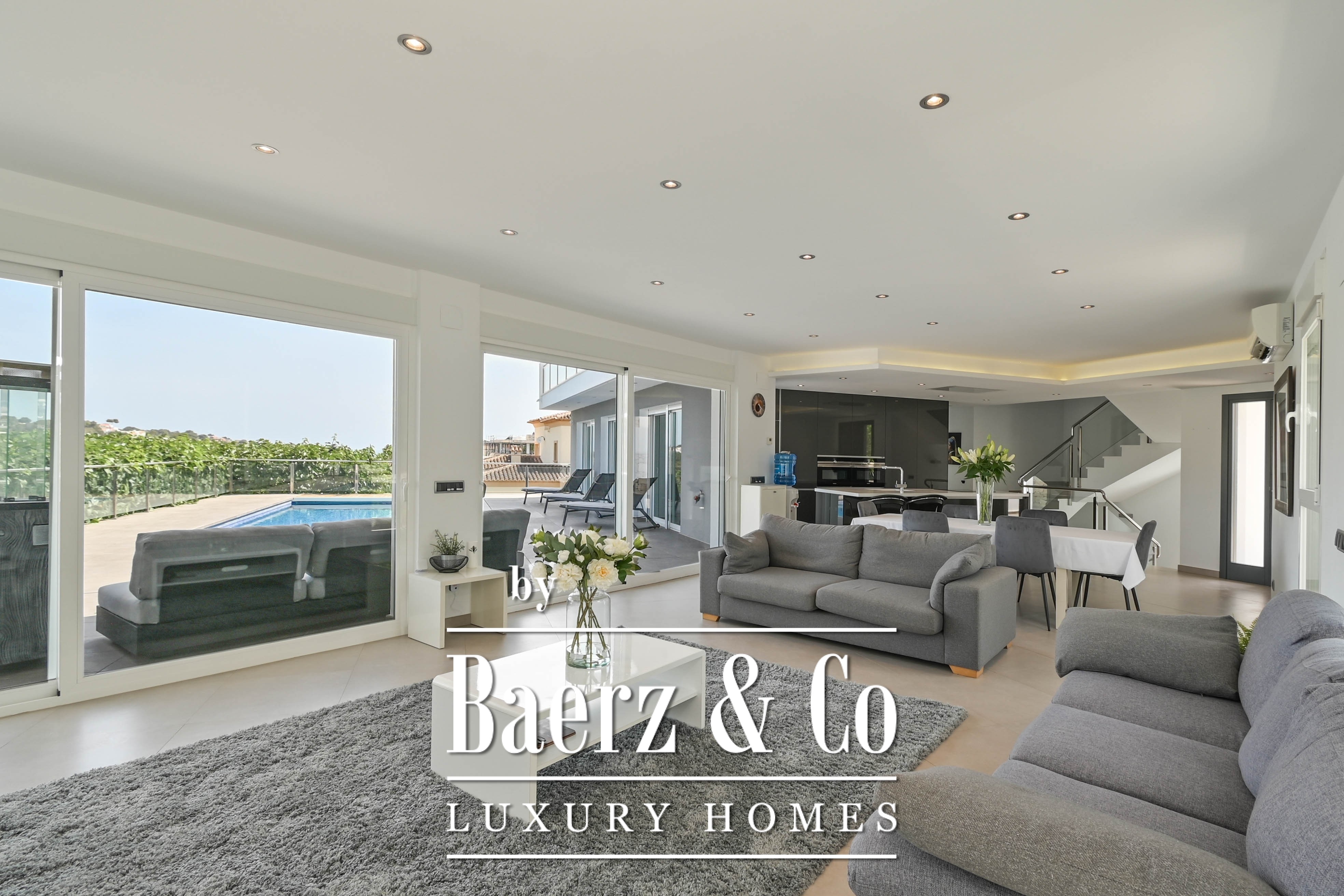 Villa Moraira invites you into 430 m² of thoughtfully structured space on an 816 m² plot, where contemporary design meets Mediterranean rhythm. This villa Moraira stands in Sol Park, close to the centre yet quietly enveloped by residential serenity, and offers a sense of openness intensified by generous light. Walls of glass blur the boundaries between interior and terrace, allowing the living area and open kitchen with central island to breathe and connect seamlessly to the outdoor pool and shaded lounging spaces.