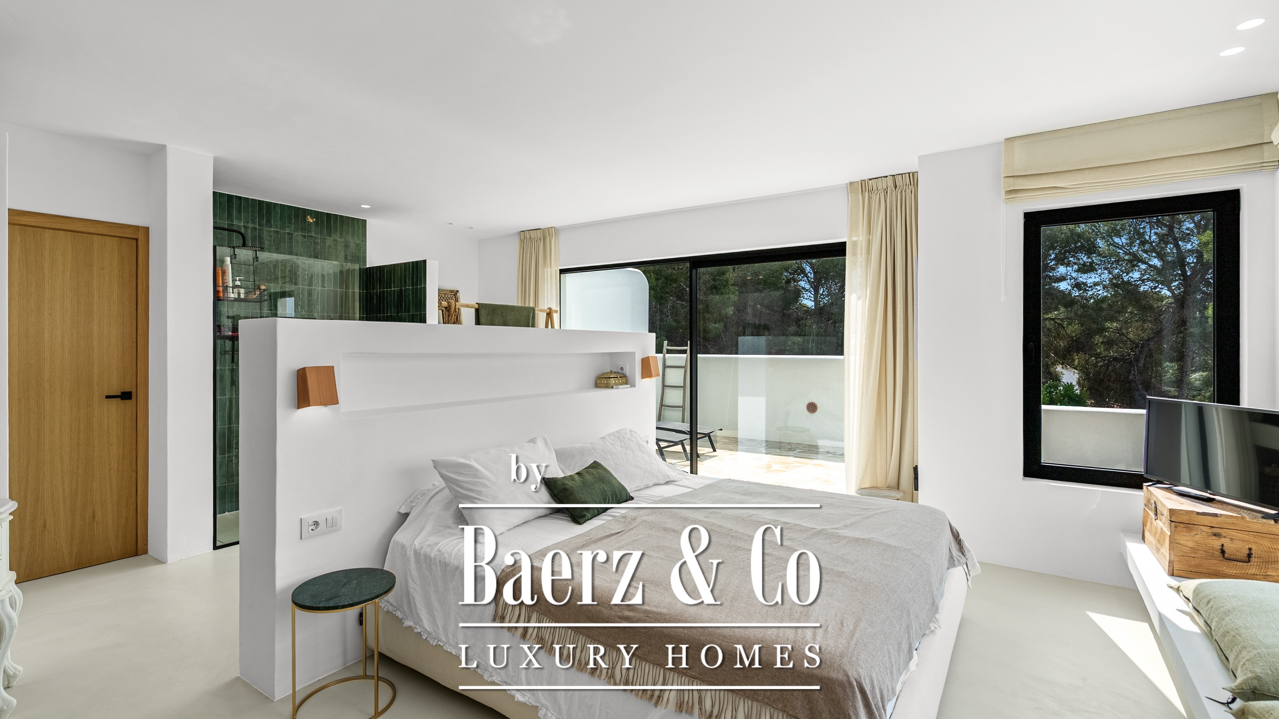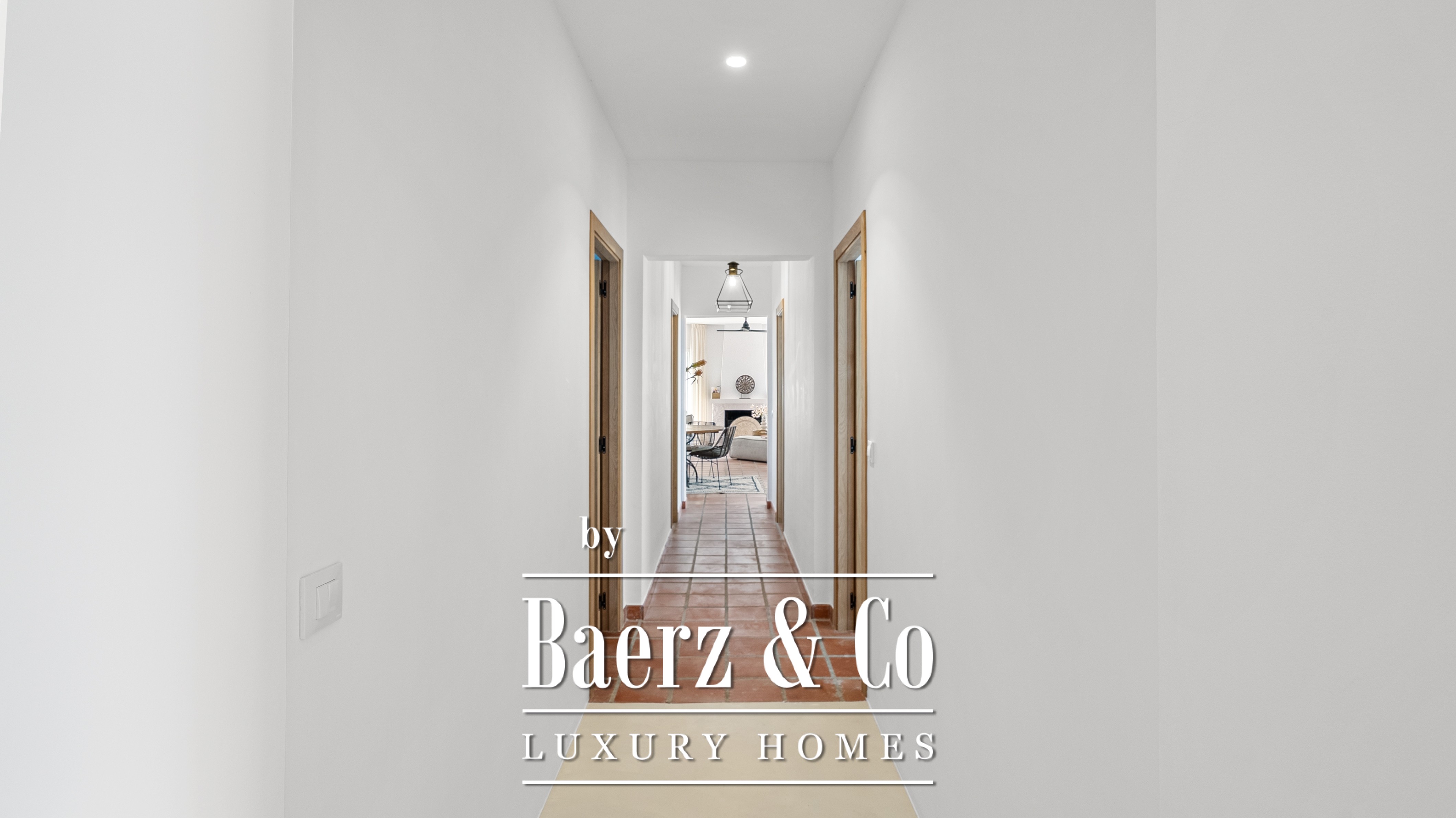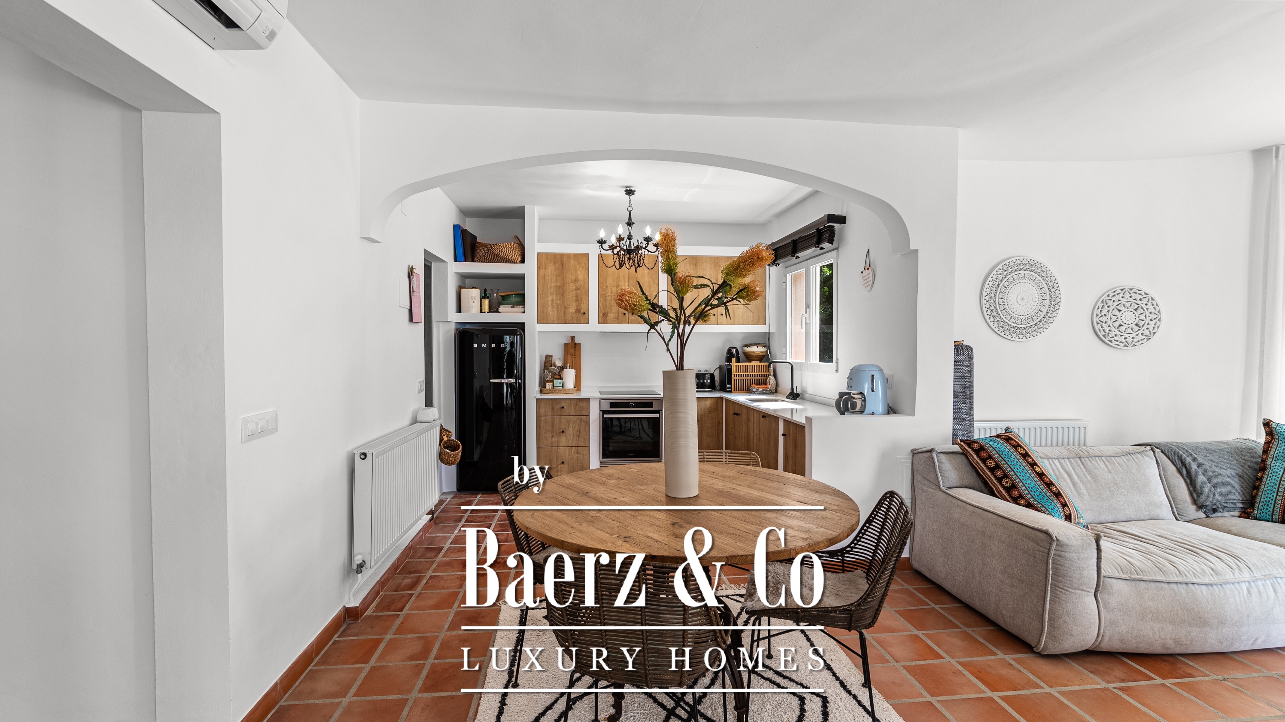 The open kitchen, seamlessly linked to the living area, creates an inviting rhythm of interior and exterior living. Natural light is ever-present, fostering a setting where daily rituals feel elevated. Doors unfold to a terrace that captures the pulse of outdoor Mediterranean life, ideal for long afternoons and evenings spent with family or guests.