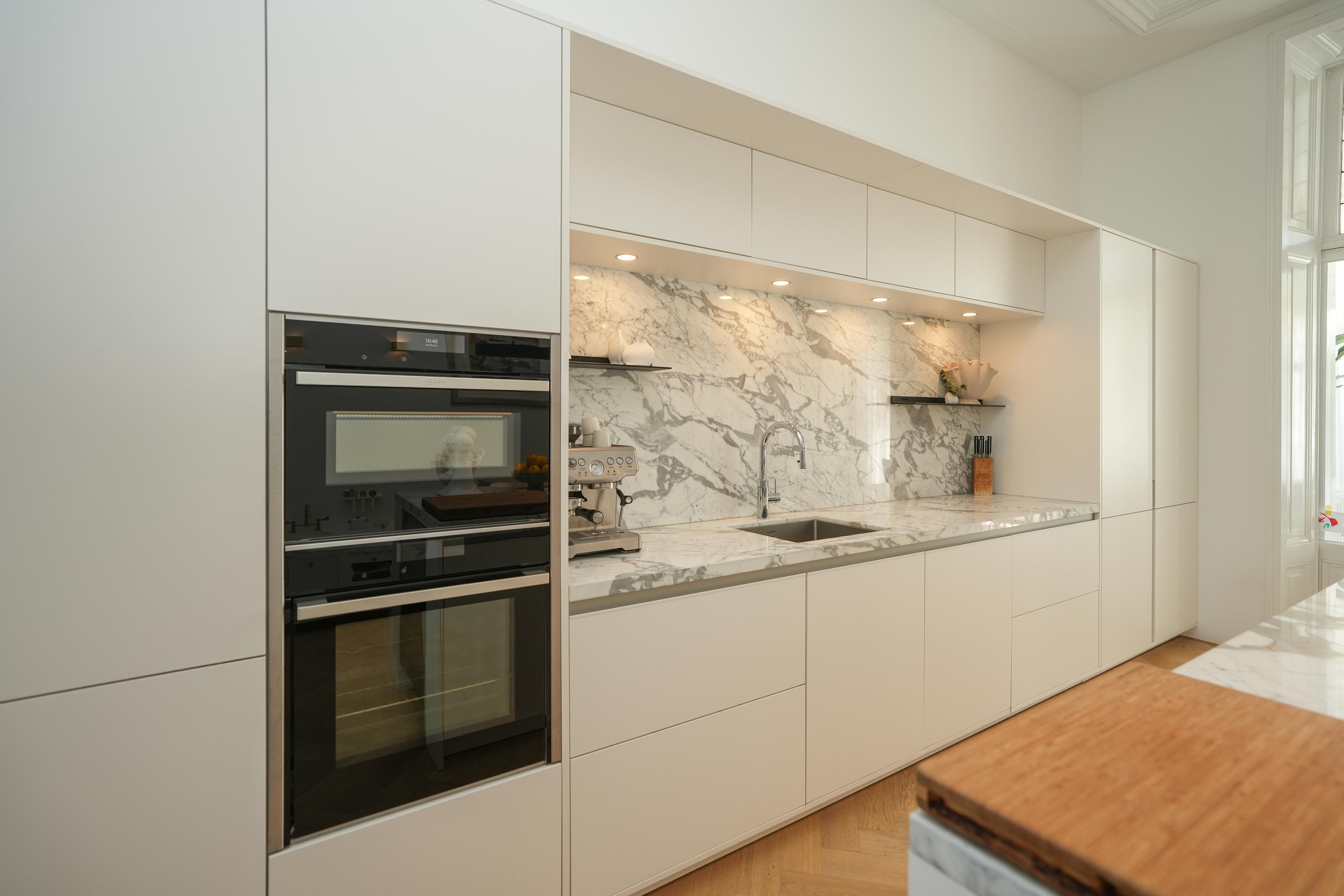 The stately double front door opens onto the vestibule, which leads to the hall with the staircase and access to the basement, the modern toilet with washbasin, the living room at the front and the dining room/kitchen at the rear. The bright living room en suite has beautiful built-in cupboards next to the en suite doors and an attractive fireplace. The modern open-plan kitchen with cooking island and bar is equipped with luxury built-in appliances (Neff), including a wine climate cabinet, Bora induction hob with built-in extractor, two ovens and a Quooker with boiling, chilled and sparkling water. Adjacent is the dining room with a fixed bench that is elegantly incorporated into the interior. The en-suite doors in the kitchen provide access to the spacious and bright conservatory with French doors to the sunny back garden. There is also a back door in the dining room. The living room, dining room and kitchen have underfloor heating.