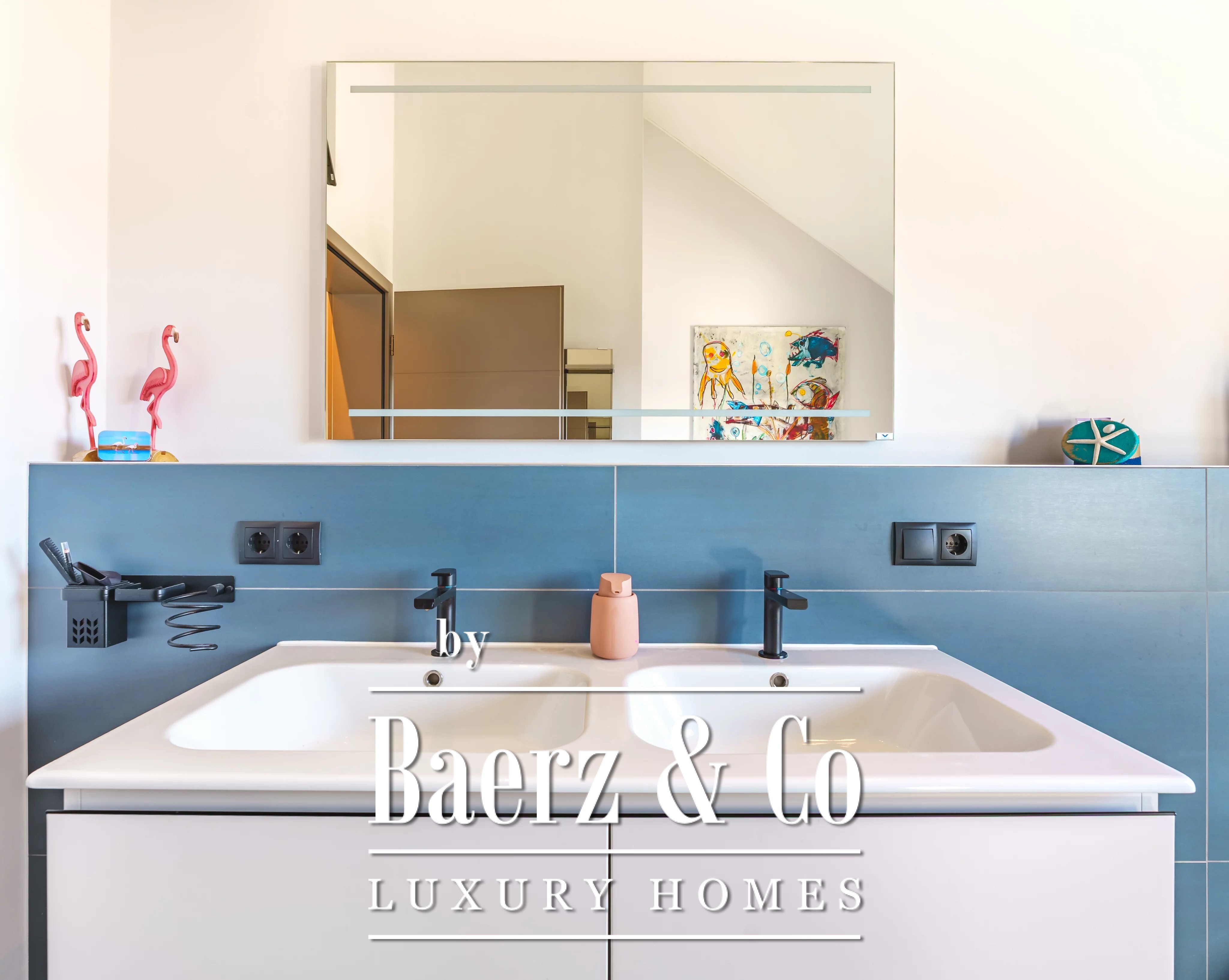 Upstairs, an additional living room creates a private retreat for family gatherings. There are five bedrooms and four bathrooms, including a master suite with a dressing room, private shower room, and a guest bedroom with en-suite. The laundry room is discreet and efficient, supporting daily comfort.