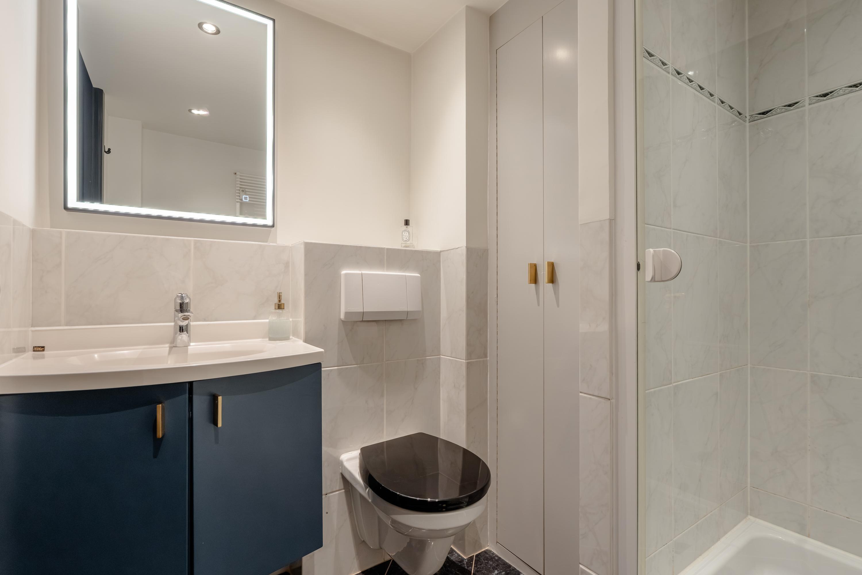 Inside, the apartment has been finished to a high standard with great attention to detail. Clean lines, a calm palette, and high-quality materials create an interior that feels instantly welcoming. The black floor-to-ceiling doors add a distinctive and elegant touch, evoking a subtle boutique hotel atmosphere.