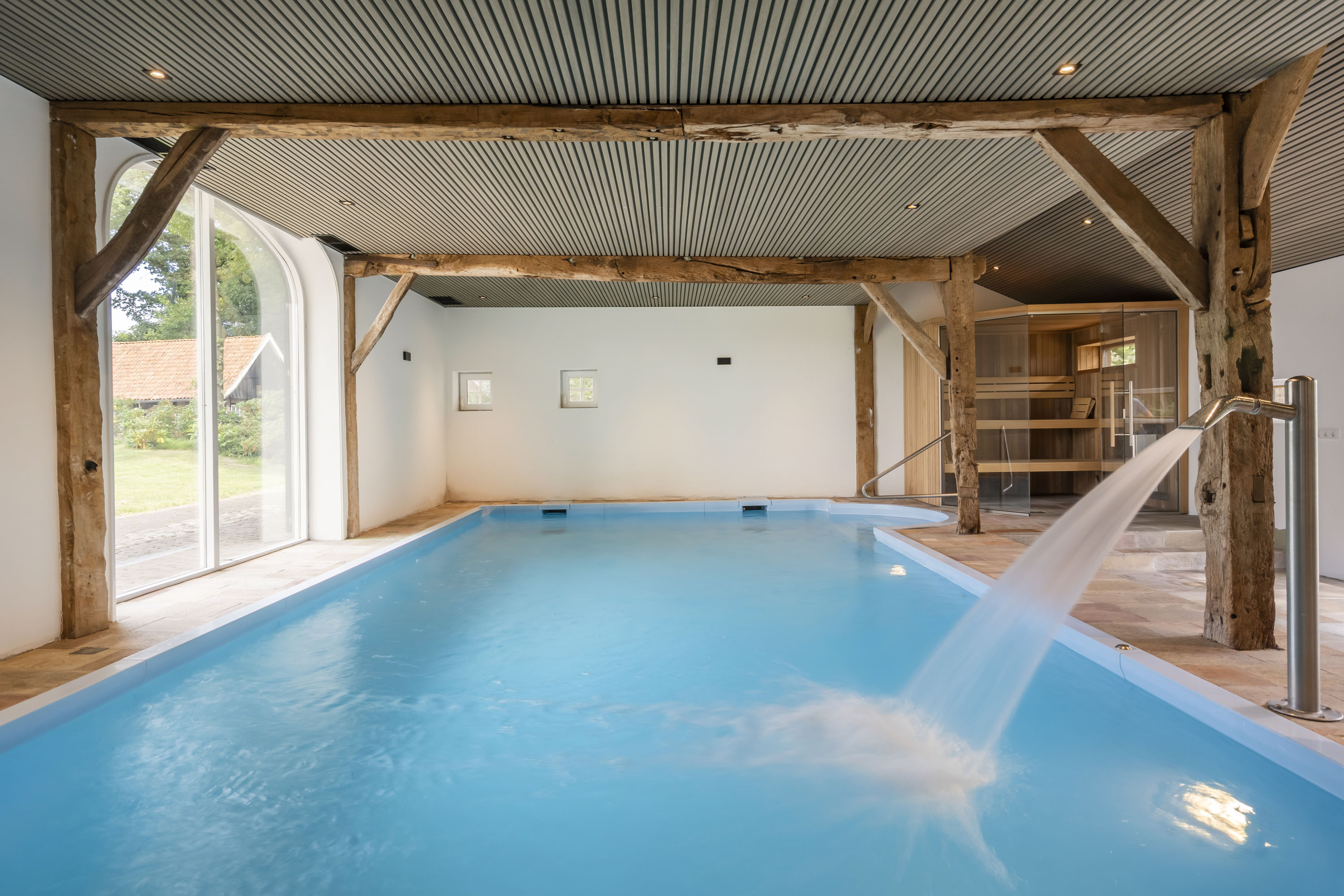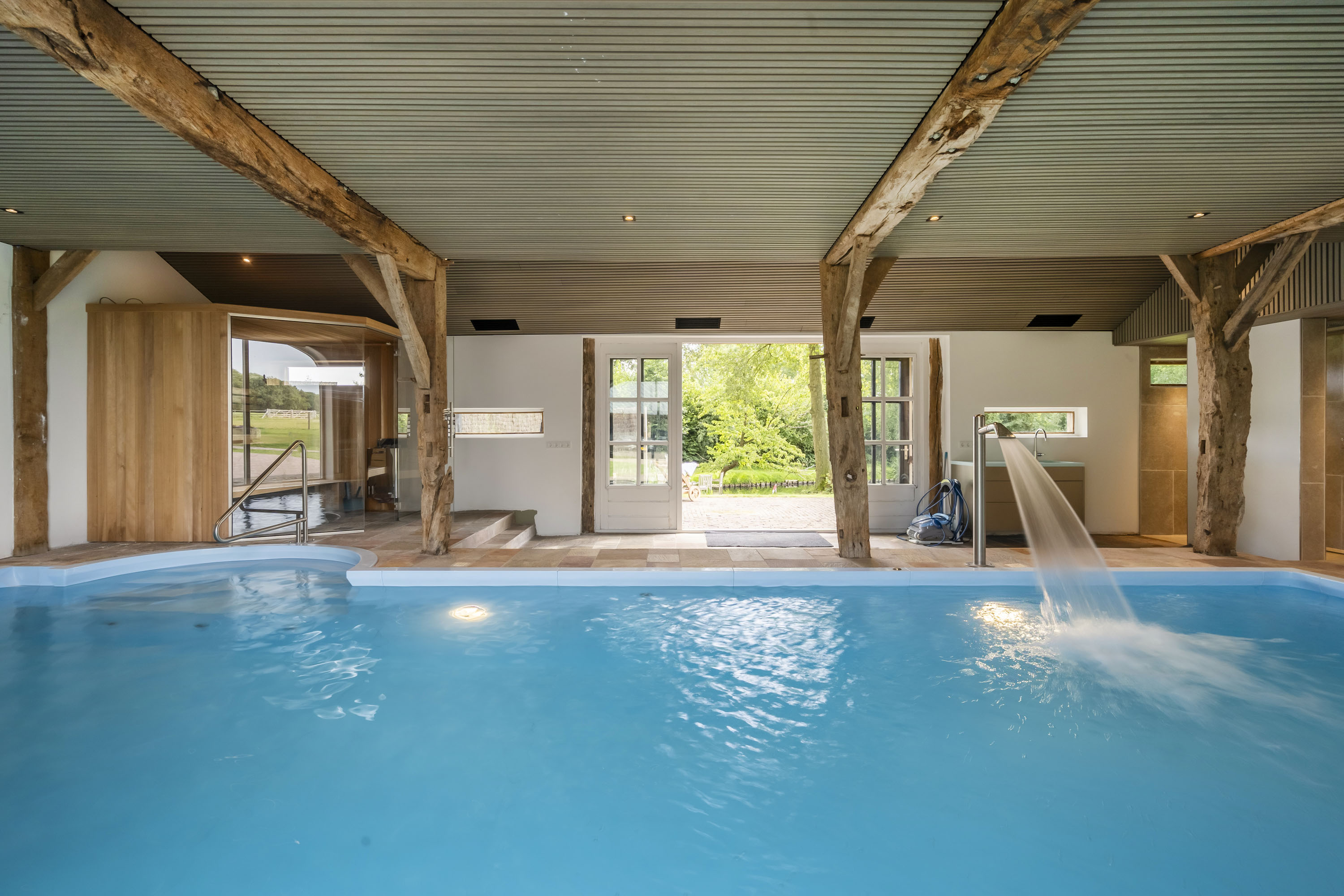 A charming outbuilding serves as an oasis of relaxation. It houses a large indoor swimming pool, luxury sauna and exclusive shower and changing area. As the cherry on top, there is a jacuzzi on the adjacent outdoor terrace — the perfect setting to relax or welcome guests in exclusive style. The upper floor of this building offers the potential to create a guest apartment.